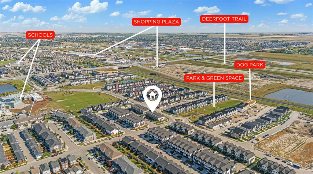 Welcome to this beautifully maintained east-facing No-Condo Fee townhouse offering 3 bedrooms, 2.5 bathrooms, and located in the highly sought-after South Point community in SW Airdrie. Step inside to a bright and welcoming living room with large east-facing windows that fill the space with natural light. The open-concept layout flows seamlessly to the rear kitchen, featuring a central island, ample cabinetry, and stainless steel appliances. Positioned at the back of the home, the kitchen overlooks the backyard and offers direct access, making it both functional and inviting. The main floor is completed by a dining area, a convenient mudroom, and a 2-piece bathroom. Upstairs, the primary bedroom features a walk-in closet and a private 4-piece ensuite with a standing shower. Two additional well-sized bedrooms, a 4-piece main bathroom, a versatile den and upper-floor laundry complete this level. The unfinished basement comes with rough-ins for a future bathroom, offering great potential for customization. Outside, enjoy the convenience of a 2-car rear concrete parking pad. Located in the vibrant South Point community, you’ll have access to parks, playgrounds, basketball and tennis courts, an off-leash dog park, and a scenic pond. An elementary school is just steps away, and a nearby commercial plaza features Sanjha Punjab, Starbucks, daycares, and more. With quick access to Deerfoot Trail, you’re approximately 20 minutes from YYC Airport and 25 minutes to downtown Calgary. Major amenities such as Costco, CrossIron Mills, Genesis Place, Walmart, Co-op, pharmacies, and restaurants are all just a short drive away. Don’t miss this opportunity to own a beautiful home in a growing community. Book your showing today.