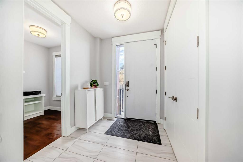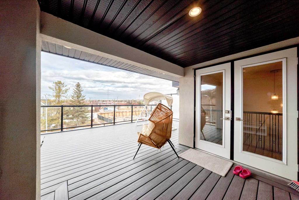 Stunning Bow River Views | 5BD/5BA | Massive Balcony | 2,640 SF + Fully Finished Basement Design. Location. Luxury. Set on a sunny south/west-facing corner lot just minutes from the Bow River pathways, Shouldice Park, and Market Mall, this 3-storey contemporary semi-detached home offers refined inner-city living with exceptional natural light from oversized windows on three sides.The main level features 9’ ceilings and a bright, open layout built for entertaining—anchored by a sun-filled living room with custom drapery and a sleek gas fireplace framed in premium quartz. A dedicated office with custom built-ins makes working or studying from home effortless. At the heart of the home, the chef-inspired kitchen showcases stainless steel appliances, modern cabinetry, quartz countertops, a striking waterfall island, and a full pantry, flowing seamlessly into the dining area with floor-to-ceiling windows and French doors to the rear deck for easy indoor-outdoor hosting.Upstairs, you’ll find a thoughtfully placed laundry room, two generous secondary bedrooms, and a 4-piece bath. The primary retreat is a true sanctuary with a custom walk-in closet and a spa-like ensuite featuring double vanities, a luxury steam shower, and a modern tub. Step out to the large composite balcony with glass railings—perfect for evening sunsets and enjoying the river-bank setting.The third-floor loft adds incredible flexibility with bonus living space, luxury vinyl plank flooring, and a full bath with a custom glass shower—ideal as a studio, lounge, or additional work-from-home space. Continue outside to the massive roof deck with glass railings and upgraded composite decking + drainage, offering a spectacular vantage point over the Bow River corridor. The fully finished basement is ready for movie nights and gatherings, featuring a family/media room with a stylish wet bar, plus a large fourth bedroom with an oversized walk-in closet and a full bath—perfect for guests or teens. Year-round comfort is enhanced by in-floor hydronic heating, and a water softener adds everyday convenience.Outside, enjoy a fully fenced yard, glass-railed rear deck, and a detached double garage off the paved lane. The corner-lot location also provides excellent additional street parking for visitors.Live moments from parks, playgrounds, river pathways, cafés, top commuter routes, and quick access to Foothills & Alberta Children’s Hospitals, U of C, and Downtown—with the Rockies within easy reach. This is Montgomery at its finest—inner-city energy with nature at your doorstep. Book your private showing today!