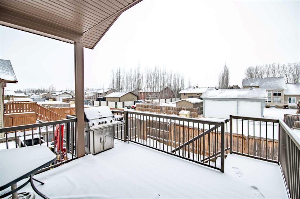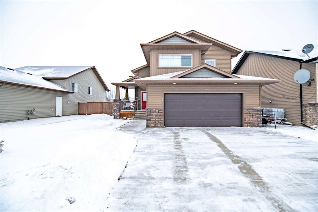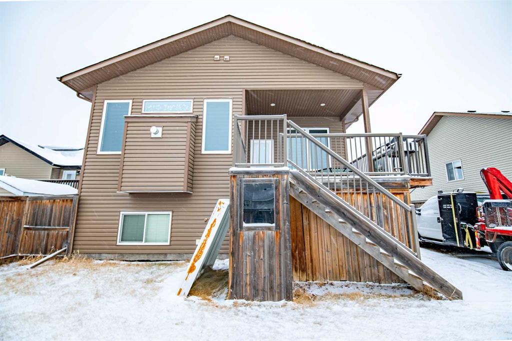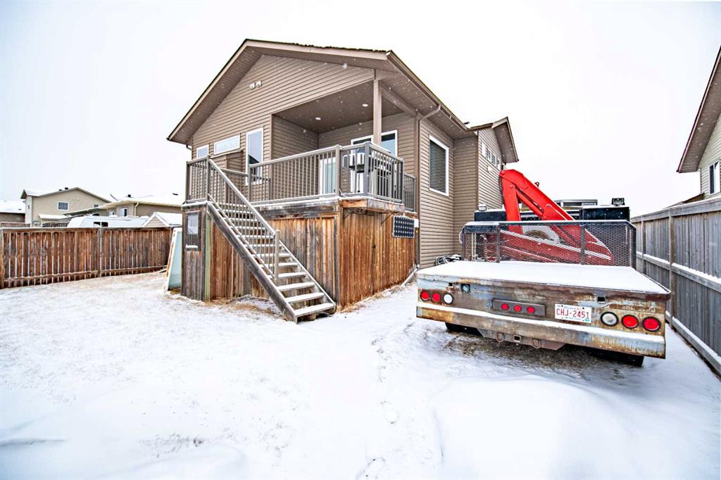 Nestled on a quiet crescent in one of Lacombe's well-established neighbourhoods, this charming 1½ storey home offers a functional and inviting layout with quality finishes throughout. The main floor welcomes you with a bright living room featuring a striking feature wall and a cozy fireplace with beautiful stone surround. Natural light flows generously through the home, creating an airy and comfortable atmosphere. The kitchen is a standout space, thoughtfully designed with ample workspace and easy access to the partially covered back deck that offers a gas hookup for a BBQ. Gas stove top with electric double ovens and dishwasher 4 years old. Two bedrooms are located on the main floor, with the spacious primary suite on the upper level, complete with a large walk-in closet and private ensuite. The fully developed basement with 9 ft ceilings adds excellent versatility, offering two additional bedrooms, a full bathroom, dedicated laundry/utility room, and a storage room. The impressive wet bar makes this lower level a natural gathering space, and in-floor heat throughout ensures year-round comfort. Outside, the large heated double attached garage provides convenient parking and storage. The backyard is a practical featuring dedicated RV parking with a 50-amp hookup and the added benefit of an extra-wide back alley for easy access. Additional features include central air conditioning and central vacuum. A meticulously well kept home home offering space, comfort, and standout amenities. This home is ready to welcome its next family.