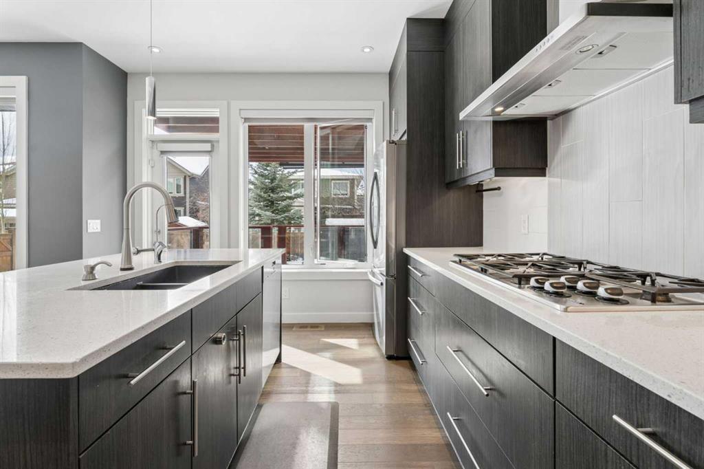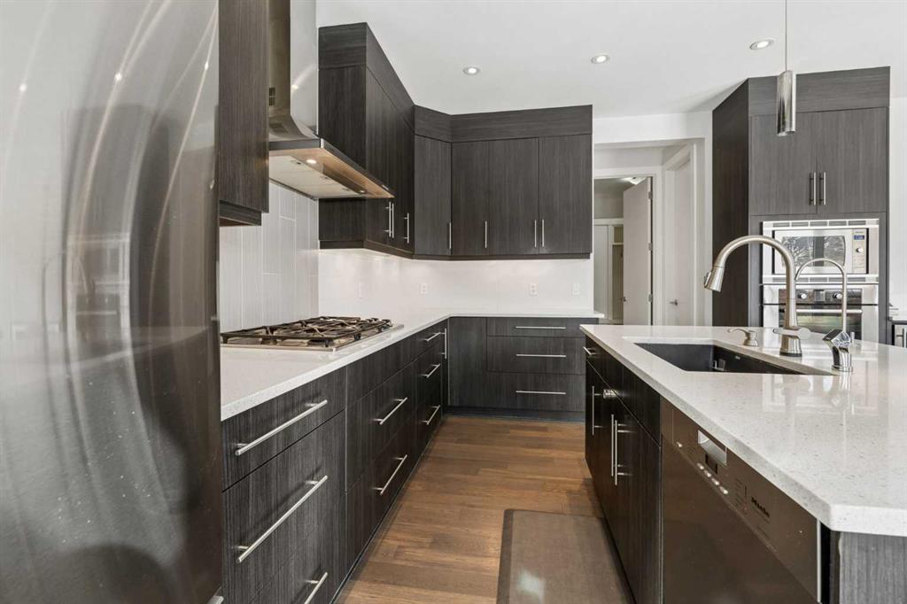 Beautifully positioned on a quiet crescent in Aspen Dale, this exceptional family home offers approximately 3,523 sq ft of refined living space across three fully developed levels. Built by Crystal Creek Homes, the residence features 4+1 bedrooms, an ideal layout for families, and is move-in ready. With its desirable east/west orientation, the home is filled with natural light from morning to evening, creating a warm and inviting atmosphere. The main level showcases 9’ ceilings, wide-plank hardwood flooring, designer lighting, custom window coverings, and quartz countertops throughout. The chef-inspired kitchen is the heart of the home, complete with a large central island with breakfast bar, stainless steel appliances, gas cooktop, and wall oven. A bright dining area overlooks the backyard, and a private home office provides the perfect work-from-home space. Upstairs, the spacious primary retreat features a luxurious 5-piece ensuite with quartz finishes and a generous walk-in closet. Three additional bedrooms—each with their own walk-in closets—share a well-appointed 5-piece bathroom. The fully finished lower level expands your living space with a large recreation and games area, a stylish wet bar with bar fridge, a dedicated fitness space, a fifth bedroom, and a full bathroom with heated floors—ideal for guests or extended family. Outdoors, the beautifully landscaped yard offers multiple spaces to relax and unwind. Enjoy your morning coffee on the private front porch, and take advantage of the west-facing backyard with mature trees—perfect for sunny afternoons, evening gatherings, or children at play. Completing the package is an exceptional location—just a short drive to Rundle College, Westside Recreation Centre, and the 69 Street CTrain Station, and close to downtown. It also offers quick access to Webber Academy and the amenities at Aspen Landing Shopping Centre, plus convenient routes for weekend escapes to the mountains. Discover this home—schedule your private viewing today.
