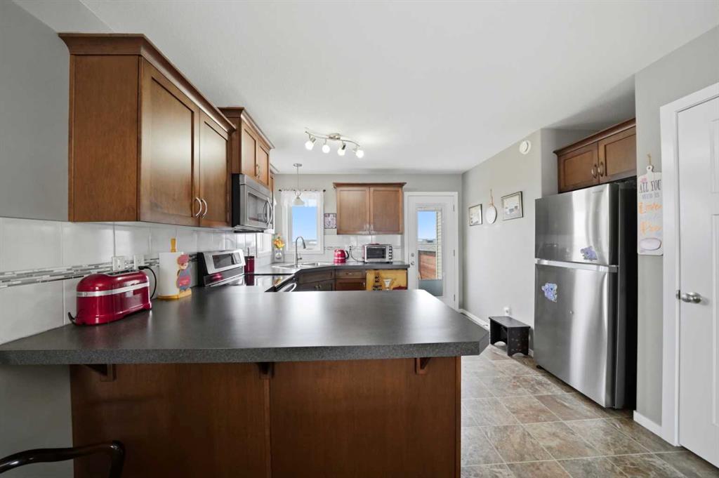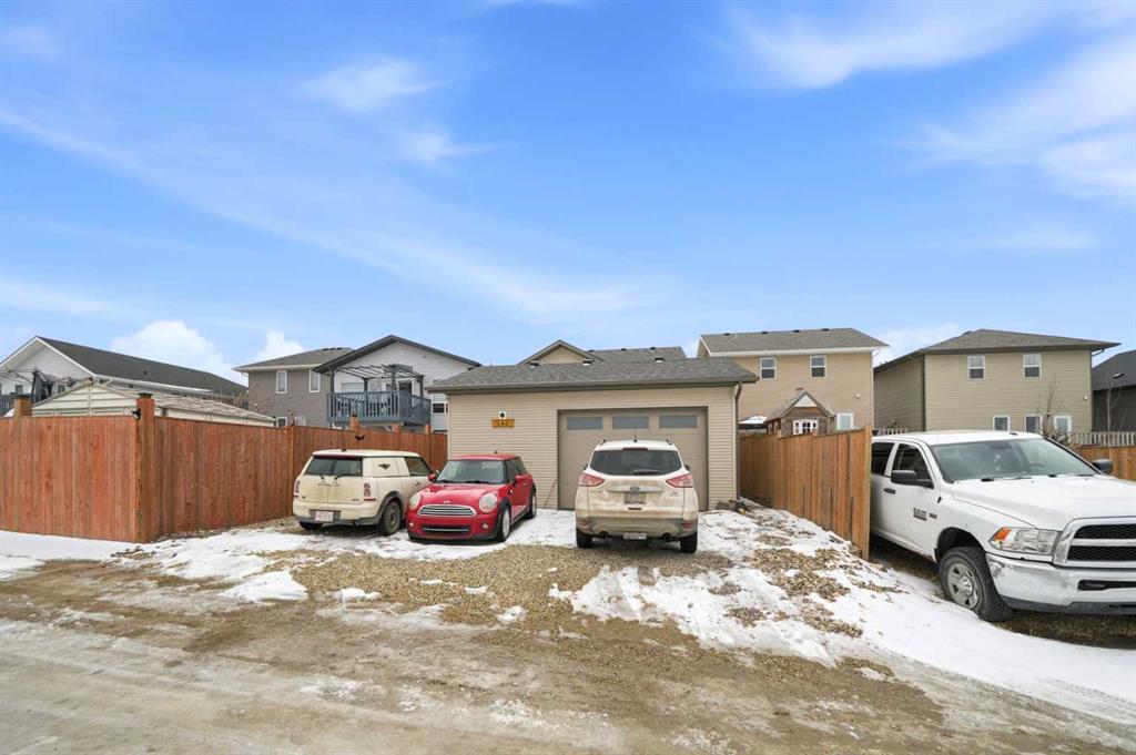 Welcome to 146 Truant Crescent, nestled in the vibrant and quickly growing community of Timber Ridge. This family-friendly neighborhood offers everything you need within minutes — excellent schools, groceries, coffee shops, restaurants, parks, and more. Enjoy the quiet, tucked-away location with minimal traffic and a strong sense of community. From the moment you arrive, you’ll appreciate the low-maintenance yard, well-kept exterior, and charming front porch. Step inside to a spacious front foyer with a convenient coat closet, leading up a short flight of stairs to the bright and open main floor. The main level features wall-to-wall laminate flooring in a warm natural tone, complementing the U-shaped kitchen with dark, gleaming countertops, a brand-new stove, large refrigerator, and a microwave hood fan that vents outside. A picturesque window above the sink and the open-concept layout make this space perfect for hosting guests or keeping an eye on children. Just off the kitchen, step onto the raised deck and imagine summer evenings spent relaxing or entertaining. Down the hall, the primary bedroom offers generous space, double closets, and a private 4-piece ensuite. A second well-sized bedroom and another full bathroom complete the main floor. The bright walkout basement is a standout feature, offering large windows and incredible versatility. A second fully equipped kitchen makes this level ideal for extended family, visiting guests, or older children wanting more independence. Two additional bedrooms and a third full bathroom — featuring a brand-new contemporary shower — provide even more flexibility. The laundry area is conveniently located in the utility room, with extra storage just across the hall. Finally for those winter months and energy bill savings., in-floor heat is the cherry on top. Outside, the covered lower patio leads to a large storage shed, concrete pad, and access to the double detached, finished garage — perfect for parking, projects, or hobbies. Additional off-street parking behind the garage is an added bonus. This well-maintained home offers comfort, flexibility, and a fantastic location in one of Red Deer’s most desirable growing communities.