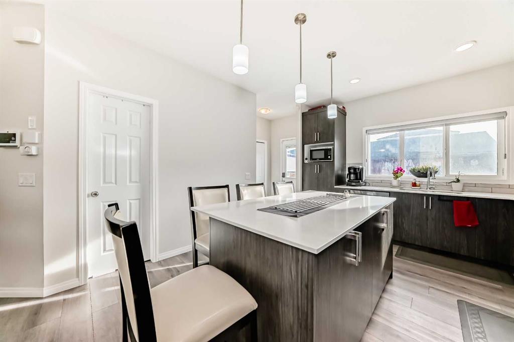 Welcome to this stunning corner lot home with a charming front porch, ideally positioned facing a peaceful green space with no front neighbors—offering exceptional privacy and tranquility—in the sought-after Mahogany community. The main floor showcases durable and stylish Luxury Vinyl Plank (LVP) flooring throughout and features a bright, open-concept layout perfect for modern living. At the heart of the home is a chef-inspired kitchen complete with a large island that doubles as a dining table, an electric cooktop with built-in hood fan, refrigerator, microwave, and ample cabinetry. The kitchen flows seamlessly into the dining and living areas, making it ideal for both everyday living and entertaining. The upper level offers a spacious primary retreat with large windows overlooking the green space, a luxurious 4-piece ensuite featuring double undermount sinks, a glass-enclosed shower, and a generous walk-in closet. Two additional bright and well-sized bedrooms, another 4-piece bathroom, and a convenient upper-level laundry room with quartz countertops complete this floor. The fully finished basement with a separate entrance boasts 9-foot ceilings, luxury vinyl plank flooring for easy maintenance, one bedroom, a 4-piece bathroom, a dry bar, and extra storage—perfect for extended family or guests. Enjoy the low-maintenance fenced backyard with concrete throughout, designed for easy outdoor enjoyment. The property also includes a finished, oversized double garage—ideal for extra storage or hobby projects. Ideally located close to shopping, schools, playgrounds, tennis courts, parks, and Mahogany’s renowned beach access, this home offers comfort, functionality, and an unbeatable lifestyle. Don’t miss this exceptional opportunity—schedule your private showing today and experience everything this beautiful Mahogany home has to offer.