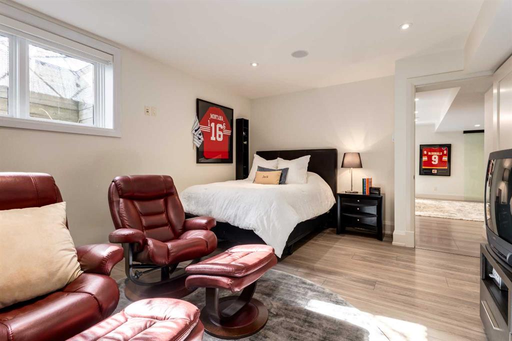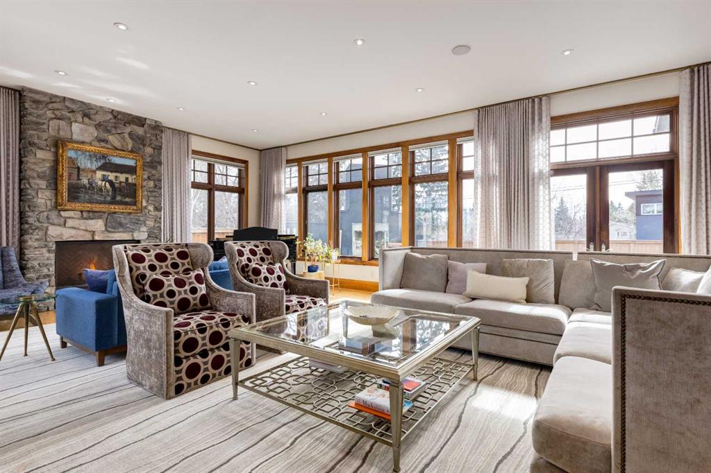 Occupying a rare double lot along Madison Avenue in the prestigious community of Elboya, this castle-inspired estate is defined by its striking stone façade and grand scale. Offering over 7,780 square feet of luxury, with six bedrooms, six full and two half bathrooms, the home is thoughtfully designed for elevated family living and exceptional entertaining. A spacious foyer welcomes you inside, while a private office with walnut built-ins and 21’ ft vaulted ceilings adds warmth and sophistication. At the heart of the home, the recently refreshed chef’s kitchen features new paint, lighting, and countertops, along with double walk-in pantries, an oversized island, dual dishwashers, wine fridge, and premium appliances including a 6-burner Wolf gas range, integrated Sub-Zero refrigerator, and built-in Miele espresso machine. The kitchen flows seamlessly into the informal dining area and expansive living room, where floor-to-ceiling windows showcase the south-facing backyard and provide direct outdoor access. The main floor is completed by a formal dining room with built-ins, a bedroom with walk-in closet and private ensuite, a thoughtfully designed utility room with skylights, sink, in-floor drain and dedicated A/C - ideal for a dog wash - and a stylish powder room. Upstairs, the primary retreat offers 13’ vaulted ceilings, south exposure, a luxurious 5-piece ensuite with steam shower and boutique-style walk-in closet. Two additional bedrooms each have their own ensuites and vaulted ceilings, while a turreted office captures downtown views. A large upper laundry room includes dual washers, dryer, sink, and extensive cabinetry. The recently remodelled lower level is designed for recreation and relaxation, complete with a golf simulator, 6-seater tiered theatre room, wine room, wet bar, and expansive games area. Two additional bedrooms with walk-in closets and private ensuite bathrooms provide ideal accommodations for guests or older children. A wood-panelled elevator seamlessly connects all three levels. Mechanical features include in-floor heating, dual furnaces, multiple boilers, hot water heaters, and new air-conditioning units. Car enthusiasts will appreciate the rare quad subterranean garage with epoxy flooring and snow-melt driveway. The south-facing backyard is built for year-round enjoyment, featuring a screened patio with built-in BBQ/prep space and overhead heater, wood-burning fireplace, seating area, gated dog run, and raised garden. A heated front walkway ensures seamless winter maintenance. Ideally located near picturesque Elbow River pathways and Stanley Park, this exceptional property offers a truly elevated lifestyle in one of Calgary’s most sought-after inner-city communities.