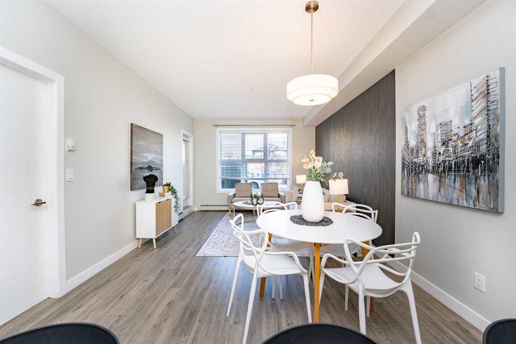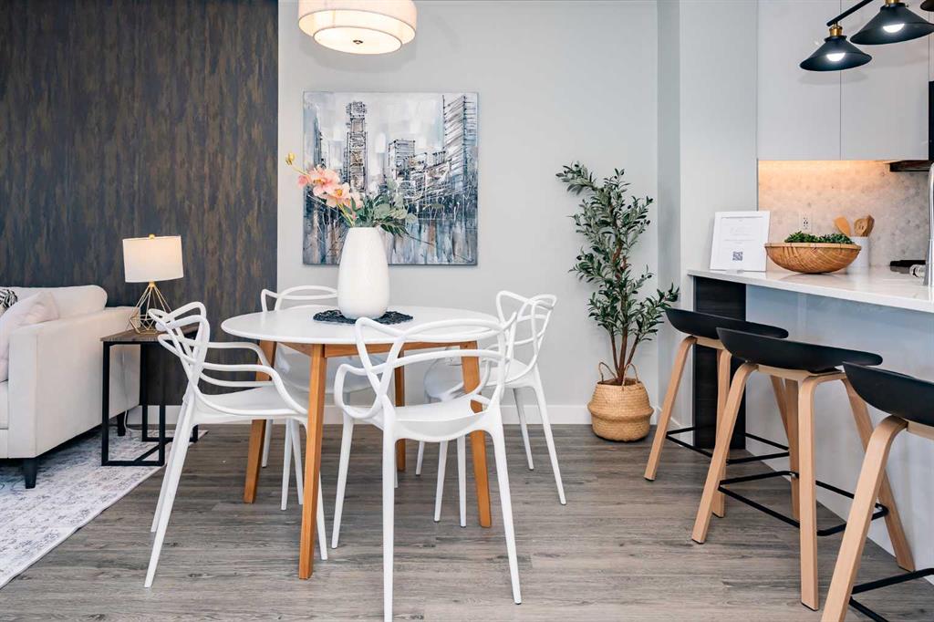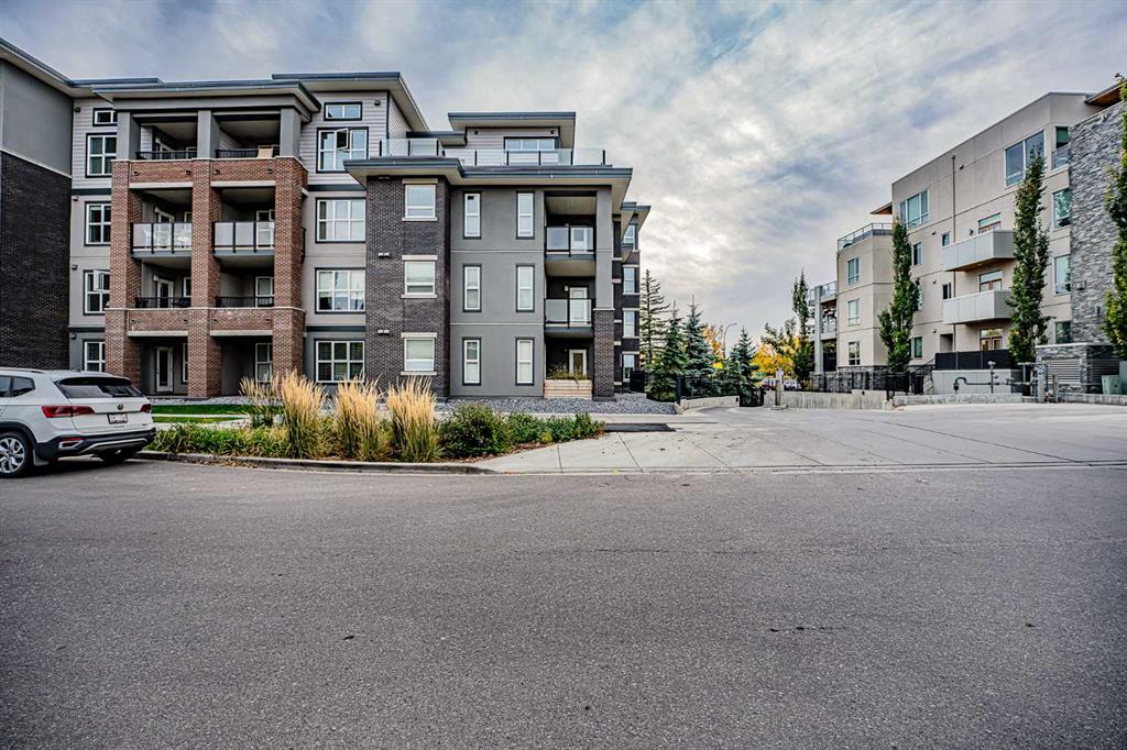 SHOWHOME for sale! Looking for a move-in ready home with premium upgrades? This might be the one. Welcome to the Axess building, located in the heart of the historic Currie Barracks community! This beautifully upgraded 1-bedroom ground-floor unit features 9-foot ceilings, luxury vinyl plank flooring, and a private patio with direct access to landscaped green space—perfect for morning coffee or evening relaxation. The modern kitchen showcases a stylish blend of white and dark cabinetry, upgraded stainless steel appliances including a gas stove, quartz countertops, and a designer tile backsplash. The spacious living room flows seamlessly to the patio, offering a great indoor-outdoor living experience. The primary bedroom features a walk-through closet with direct access to a 4-piece bathroom complete with quartz countertops, tile flooring, and a soaker tub. A versatile nook off the kitchen provides the perfect space for a home office or extra storage. Additional highlights include in-suite laundry, underground parking with a car wash, and a private storage locker conveniently located in front of your stall. All this in a prime location—steps from Mount Royal University, parks, shops, and walking paths, with easy access to Marda Loop and downtown via Crowchild Trail.