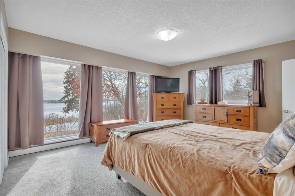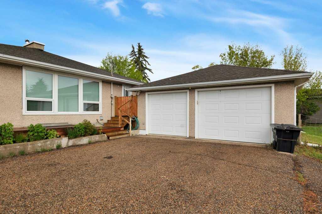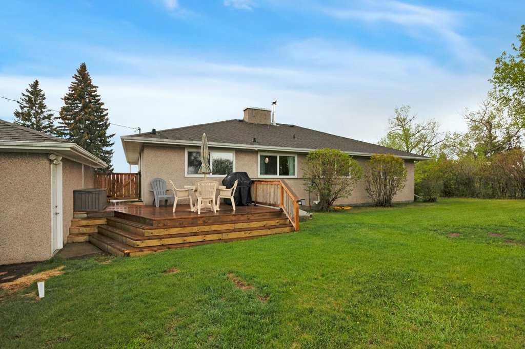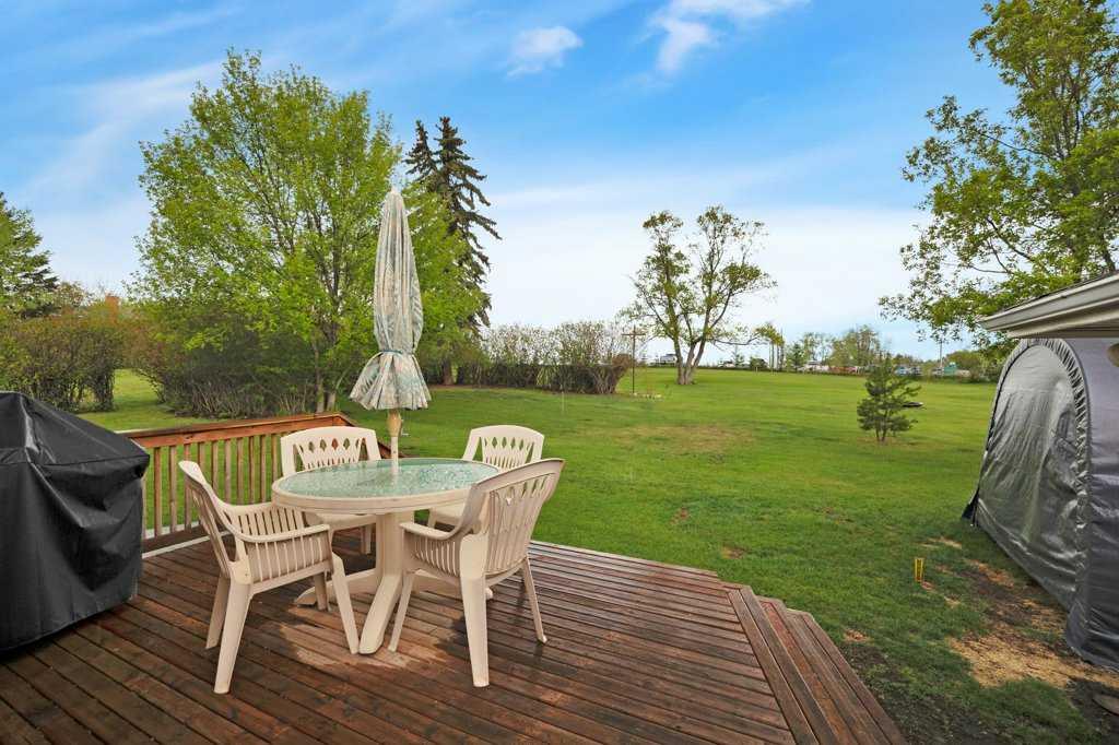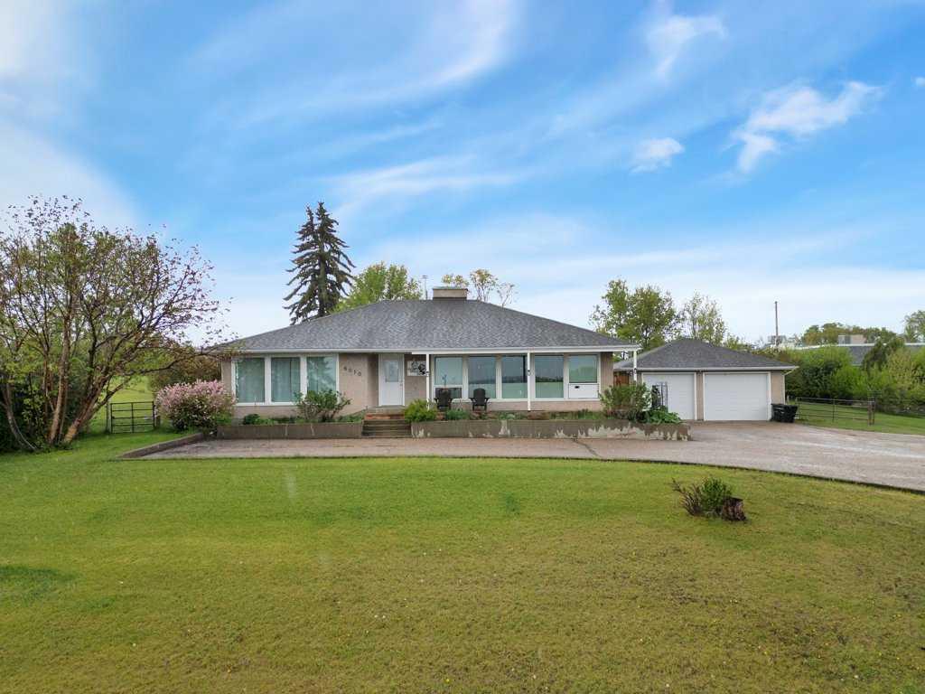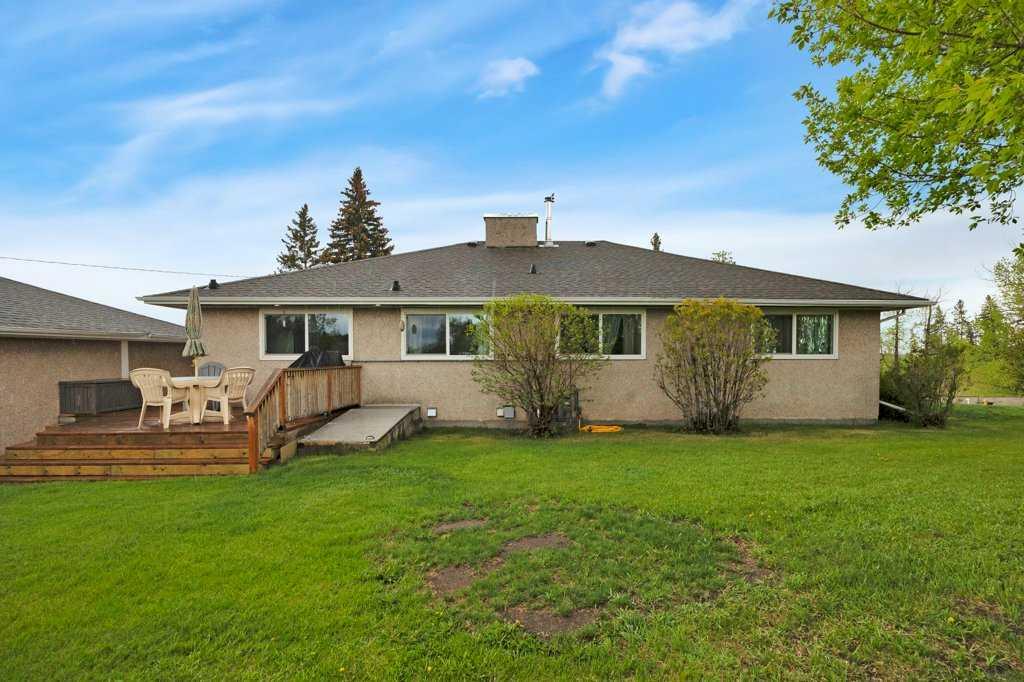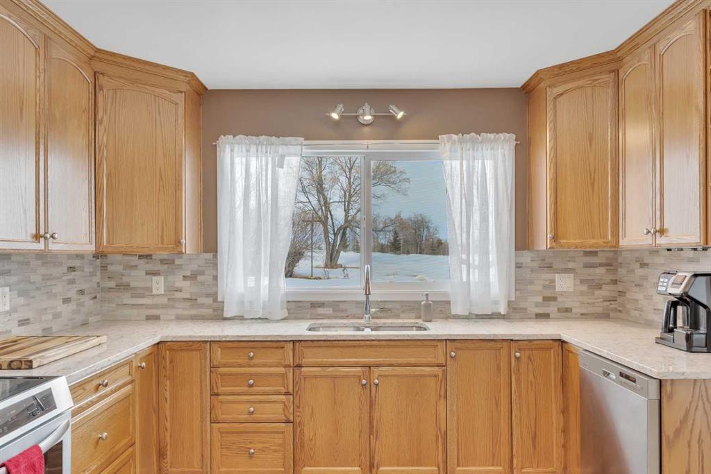 This place is a hole-in-one — perfectly teed up on top of the hill right beside the golf course. Sitting on 1.73 acres inside city limits, this fully renovated property is packed with upgrades that matter. Newer roof, newer electrical panel, full septic replacement (2023), zoned HVAC with independent climate control on each level, on-demand hot water, and added attic insulation. Move in knowing the big-ticket items are done. The main floor features a king-sized primary retreat with an upgraded ensuite, floor-to-ceiling vinyl windows that flood every room with natural light, new vinyl plank flooring and carpet throughout, custom blinds, and fresh paint top to bottom. The kitchen is clean and functional — ceiling-height cabinetry, quartz countertops, newer appliances including an induction range, and a large window over the sink framed by trees. Built-in shelving in the living room adds character and storage. Main floor laundry and a spacious mudroom with its own two-piece bath round out the everyday essentials. The lower level is fully self-contained. A large family room anchored by a cozy wood stove, two oversized bedrooms with above-grade windows, a full bathroom, a second living area, and cold storage. The full kitchen downstairs includes cabinetry for days, a stove, fridge, dishwasher, and pantry, with roughed-in laundry hookups ready to go. A lockable door between levels allows each floor to function independently — ideal for multi-generational living, extended family, or anyone who values flexibility and separation. Outside matches inside. A wraparound deck catches southern and eastern sun, while the fully fenced yard is lined with lilacs, raspberry bushes, and Saskatoon berries. Two gated access points, RV parking, an extended driveway, a heated double detached garage, and a storage shed give you room for every vehicle, project, and hobby. No one in front, no one behind — just open sky, golf course views, and your own patch of paradise. You're across from the ball diamonds, steps from a seasonal farmers' market, and two minutes to the clubhouse. Red Deer is under 20 minutes; Edmonton International about an hour. Space, privacy, updates, and a layout that works however you need it to. Don't wait — book your showing before someone else sinks it.