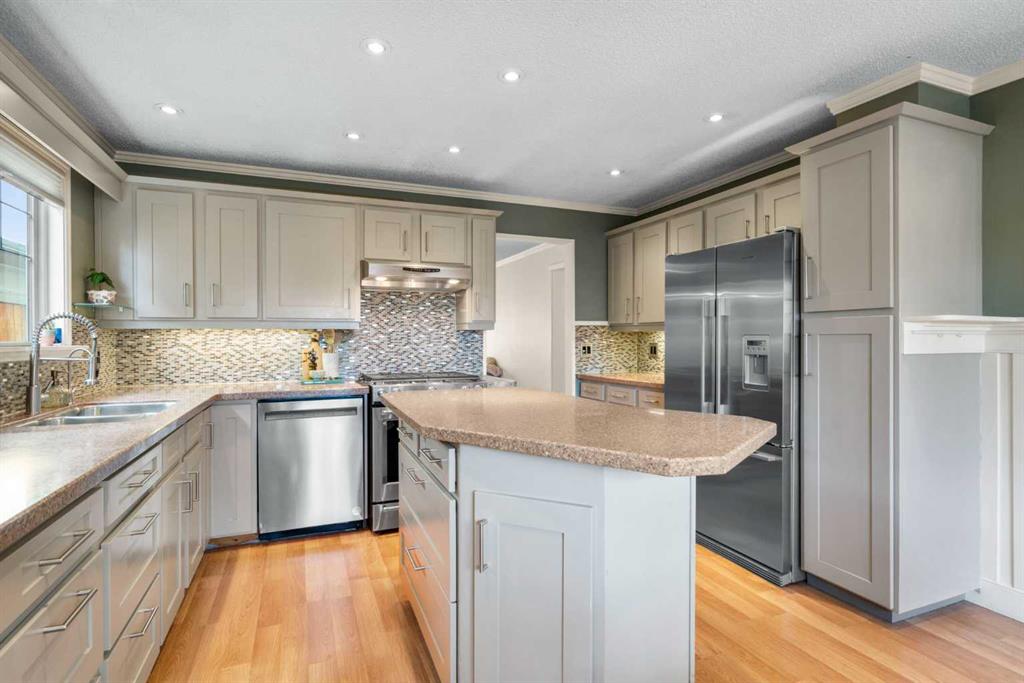 Welcome to this beautifully maintained two-storey home, ideally situated on a quiet, tree lined street in the highly sought after lake community of Midnapore. Offering over 1,780 sq ft above grade, 5 bedrooms, and 2.5 bathrooms, this home blends timeless character with thoughtful updates, and includes year-round lake access. Step inside to discover a bright and inviting front living room, where large windows fill the space with natural light. The heart of the home is the beautifully updated kitchen, featuring an abundance of custom cabinetry, stainless steel appliances, under-cabinet lighting, tile backsplash, stylish open shelving, space for your coffee bar, and a toe kick crumb catcher. The kitchen flows seamlessly into the dining area, complete with built-in features and a large window overlooking the space. At the rear of the home, a second living room offers a cozy retreat with a wood-burning fireplace, and classic wall panelling, perfect for relaxing evenings or easily reimagined as a formal dining space. A convenient 2 piece bathroom and a spacious pantry/storage room with 240V hookup complete the main level. Upstairs, you’ll find four generously sized bedrooms, including a bright primary suite with its own modern 3 piece ensuite. A full 4 piece bathroom serves the additional bedrooms, and newer upstairs windows throughout the home allow natural light to pour in from every angle. The fully developed basement expands your living space with a fifth bedroom (not an egress window), a large family room featuring a gas fireplace, and a versatile open area, ideal for a home gym, office, or flex space. Additional storage ensures everything has its place, plus laundry area with storage and workshop area for added functionality. Step outside into your sunny south facing backyard oasis, complete with extensive brickwork, mature landscaping, vibrant flowers, and a private setting perfect for relaxing or entertaining. The yard also offers a storage shed and access to the double detached garage. At the front of the home, a charming interlocking brick patio creates a welcoming first impression. Access to the pathway leading to Fish Creek Park is just steps away, so you can escape the city without leaving it. Located in one of Calgary’s most established lake communities, Midnapore offers exclusive lake access, year-round recreation, excellent schools, parks, and convenient access to shopping and transit. This is a rare opportunity to own a character-filled home in an unbeatable location!