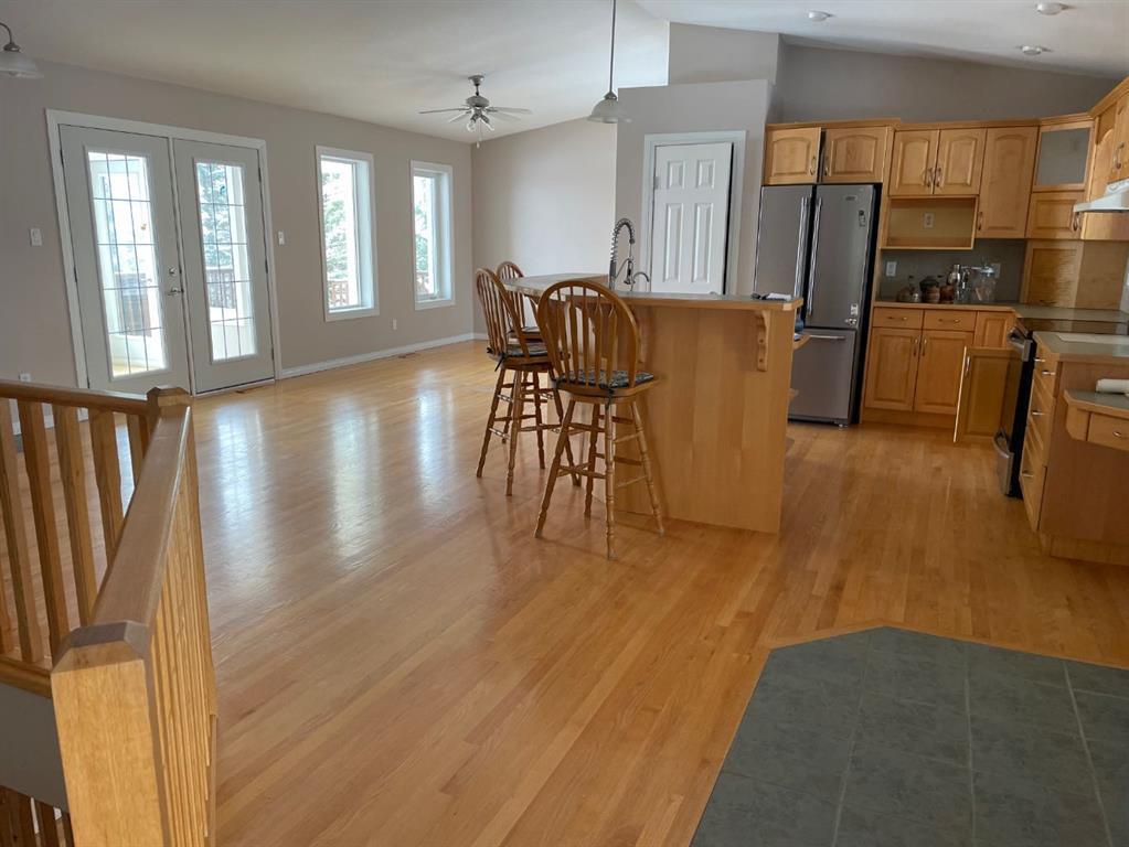 An acreage in Park Lake Estates (with Municipal Water!!) is available! This one owner walkout bungalow on 1.7 acres is ready for its' new owner to enjoy all it has to offer. The quality speaks for itself as the house was built with concrete block construction, has a metal roof and there are solar panels that make electricity bills very manageable and also underground sprinklers. There are two bedrooms up and two in the walkout level allowing for privacy for your family. Primary bedroom has door to patio overlooking the backyard. The enclosed sunroom offers you a great gathering spot being protected from the weather ... also would be awesome for gardeners starting their plants in the spring! The lower level has in floor heating, the main floor is heated by a forced air furnace. There's oak hardwood, wood parquet and ceramic tile flooring plus the floor plan is open concept in the living, dining and kitchen areas. The warmth of the maple cabinets in the kitchen and gas fireplace in the living room make these areas welcoming. A large heated attached double garage with two separate garage doors plus a large shed in the rear of the property give you ample room for storage. There is a $200.00 per month charge which includes all household water, garbage pickup, and irrigation water pump electricity. The fee for irrigation water (from Park Lake) is approximately $500.00 per year. This is a great property to enjoy all the country feels! Please call the agent of your choice for a private viewing.