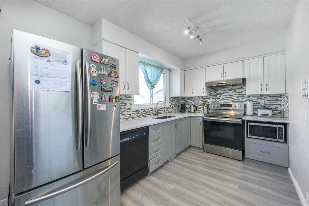 Welcome to this well-maintained 2-storey detached home in the heart of Rundle, perfectly located on a quiet street across from green space and a school. This property offers excellent value for families and investors alike, featuring a finished basement with an illegal suite and multiple recent upgrades. The main floor showcases an upgraded kitchen with quartz countertops and stainless steel appliances (fridge, hood fan, microwave), along with a functional layout, laminate flooring, a 2-piece bath, and access to a large deck with cover—ideal for outdoor enjoyment. The upper level features 3 spacious bedrooms, a 4-piece bathroom, and luxury vinyl flooring throughout. The fully developed basement includes a separate kitchen, 3-piece bathroom, and bright living space with large windows, making it ideal for extended family or rental potential. Additional highlights include shared washer & dryer, new furnace (2023), newer hot water tank, and partial roof replacement (2025). Outside, enjoy a single oversized detached garage, paved back alley access, and a private backyard setup. Conveniently located close to schools, parks, LRT, public transit, and shopping, this is a fantastic opportunity in a well-established NE Calgary community. This house is is very close to both a Catholic school and a public school about a 5-minute walk.