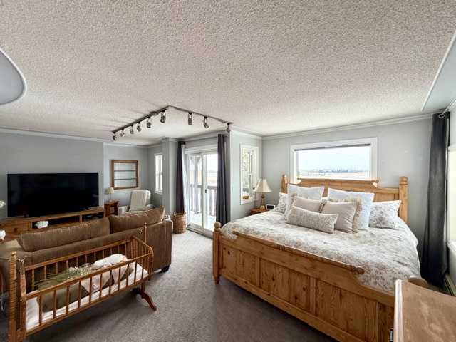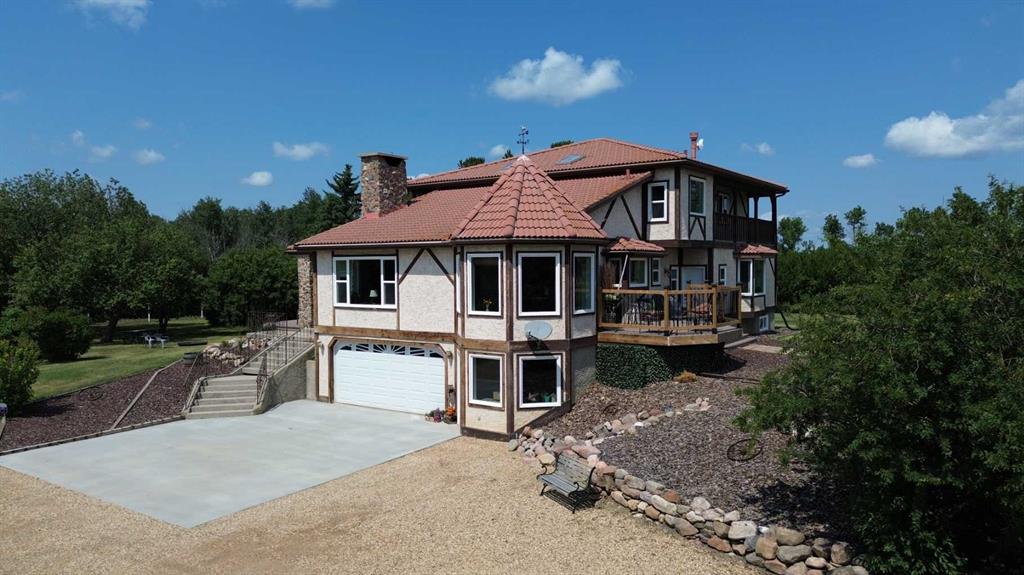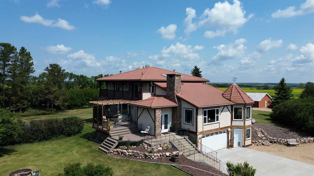 The House is Amazing, but you Will Love the ACREAGE! With roughly 5000 sq ft of living space, this 5 bedroom, 5 bath home has ample room to ENTERTAIN and RELAX. The main floor boasts a ROCK FACE fireplace in the Family room that is open to the Dining Room. The Dining Room is an Octagon shape with windows on 3 sides, and a door that opens to your East facing deck. Large Kitchen with double ovens, island, QUARTZ COUNTERTOPS, loads of cupboards, and features a WALK IN PANTRY with a SINK. Also on main floor is your LARGE BRIGHT LIVING ROOM, and two bedrooms. The PRIMARY BEDROOM is MASSIVE with room for your private office if you wish. Primary Bedroom features a BAY WINDOW overlooking the East country side and views of the COULEE. Behind one of the mirror closet doors you walk into a Large ENSUITE WITH A SOAKER TUB and a WALK IN CLOSET. How cool is that! Upstairs you have 3 large bedrooms, another Family/Office room and a nice sized 4 pce bath. On West and East side of 2nd floor you have a deck. Now to go downstairs, you have your entertaining area. A WET BAR, GAMES ROOM with a TV area, a 4 man SAUNA, another 3 pce bath, BONUS room, plus your laundry. Basement, and both the attached and detached garage have infloor heating. Walk out the basement door into your DOUBLE ATTACHED HEATED garage. In the garage you will see another mystery door that leads you to a Cold Room. House has ample amounts of storage with all large closets, and closets in the hallways. The West facing deck overlooks your PRIVATE yard and FIREPIT area. There are a couple Gorgeous apple trees that produce lots of apples. Look beyond the apple trees and through the gate you have a trail going through the trees. Also outside you have a garden area, a 12'x12' garden shed, a 28'x36' barn with cement floors that is currently used for storage, a 25'x40' steel Quonset, and a 44'x30' heated detached 4 car garage. The 9.37 acres is only 400 yards off of Highway 56, and hwy 56 was recently repaved last year. Located just over 20 minutes to Camrose and Stettler, and under 20 minutes to Bashaw. It is Centrally located and surrounded by beautiful countryside.
