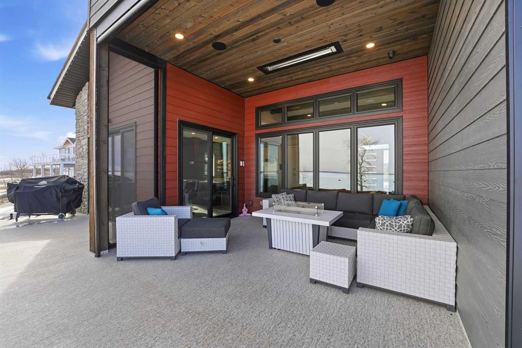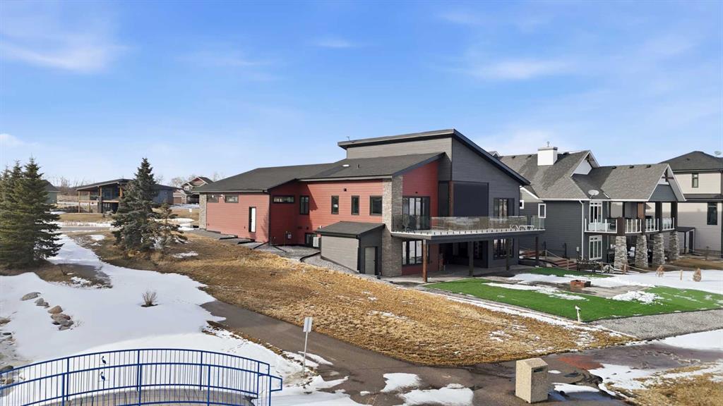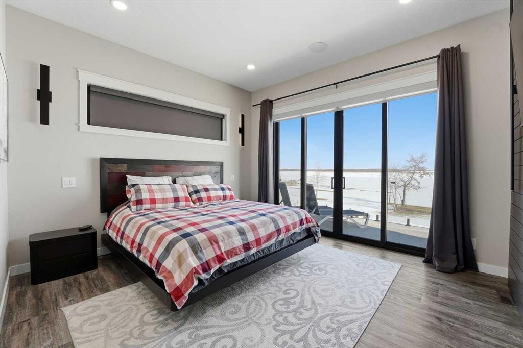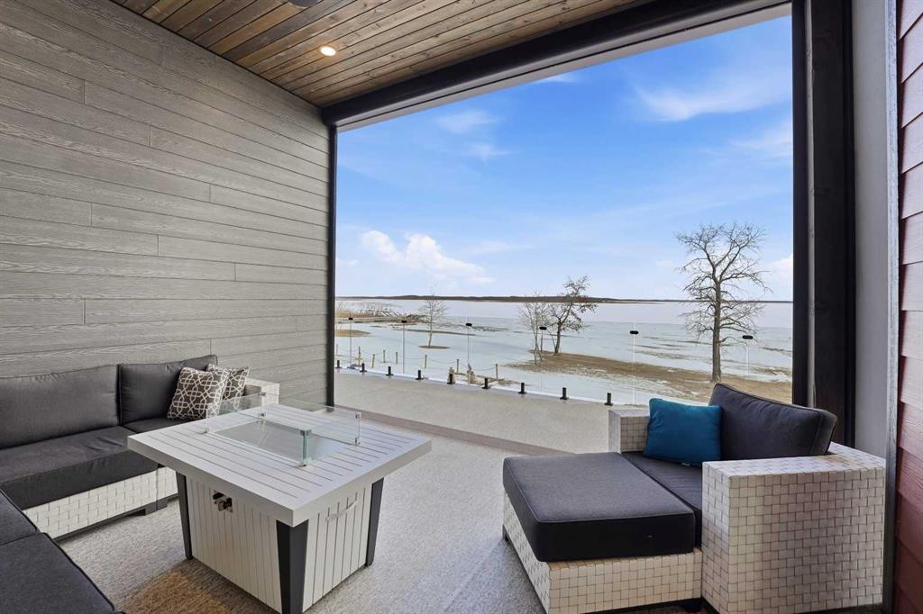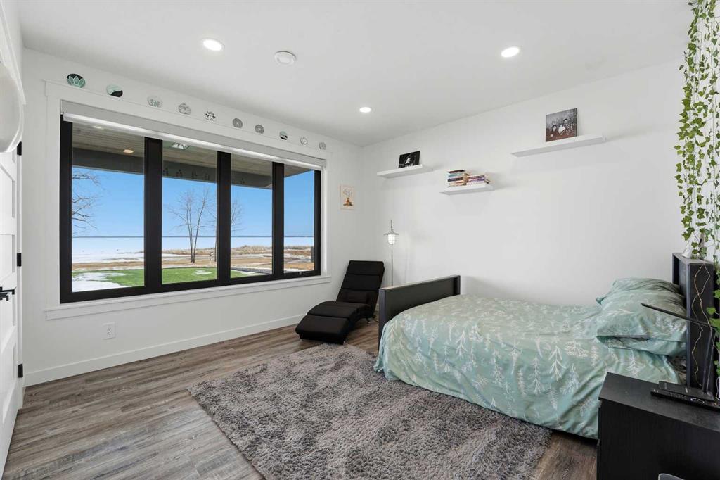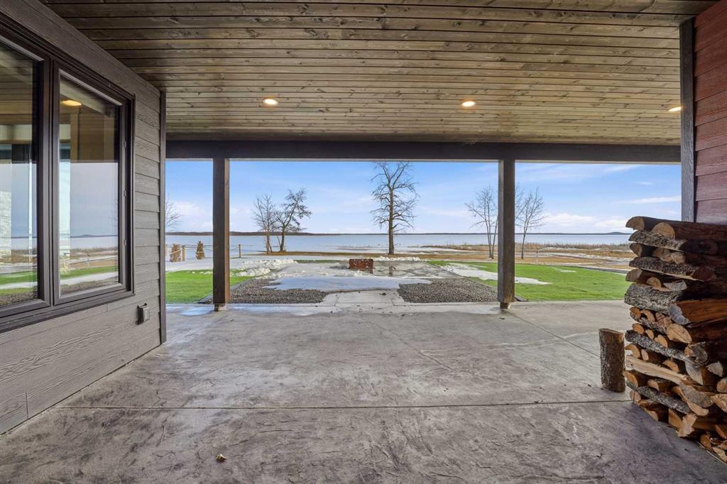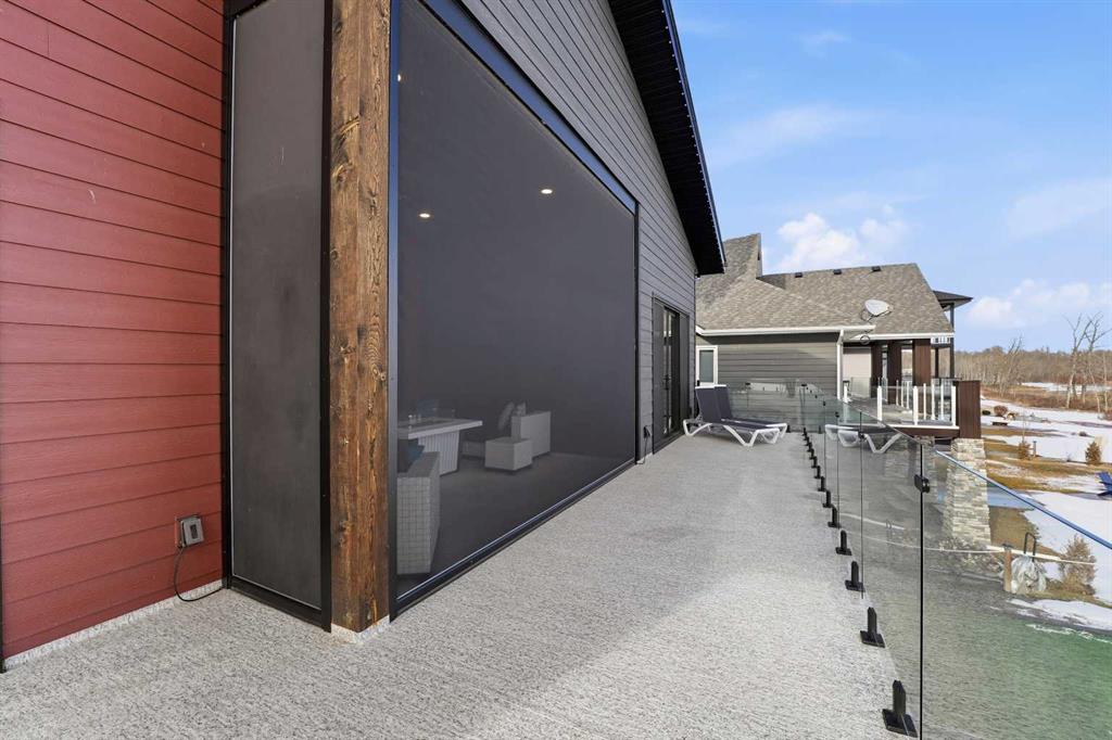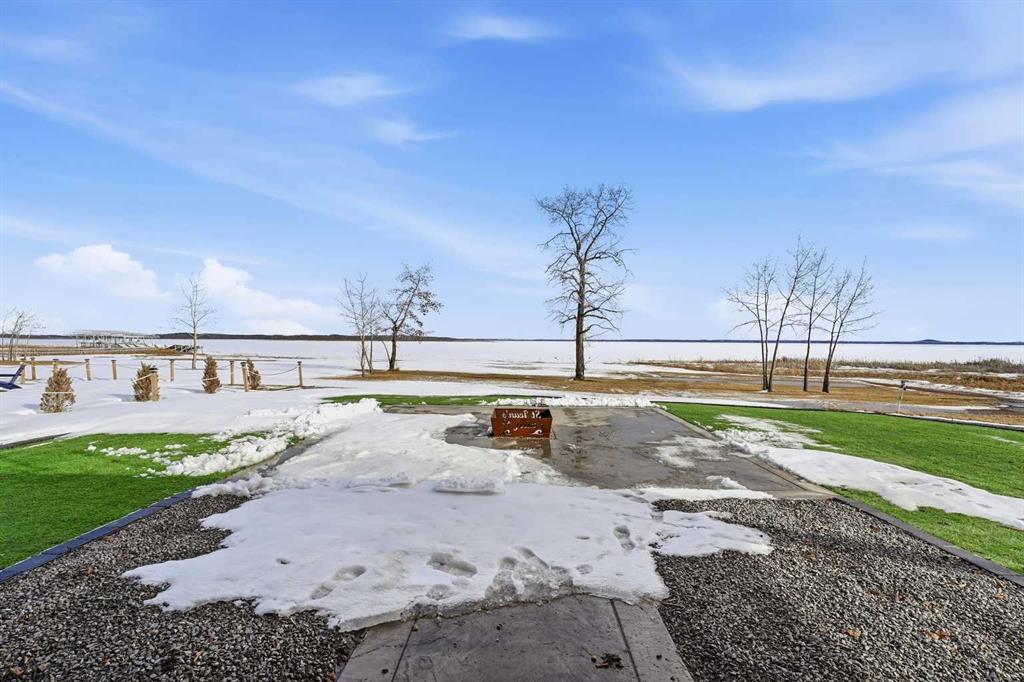 Be prepared to be impressed by this luxury lakefront home in Pelican View Estates offering nearly 3,400 sq ft of finished living space! From the moment you arrive, the curb appeal stands out with composite siding, stone accents, and an oversized stamped concrete driveway, along with additional paved parking beside the garage ideal for an RV or guests. Inside, the main living area features 10’ ceilings, luxury vinyl plank flooring, upgraded thick hickory trim, and expansive lake views through the large triple-pane windows. The kitchen is a true showpiece with white cabinetry, expansive quartz countertops, and an upgraded stainless steel appliance package including a 36” induction cooktop, side-by-side fridge/freezer, beverage fridge, and a kegerator that can also be used for carbonated drinks, while the oversized island adds even more space with a huge quartz counter and stylish hickory cabinetry. The dining area is surrounded by windows with lake views, and the living room showcases a striking 12’ ceiling with fir finished beams. Just off the entrance is a mudroom with hickory lockers and garage access. The primary bedroom offers lake views through the sliding doors to the deck, and a feature shiplap wall with an electric fireplace, along with an ensuite featuring dual sinks, a custom tiled steam shower, and access to a spacious walk-in closet. A 2-piece bathroom completes the main level. The walkout basement opens to a large family and games area with a wood stove and access to the outside stamped concrete patio. There is also two bedrooms, an office with included Murphy bed (or can be a third bedroom if desired), a 4-piece bathroom, laundry room, a cold storage room, and a dedicated home theatre with an included projector and screen. The theatre room also features a vault-style metal door, allowing the area to double as secure storage or a safe room, plus an additional 4-piece bathroom and storage room. The attached garage is heated, finished with Trusscore panels which are waterproof, includes hot and cold water taps, 8’ overhead doors, and measures over 36’ wide by 28’ deep. The outdoor living is exceptional with a full-width deck accessible from the dining area and primary bedroom, finished with Duradek, frameless glass railing, a covered section with a built-in heater and a powered screen to enclose it, while below the deck is a stamped concrete walkout patio extending to a fire pit area and a low-maintenance artificial turf yard. Both the upper covered deck and lower patio feature tongue-and-groove pine ceilings. The home also includes permanent perimeter lighting. Another standout feature is the $80,000 Control4 system offering remote control of lighting, blinds, security cameras, HVAC and more. Pelican View Estates provides community trails, a shared dock with the option to own a boat slip (negotiable on this sale, with slips valued around $7,500), and raking of the beach making it one of the nicest beaches in central Alberta just steps from your back door!