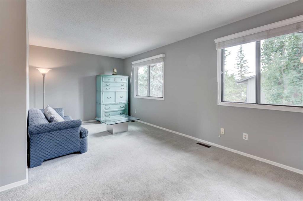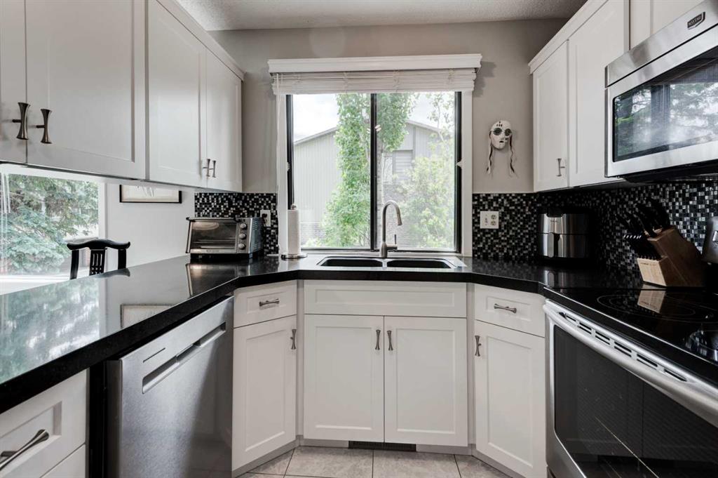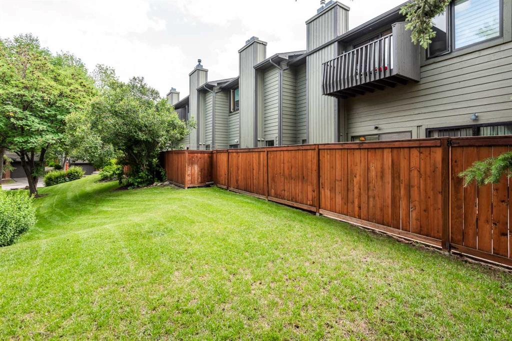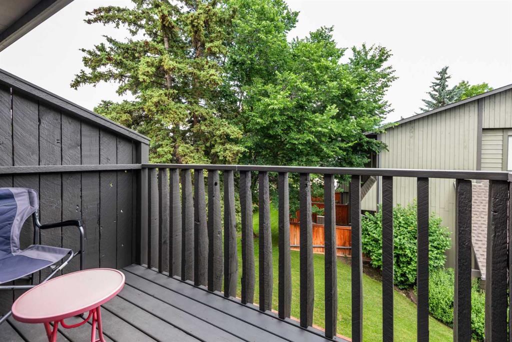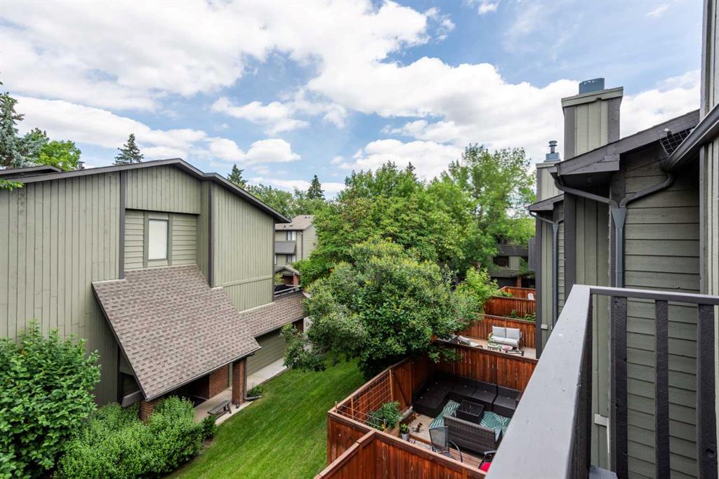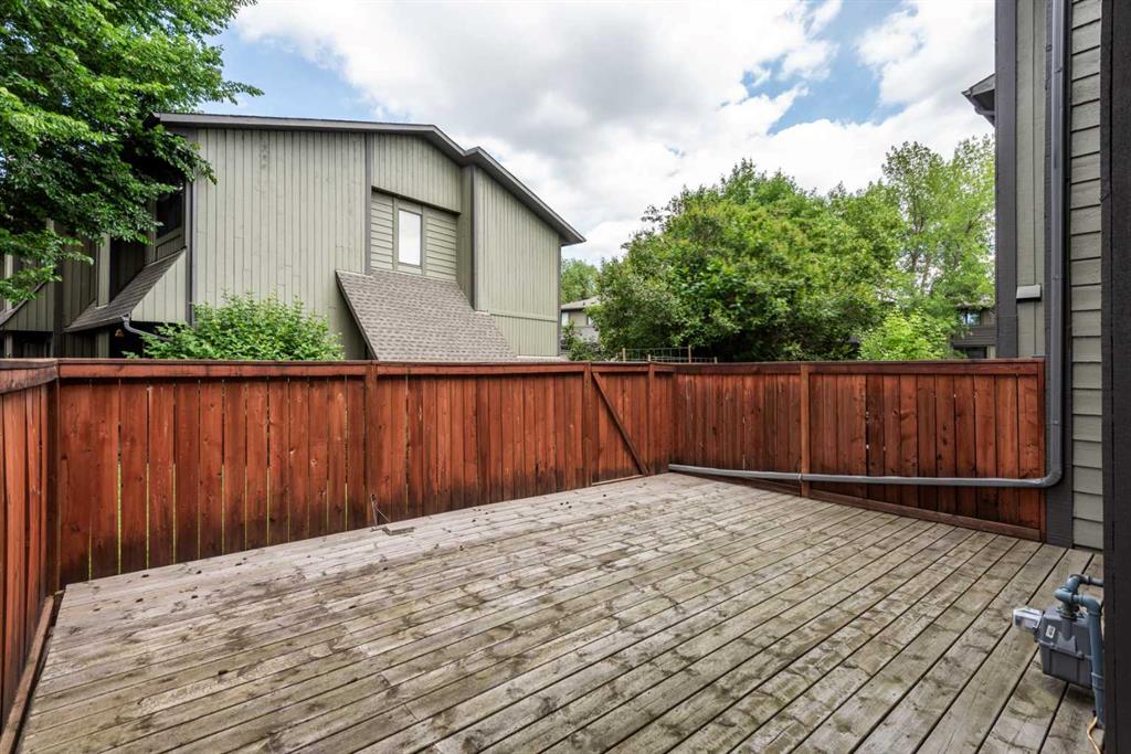 Welcome to Oakwood Lane — a wonderfully maintained, quiet, and family-friendly complex known for its mature trees, peaceful atmosphere, and excellent management. This beautifully designed 4-level split townhome offers a unique layout, thoughtful updates, and warm character throughout. The welcoming foyer provides convenient access to the heated attached garage, basement, and the rest of the home. Just a few steps up, you'll find a spacious living room with stunning cedar-vaulted ceilings, a cozy wood-burning fireplace, and access to a large private deck — perfect for relaxing or entertaining. Gorgeous hardwood flooring in the living room and continues into the bright flex space on the next level, ideal for a family dining room, home office, or playroom. The adjacent kitchen is a true highlight, featuring quartz countertops, soft-close cabinets and drawers, a sleek glass tile backsplash, stainless steel appliances, and a granite double sink. Recent 2024 upgrades include the fridge, dishwasher, kitchen faucet, washing machine, and a 2025 hot water tank. The white cabinetry and natural light make the space feel fresh and inviting, while the nearby dining area is perfect for everyday meals or hosting. A small powder room completes this level. Upstairs, you’ll find two spacious bedrooms, including a generous primary suite with its own private balcony, a walk-through closet, and access to the full bathroom. While the upstairs full bath is fully functional, it presents a great opportunity to add value with your own personal touch and modern updates. The top floor also includes a large linen closet and an additional storage closet — a rare and welcome bonus. This home offers exceptional value and is conveniently located just steps from a nearby shopping area for everyday essentials. You'll also enjoy quick access to transit, Stoney Trail, Glenmore Park, Fish Creek Park, and the Southland Leisure Centre. With its functional layout, tasteful upgrades, and unbeatable location in a well-maintained complex, this is a home you won’t want to miss!