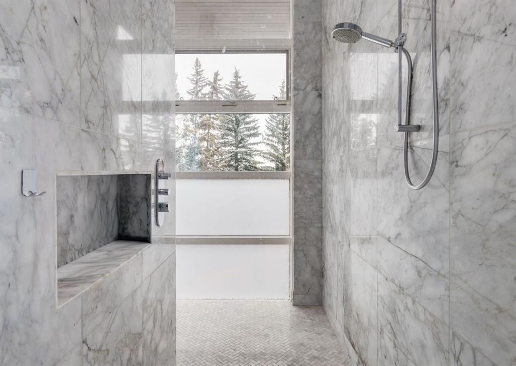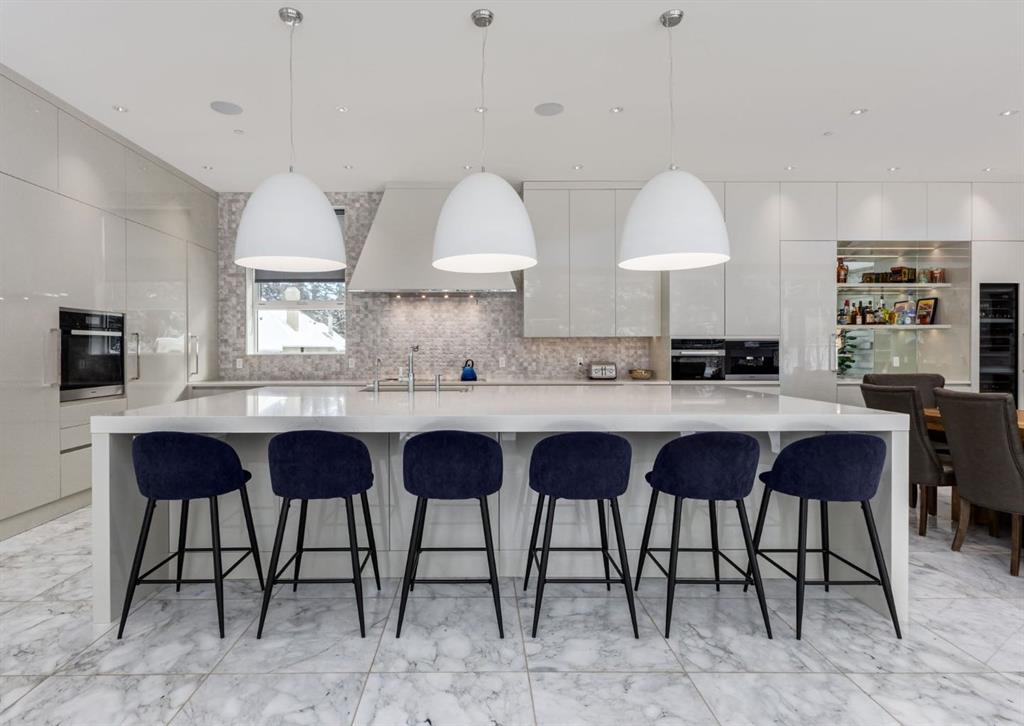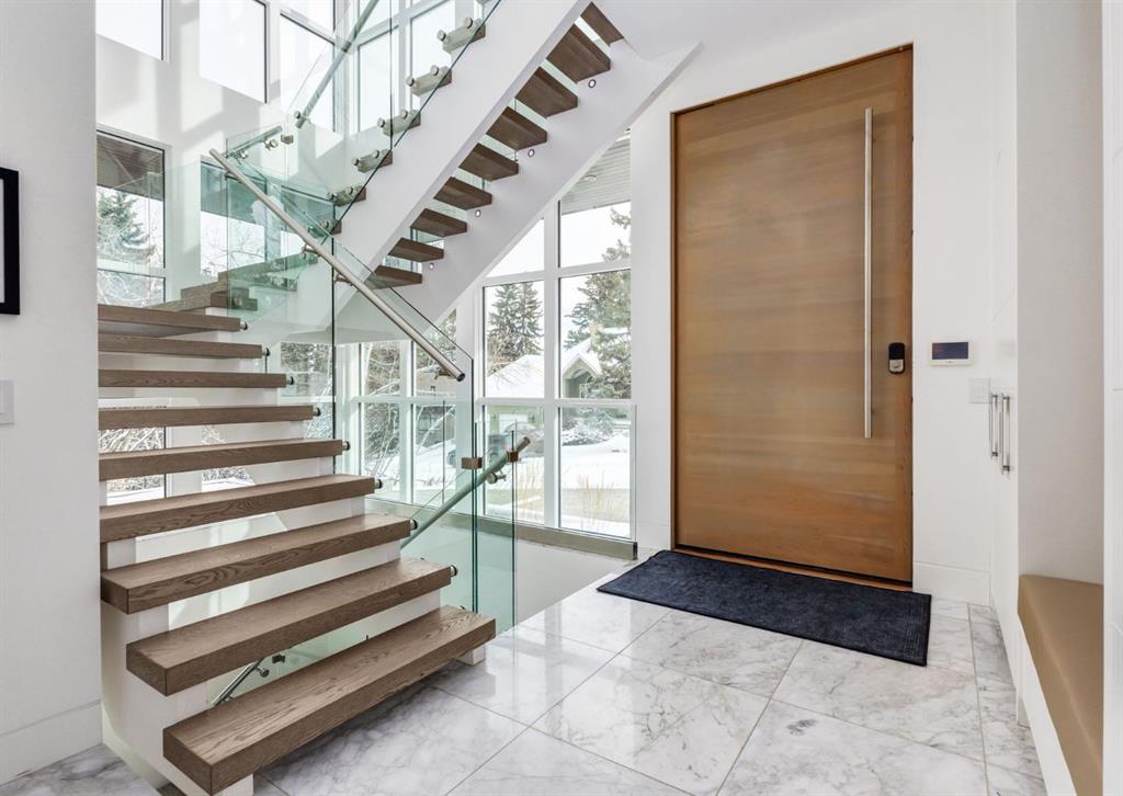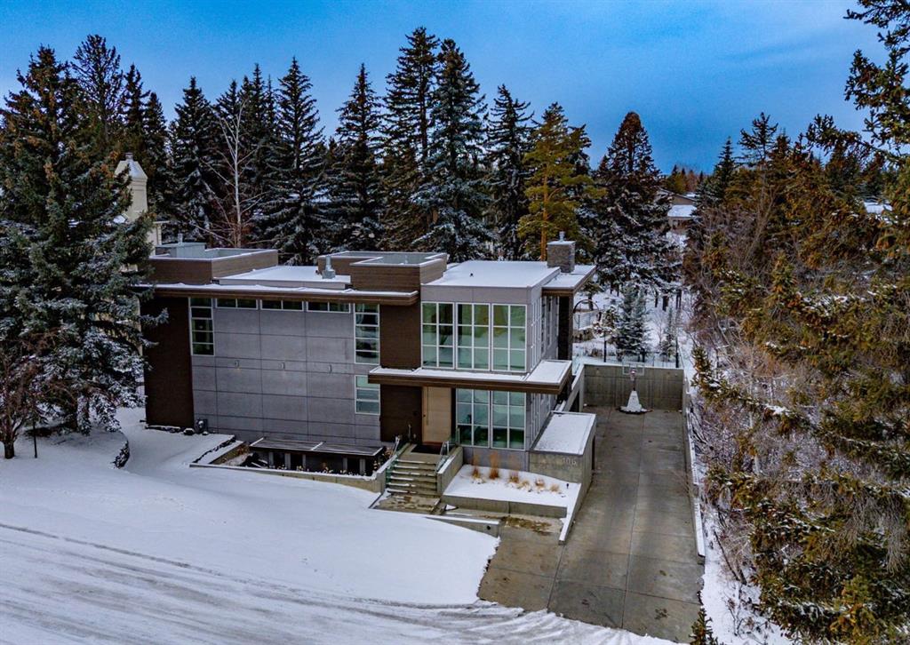 Stunning modern estate offering a rare combination of architectural excellence, elevated craftsmanship, and thoughtfully designed family living, ideally situated on a quiet cul-de-sac on over a quarter acre in the prestigious community of Pump Hill. Built in 2016, this remarkable legacy home was designed by the award-winning Vancouver firm Stuart Howard Architects, with interiors by acclaimed designer Paul Lavoie, and constructed by Riverview Custom Homes. From the moment you arrive, the home makes a statement. An impressive 9-foot pivot door opens to a grand foyer with soaring ceilings, expansive walls of triple-pane windows, a dramatic open-riser staircase, dual closets, and a newly upholstered bench. Inside, 5,500 square feet of living space unfolds with light-filled rooms and seamless indoor-outdoor connections. The open-concept main level is designed for both elegant entertaining and comfortable everyday living. A stunning executive office features custom millwork and tranquil views of the surrounding trees. The living room is anchored by a sleek Ortal fireplace and heated marble flooring, creating a warm yet contemporary gathering space. At the heart of the home is a chef-inspired kitchen showcasing quartz countertops and a premium Miele appliance package, including 72" of panelled refrigeration, induction cooktop, dual dishwashers, wine fridge, and built-in coffee system—perfect for both casual family meals and sophisticated entertaining. Designed with families in mind, the home offers five spacious bedrooms, each with its own ensuite, walk-in closet, and built-in desk space. Every bathroom is finished with timeless floor-to-ceiling marble and designer fixtures. Comfort is exceptional year-round thanks to hydronic in-floor heating on every level and two air conditioning units, while a fully integrated home automation system manages lighting, security, and built-in speakers throughout. The lower level features polished concrete floors and offers incredible flexibility with a large guest bedroom, full gym, and spacious recreation room. A massive mudroom connects to the attached heated triple garage, providing abundant storage for busy family life. Outside, the sunny WEST-facing backyard is a private retreat surrounded by mature trees, while the snowmelt driveway and front walkway ensure effortless winters. Located just minutes from Glenmore Reservoir and Rockyview General Hospital, this home offers the tranquility of an established neighborhood with convenient access to top amenities, parks, and pathways. A rare opportunity to own a truly distinctive modern estate in one of Calgary’s most sought-after communities. Floor plans and a 3D tour are readily available, providing a glimpse into this dream home.