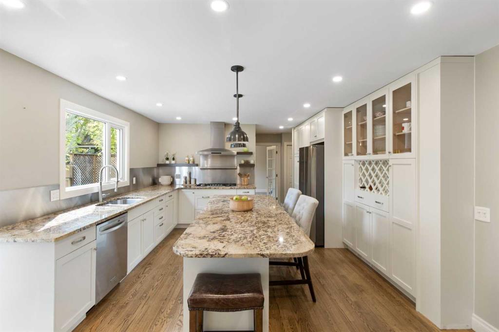 Homes on Lake Mead Crescent don’t come available often—and once you visit this fabulous property, you’ll see why. Perfectly positioned on a large corner lot at the end of a quiet crescent, this 5-bedroom home (or 4 plus a main floor den) combines space, comfort, and an unbeatable location in Lake Bonavista Estates. Inside, a welcoming foyer opens to a versatile dining room, currently used as a TV room. The renovated kitchen is the heart of the home and a true entertainer’s dream, featuring a massive island with eating bar, granite countertops, abundant cabinetry, stainless steel appliances including wall ovens and a 5-burner gas cooktop, and undermount sinks overlooking the family room with a cozy gas fireplace. The main floor is finished with hardwood throughout, a convenient powder room, and a 5th bedroom or den—ideal for guests or a home office. Upstairs, the spacious primary suite offers a 4-piece ensuite, while a large main bath and three additional bedrooms ensure room for everyone. The fully developed basement adds even more living space, complete with a media area, games room, a large dedicated storage room, and another bedroom. Recent upgrades include two newer high-efficiency furnaces, air conditioning, nearly all updated windows, and improved insulation for year-round comfort and efficiency. Step outside to your private backyard retreat. Mature trees provide shade and privacy, while a large deck, newer fencing, fruit trees, and a hot tub create the perfect setting for relaxation or entertaining. Lake Mead Crescent is one of the most desirable streets in Lake Bonavista Estates, known for its custom homes and exceptional curb appeal. The location offers quick access to major roadways and is within walking distance to the C-Train station. As a resident of Lake Bonavista, you’ll enjoy year-round lake access for swimming, boating, skating, sledding, pickleball, tennis, and more. The home is also close to top-rated schools, the shops at Avenida and Fish Creek Village, Southcentre Mall, and the Trico Centre. This is truly a once-in-a-lifetime opportunity to own on one of the community’s premier streets. With welcoming neighbours and an unbeatable lifestyle, this is more than just a home—it’s your chance to create a dream property in Lake Bonavista Estates.