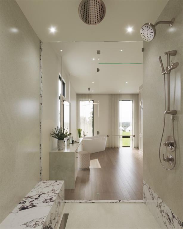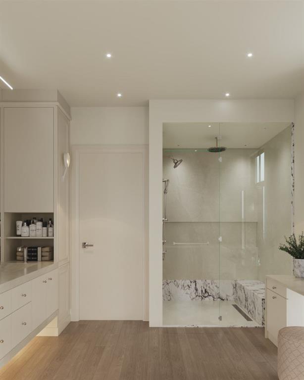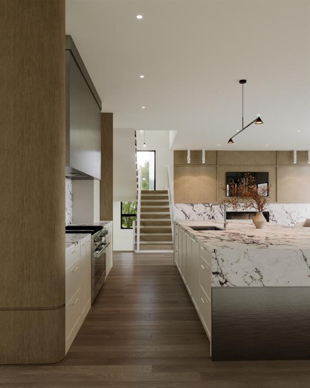 Experience an extraordinary expression of modern luxury in this architecturally striking residence designed by Midnight Designs, with interiors curated by Stephanie Martin and meticulously built by Ambedo Homes. Thoughtfully composed with clean contemporary lines, expansive windows, and a refined material palette, the home offers over 5,500 square feet of total developed living space, including a fully finished lower level and a rare attached triple tandem garage. The main floor unfolds through a dramatic open concept layout where natural light fills the interiors, and wide plank hardwood flooring and warm textures create an inviting yet sophisticated atmosphere. A welcoming foyer introduces the home’s architectural language, while a private main floor office offers a refined workspace with custom built in cabinetry. The heart of the home is the stunning chef’s kitchen designed as both a functional workspace and architectural showpiece, highlighted by an oversized waterfall island finished in bold stone with rich burgundy veining, custom cabinetry with integrated hardware, and a concealed range wall framed by textured metal panels and full height stone surfaces. Premium appliances are complemented by a fully equipped walk through pantry with additional prep space and storage, while the adjacent dining and living areas flow seamlessly together, anchored by a striking linear fireplace set within a dramatic feature wall, custom oak panelling, and expansive windows. A thoughtfully designed mudroom with built in storage connects directly to the attached triple tandem garage, while sculptural lighting, curved millwork transitions, wood stair treads, and a dramatic staircase illuminated by large picture windows add architectural presence throughout the home. The upper level offers four bedrooms, including an exceptional primary retreat, a central loft style bonus space, and a convenient laundry room with built in cabinetry. The primary suite unfolds through a series of elegant spaces beginning with the serene bedroom and continuing through a dressing gallery lined with windows into a boutique style walk through wardrobe with custom cabinetry and a center island. The spa inspired ensuite features a freestanding soaker tub beside oversized windows, custom double vanities with brass hardware, in floor heating, and a large walk in steam shower finished with full height stone tile, bench seating, and dual rainfall and handheld fixtures. The fully developed lower level expands the home’s functionality with a spacious recreation and media lounge, gym, one additional bedroom, and a full bathroom ideal for guests or extended family. Situated on a quiet tree lined street in one of Calgary’s most sought after inner city communities, this exceptional residence offers a rare combination of architectural sophistication, curated interiors, and elevated modern living just minutes from parks, schools, and the city’s best amenities. Call today to book your private tour!