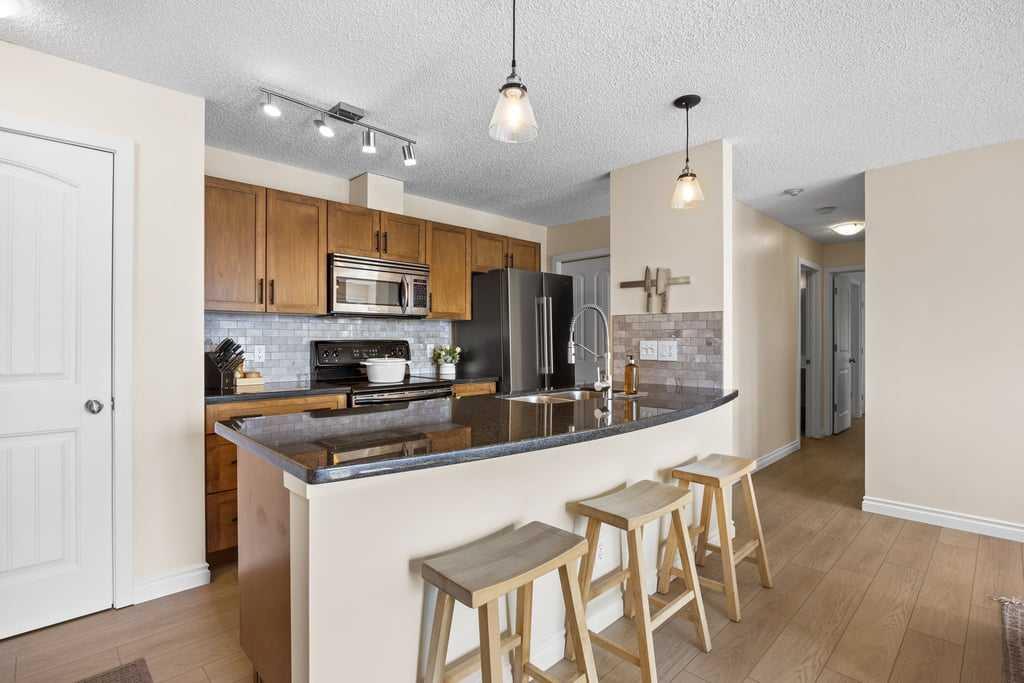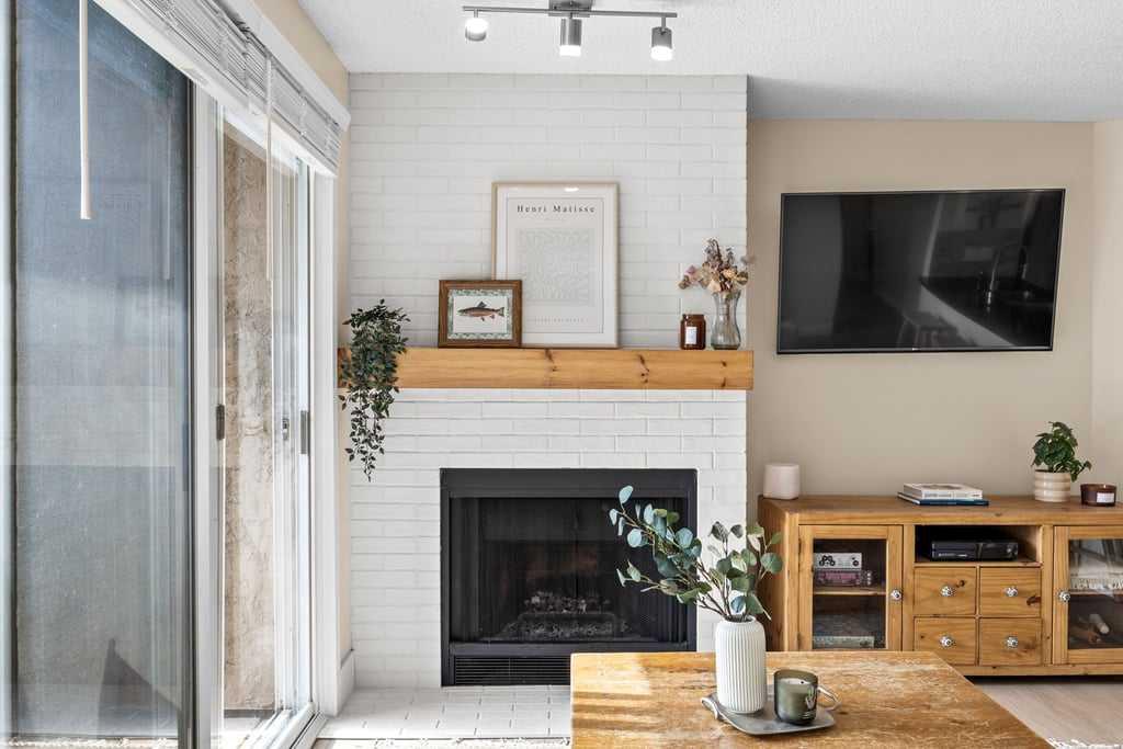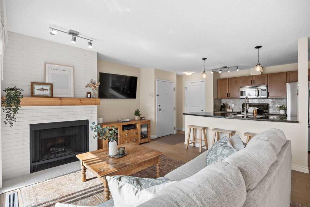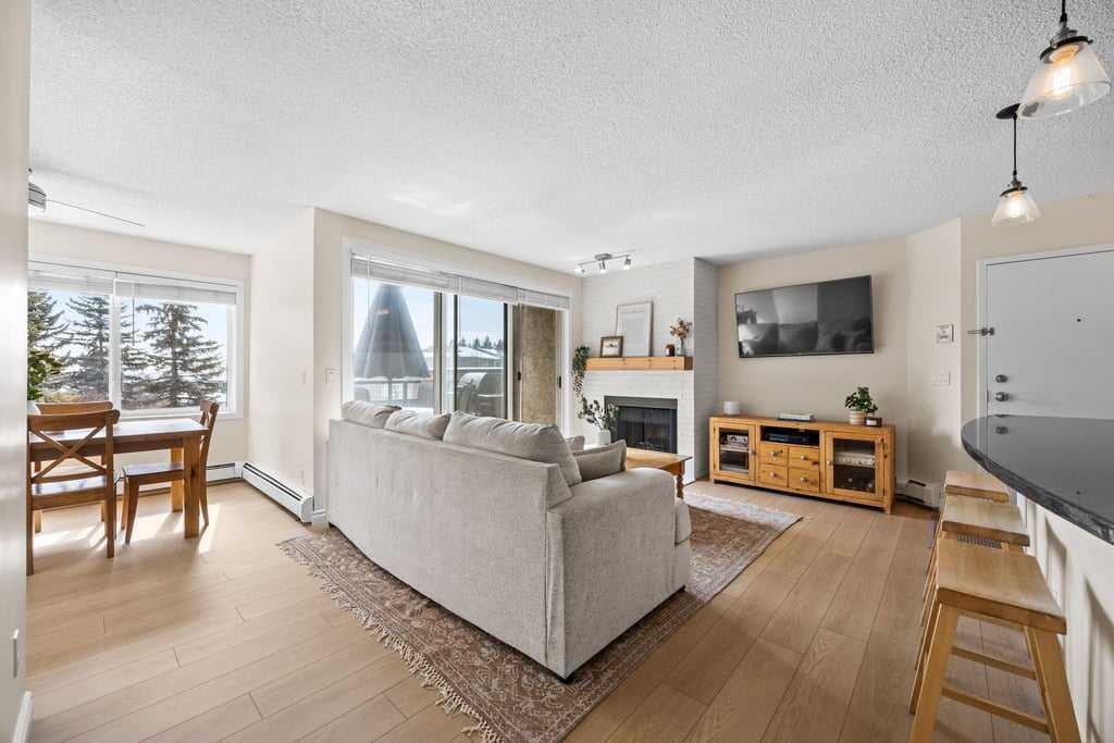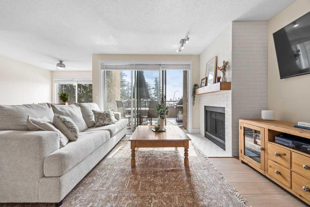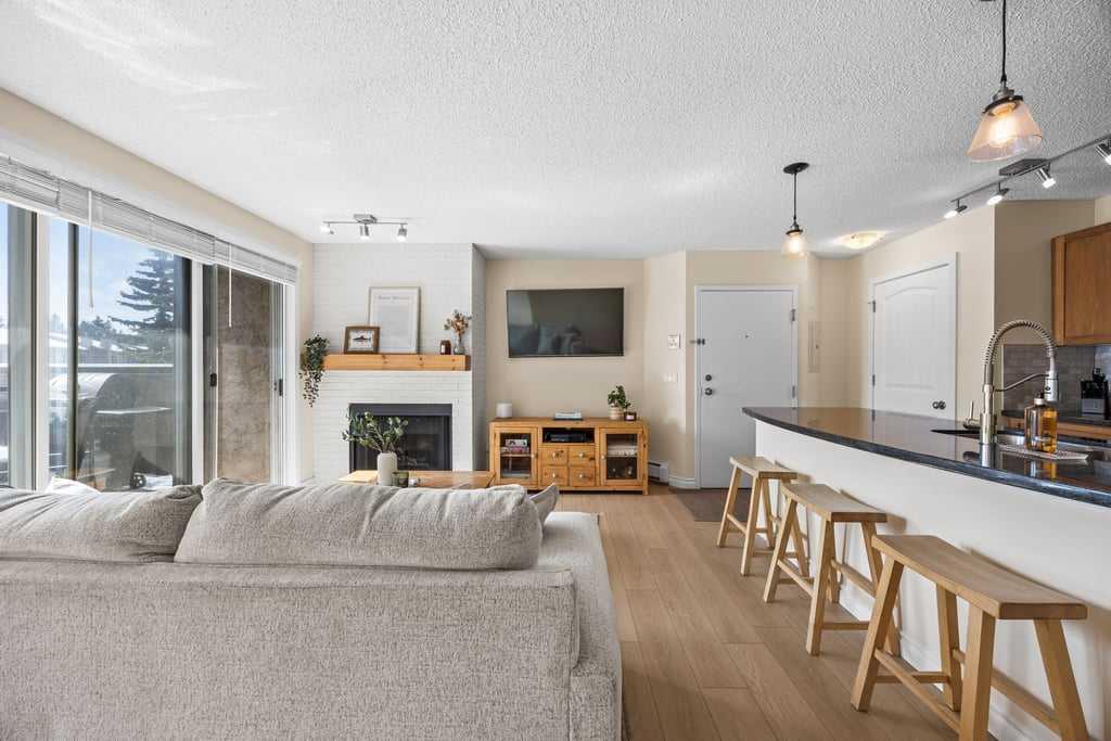 Set within an established and truly unique community, this is a quiet, elevated lifestyle just minutes from the city. This bright and beautifully maintained second-floor condo offers 2 bedrooms and 2 full bathrooms, thoughtfully designed for easy, low-maintenance living. Recent updates including new luxury vinyl plank flooring, fresh paint, and updated baseboards give the home a clean, modern feel, while large windows fill the space with natural light throughout. The living room is warm and inviting, centred around a wood-burning fireplace and flowing seamlessly into a generous dining area—perfect for hosting or easily reimagined as a comfortable home office. The kitchen balances style and function, featuring granite countertops, maple cabinetry, a curved eating bar, subway tile backsplash, an upgraded dishwasher, and updated laundry appliances for everyday convenience. Both bedrooms offer excellent storage, including a spacious primary retreat with a built-in wardrobe and private ensuite. The bathrooms have been thoughtfully renovated, offering both a full tub and a stand-up shower for added flexibility. A second full bathroom is ideally located just across from the second bedroom, making it perfect for guests or shared living. Step outside to your southeast-facing balcony and enjoy morning sun along with open views across the surrounding neighbourhood and toward the horizon. Additional features include in-suite laundry, a large private storage locker, and a reserved parking stall in the heated parkade—conveniently located on the same level as the unit for easy access. Residents of this pet-friendly complex (with board approval) enjoy beautifully maintained grounds with an ornamental pond and fountain, along with access to exceptional amenities including tennis courts, a fitness centre, indoor pool and hot tub, and a welcoming party room with fireplace. Condo fees include heat and water/sewer for added peace of mind. Originally built as the media village for the 1988 Winter Olympics, this iconic location offers a rare blend of history, community, and convenience. Just minutes to shopping, transit, recreation, and with quick access to downtown, this is a home that delivers both lifestyle and location.