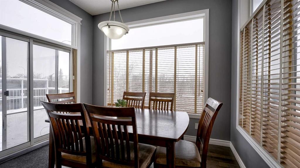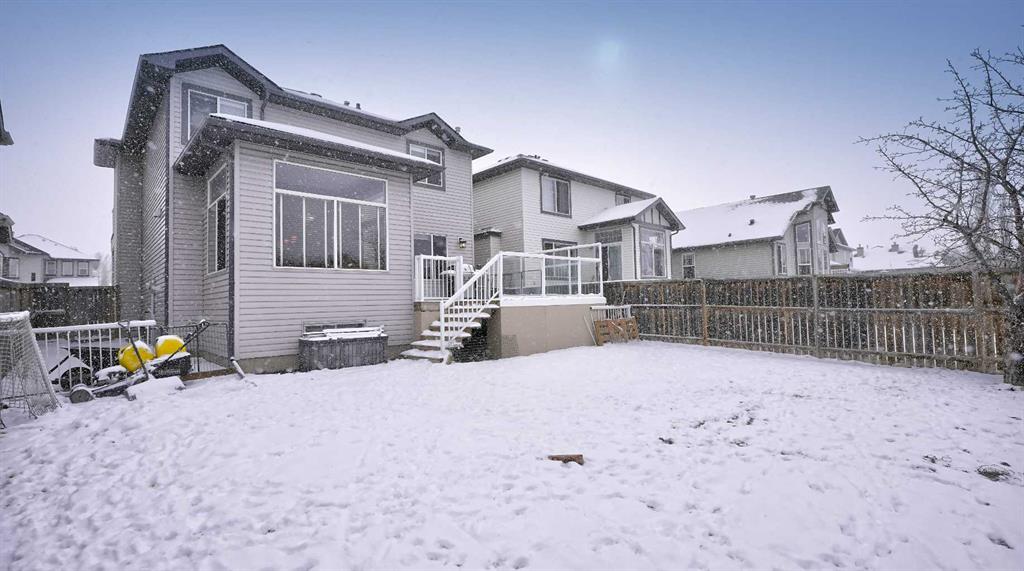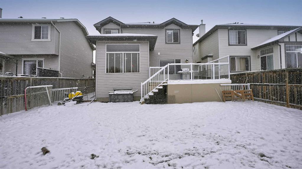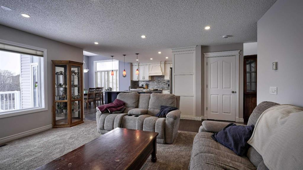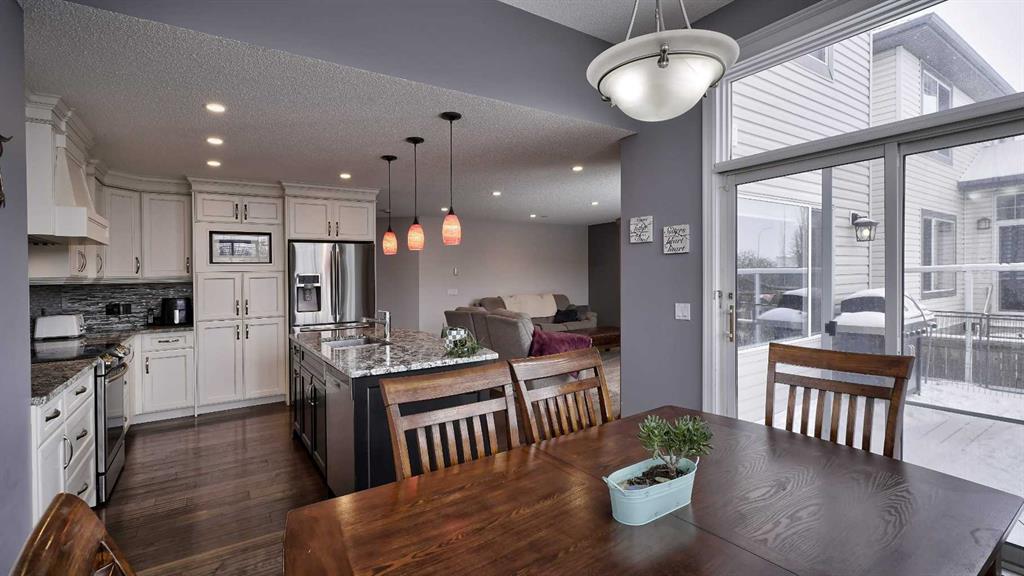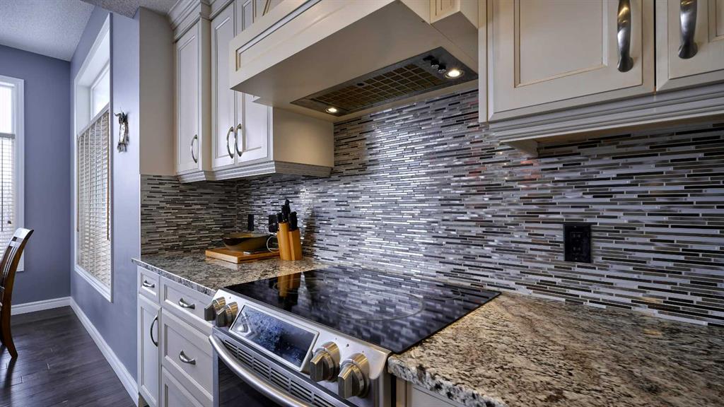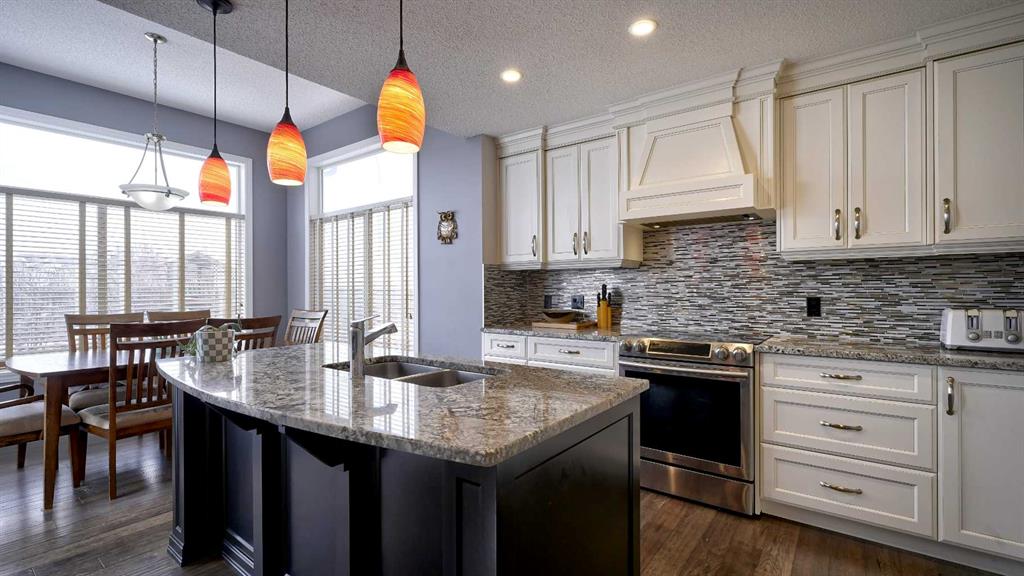 Chef's dream kitchen! Beautifully updatedkitchen has gleaming granite countertops, an abundance of counter space & full height cabinetry. A custom hood fan anchors the design, while the statement island—featuring elegant molding details and teardrop pendant lighting—creates the perfect gathering space. The dining area is bathed in natural light from oversized windows, seamlessly connecting to the open-concept living room with a cozy gas fireplace. Functional office/Den on this level, as well as a 2 pce bath. Spacious entry way is open to above w/ wrought iron railing leading upstairs. Favorable separate laundry room. Upstairs, the generous primary bedroom easily accommodates a king-sized bed and features a charming Juliet balcony. Large windows fill the space with natural light, complemented by blackout curtains. The ensuite is designed for relaxation, complete with a corner soaker tub, stand-up shower, and a private water closet with pocket door. Garage is insulated and wood paneled. Attached shelving will stay. Glass enclosed deck off the back w/retaining wall. Gravel side yard, plus retaining wall.