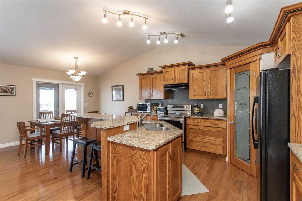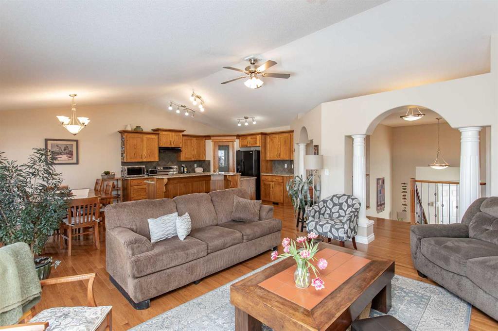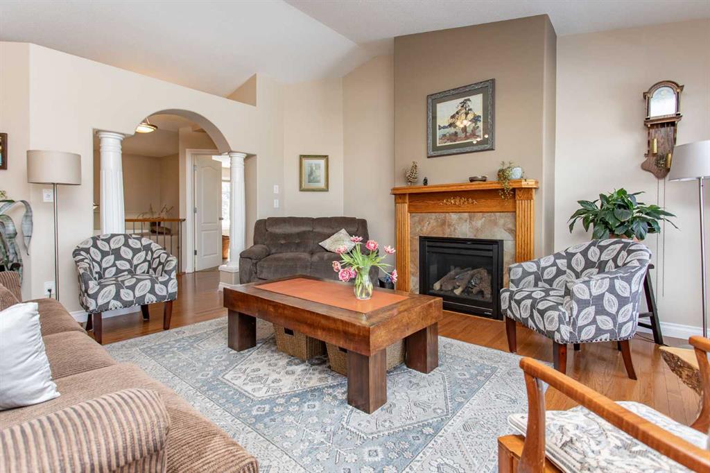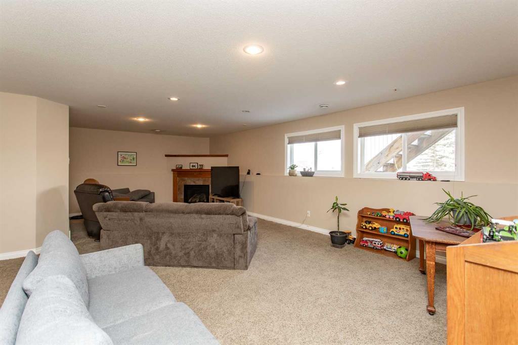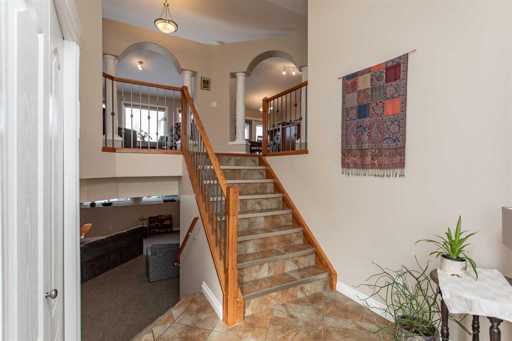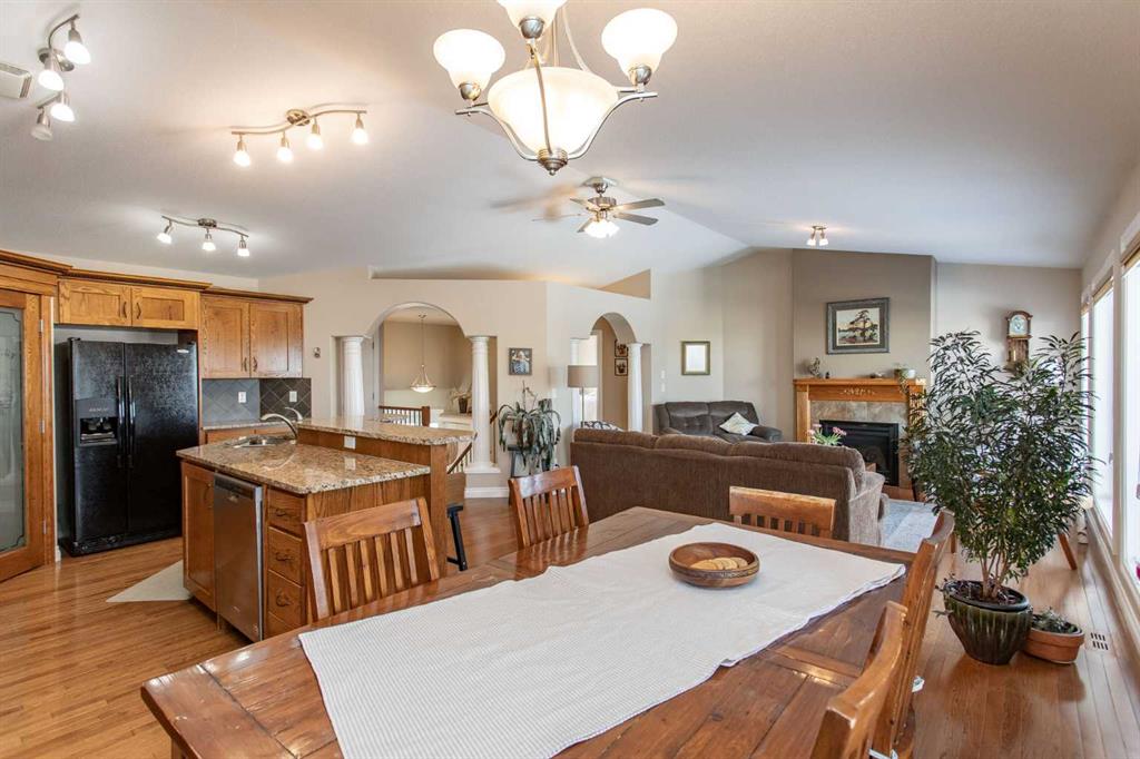 This well-maintained home in Ponoka’s Riverside area sits on a quiet cul de sac. It features quality craftsmanship, a spacious tiled entry, and inviting arches leading to the open-concept kitchen, dining, and living areas. The kitchen offers plenty of cabinets, granite countertops, and a corner pantry—ideal for entertaining. Upstairs includes a primary bedroom with walk-in closet and ensuite, two additional bedrooms, and a four-piece bathroom. The finished basement has a family room with gas fireplace, two more bedrooms, another full bath, laundry, and in-floor heat. Additional highlights are underground sprinklers, gas BBQ hookup, landscaped yard with mature trees, and a firepit—perfect for summer evenings. This home is ready for its next family.