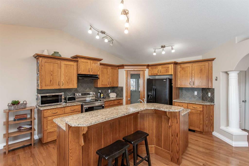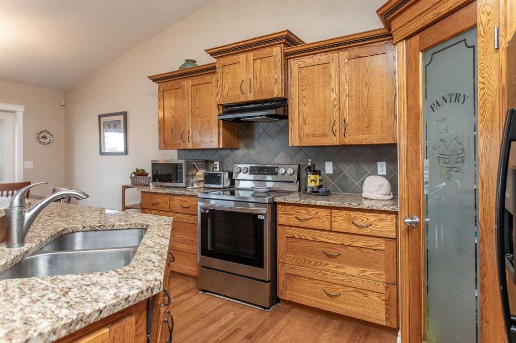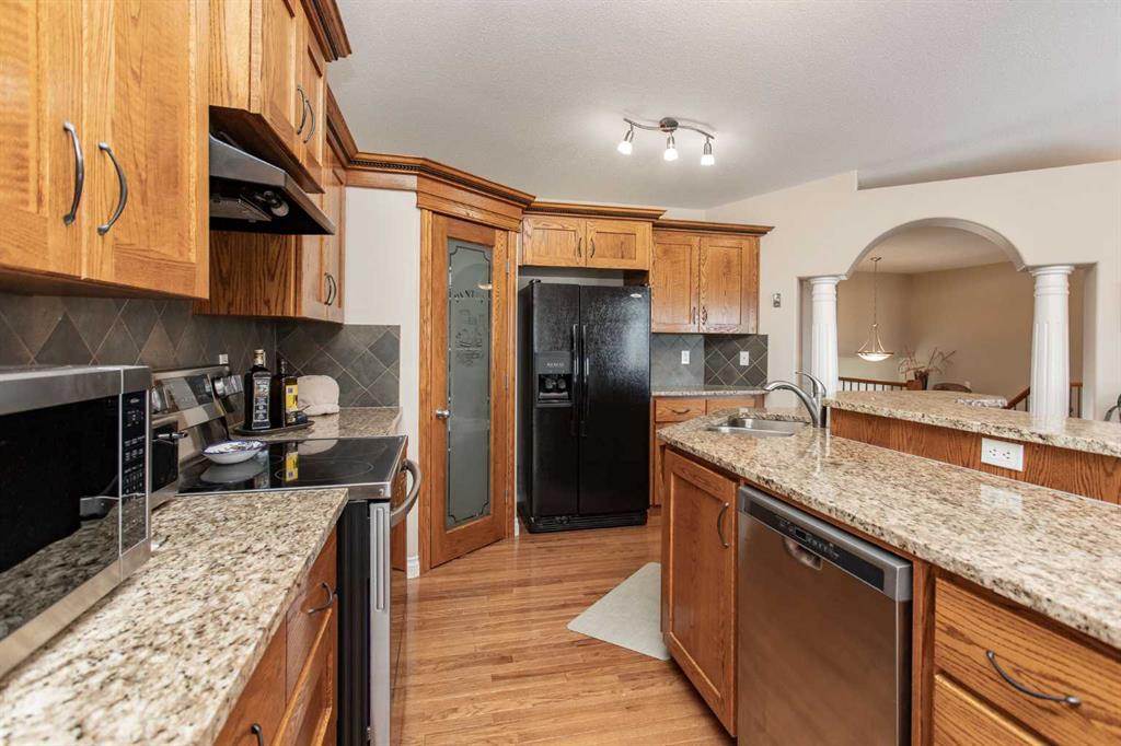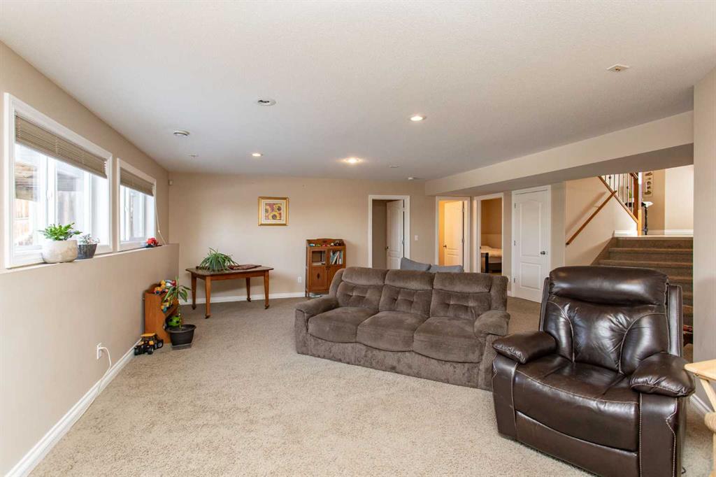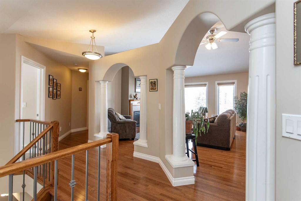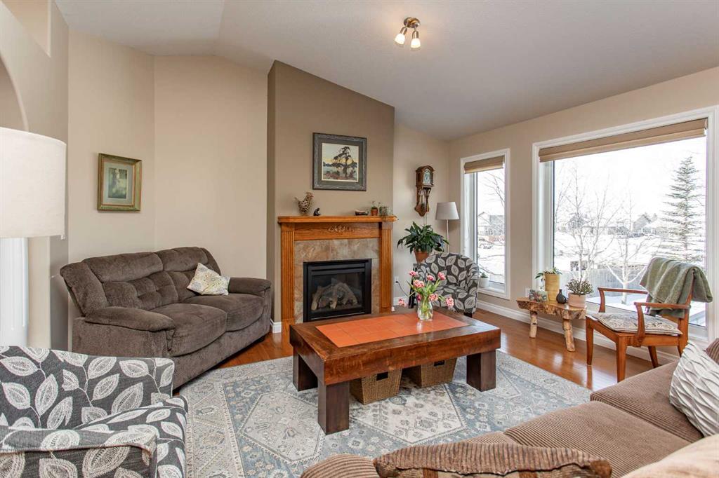 This well-maintained home in Ponoka’s Riverside area sits on a quiet cul de sac. It features quality craftsmanship, a spacious tiled entry, and inviting arches leading to the open-concept kitchen, dining, and living areas. The kitchen offers plenty of cabinets, granite countertops, and a corner pantry—ideal for entertaining. Upstairs includes a primary bedroom with walk-in closet and ensuite, two additional bedrooms, and a four-piece bathroom. The finished basement has a family room with gas fireplace, two more bedrooms, another full bath, laundry, and in-floor heat. Additional highlights are underground sprinklers, gas BBQ hookup, landscaped yard with mature trees, and a firepit—perfect for summer evenings. This home is ready for its next family.