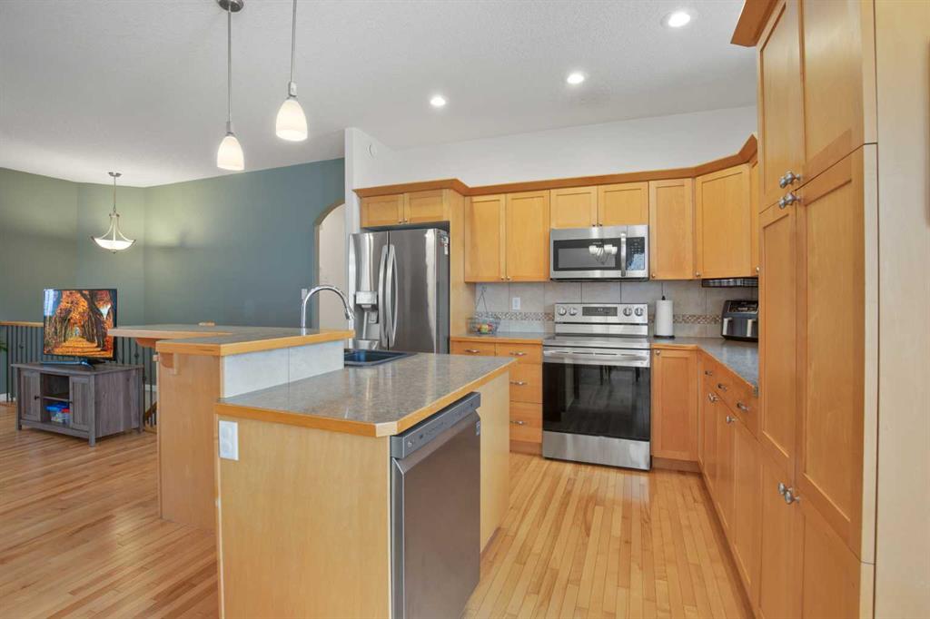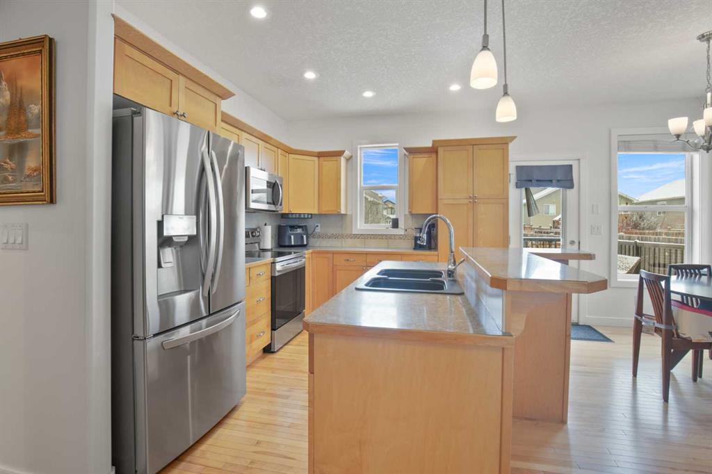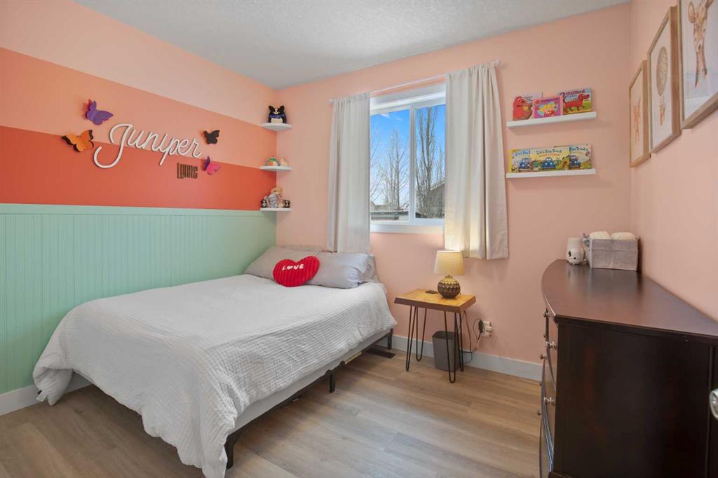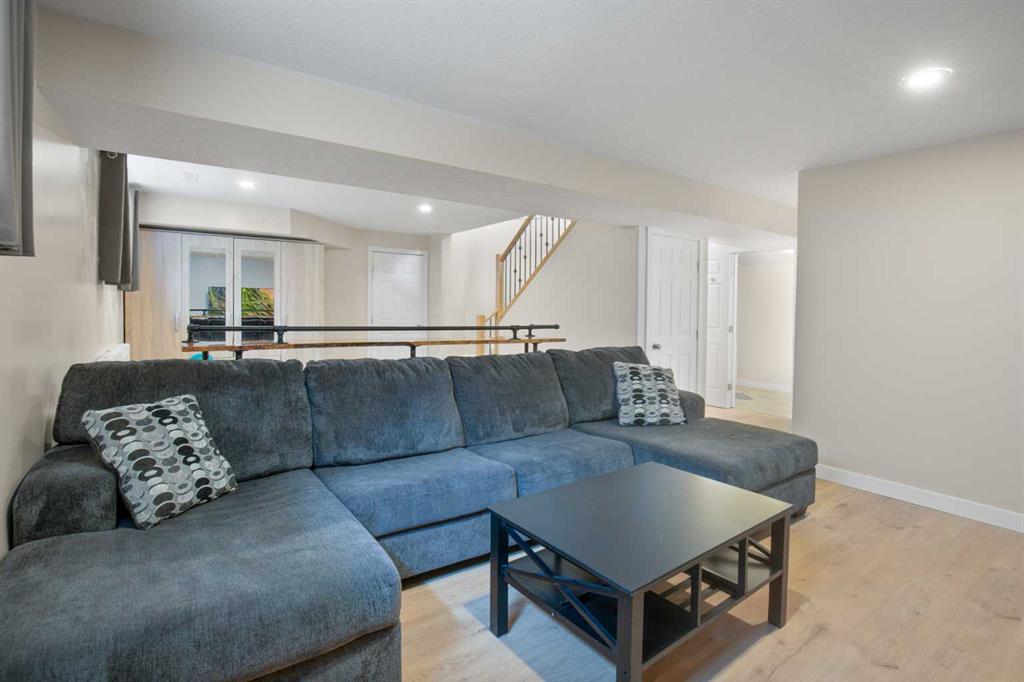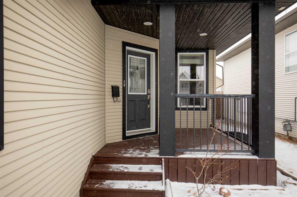 NOW OFFERING this fully finished family home with attached double garage on a quiet cul-de-sac! This home has great curb appeal with its dark garage door and trim, and covered front deck. Enter into a large tiled entrance and an open floor plan main floor. You'll love the warmth of the hardwood flooring, tall ceilings, and large windows. There are extensive cabinets, stainless steel appliances, tiled backsplash, and a large island in the kitchen. The master bedroom is spacious and has his and hers closets, and a three piece ensuite bathroom. There's a second bedroom and full bathroom upstairs as well. The basement is very large and has an open floor plan. The family room has plenty of room for your entertainment area, plus home office, play area or whatever you desire. There's a third and third and fourth bedroom and another full bathroom downstairs as well. Enjoy the back yard on your two-level deck with aluminum railing, overlooking the fully fenced and landscaped yard. The double attached garage is insulated and roughed in for in-floor heat.
