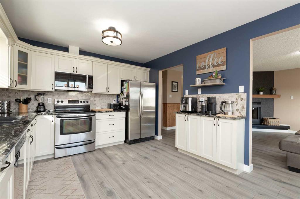 Welcome to small-town living at its finest! This well-appointed 5 bedroom, 2.5 bathroom home offers comfort, functionality, and charm — all just 20 minutes from Lethbridge! The main floor has a wonderful open flow connecting the living room, dining area, and a beautifully renovated kitchen featuring stunning cabinetry, granite countertops, and a dedicated coffee station, perfect for those who love to entertain. Upstairs you'll find three generously sized bedrooms, including a primary suite complete with a private 2-piece ensuite. Another 2 good size bedrooms and full bathroom. The fully developed basement extends your living space with two additional bedrooms, a full bathroom, a spacious family room, and ample storage, ideal for growing families or guests. Complete with an attached single car garage and sitting on a large lot, this home offers the space and lifestyle that's simply hard to find in the city. You won't want to wait on this one.