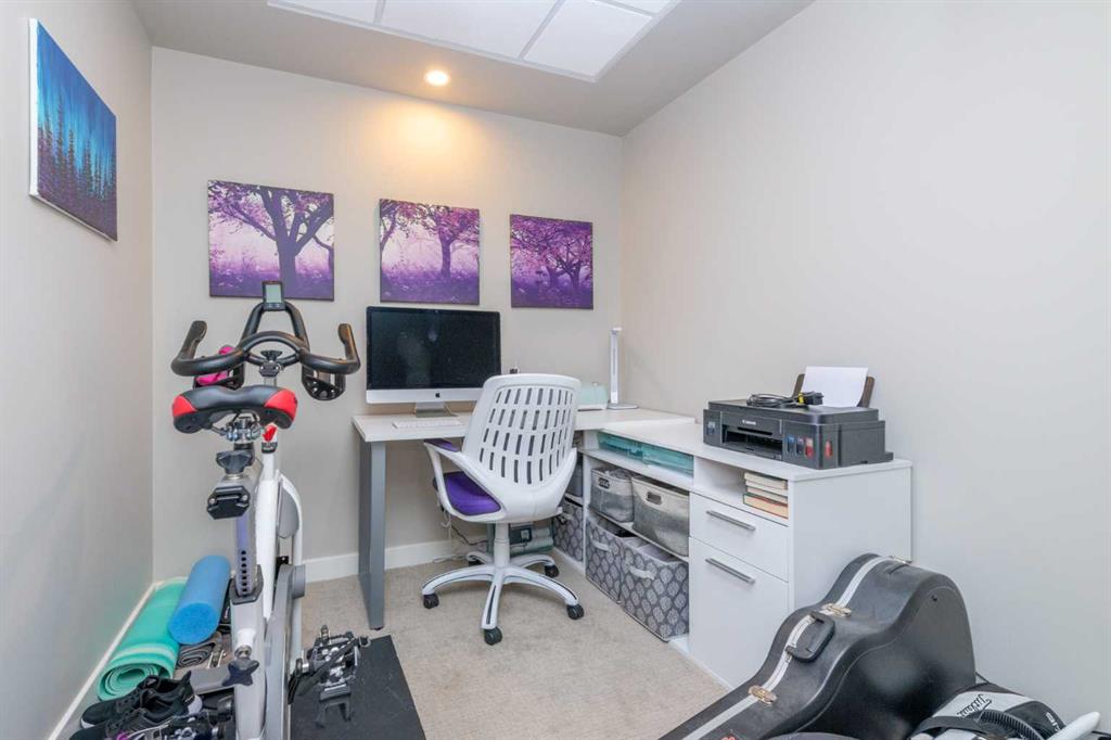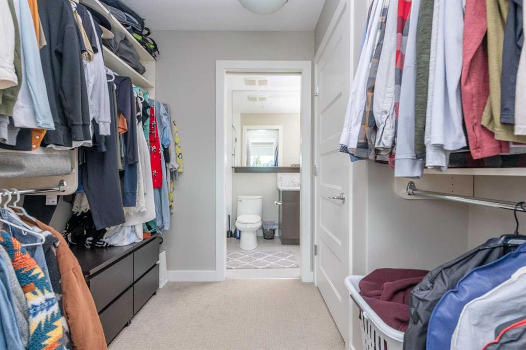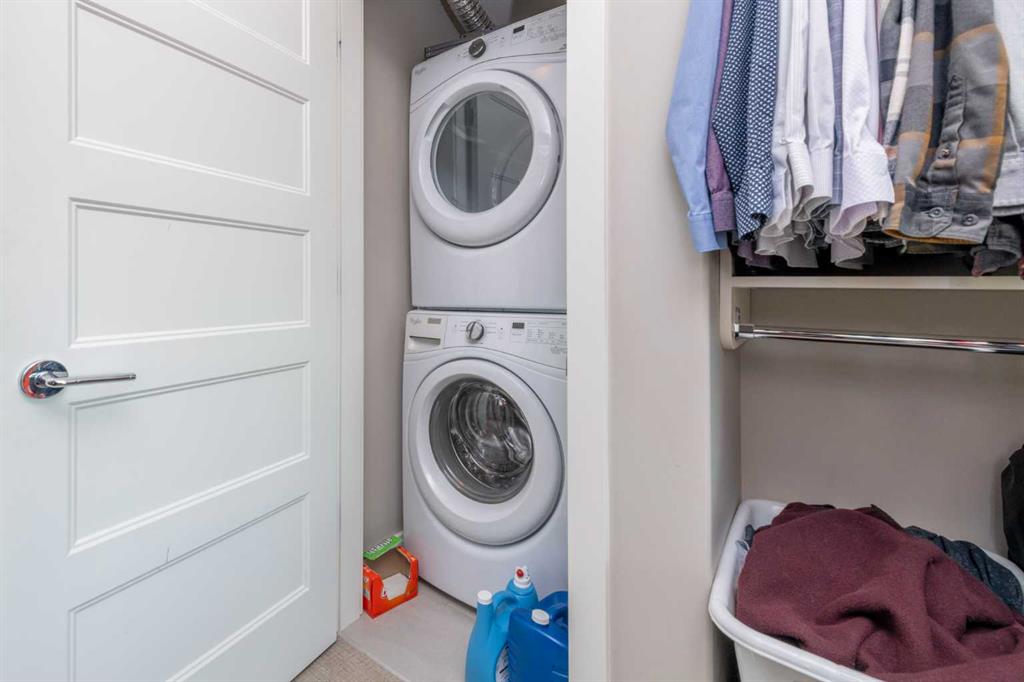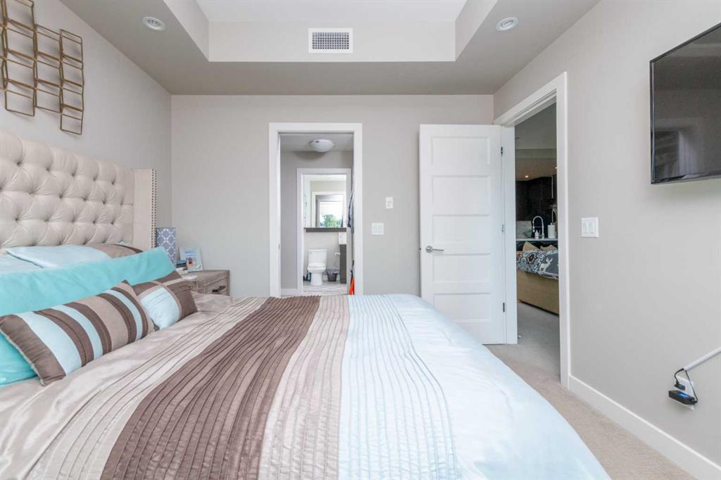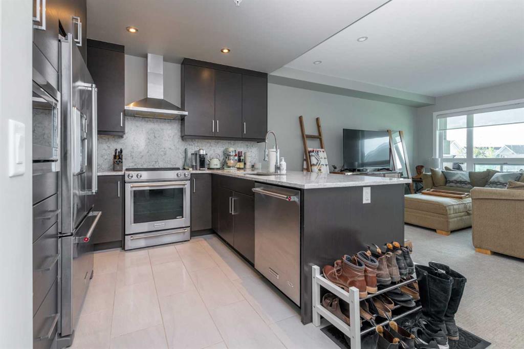 Welcome to The Armory in sought after Currie Barracks. This quiet 18+ thoughtfully designed unit is located across from the street from the beautiful gardens by Officers Inn. Offering lots of curb appeal and ample surrounding amenities all within walking distance. Walk into this one bedroom + den unit with 9 foot ceilings and you instantly notice how big the windows are, allowing the room to fill with natural light. The kitchen is loaded with matching stainless steel Kitchen Aid Range, dishwasher, and a fridge with ice maker and water dispenser. The microwave is built into the cabinets for a more refined look, and the kitchen has a stainless steel under-mounted sink encased by a matching quartz countertop and backsplash. In suite laundry in the walkthrough closet allowing maximum convenience. Pantry closet with shelves, and a large den perfect for a home office. The bathroom is equipped with quartz countertops and a long one piece vanity mirror and soaker tub. Central Air Conditioning allowing maximum comfort all year round. Covered balcony with courtyard views allowing more additional space that is functional year round. Titled parking space/storage locker, and is located in a prime location. Pet friendly 30lbs and under.