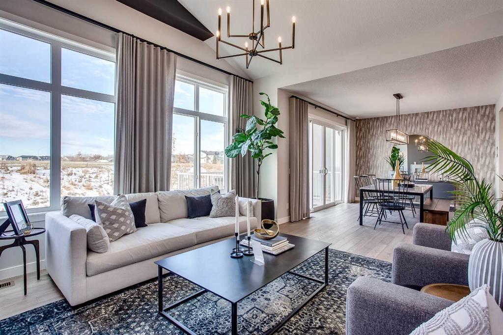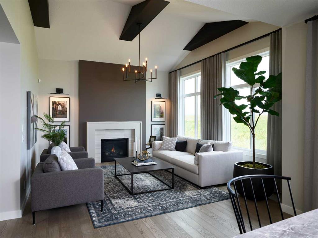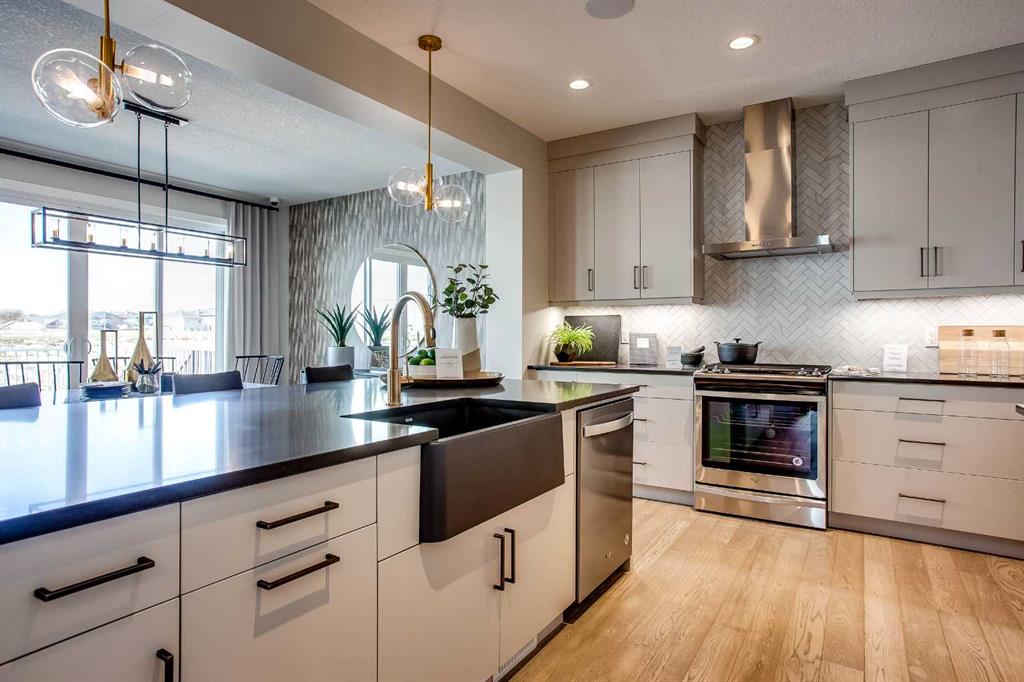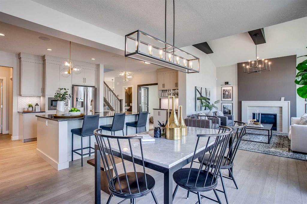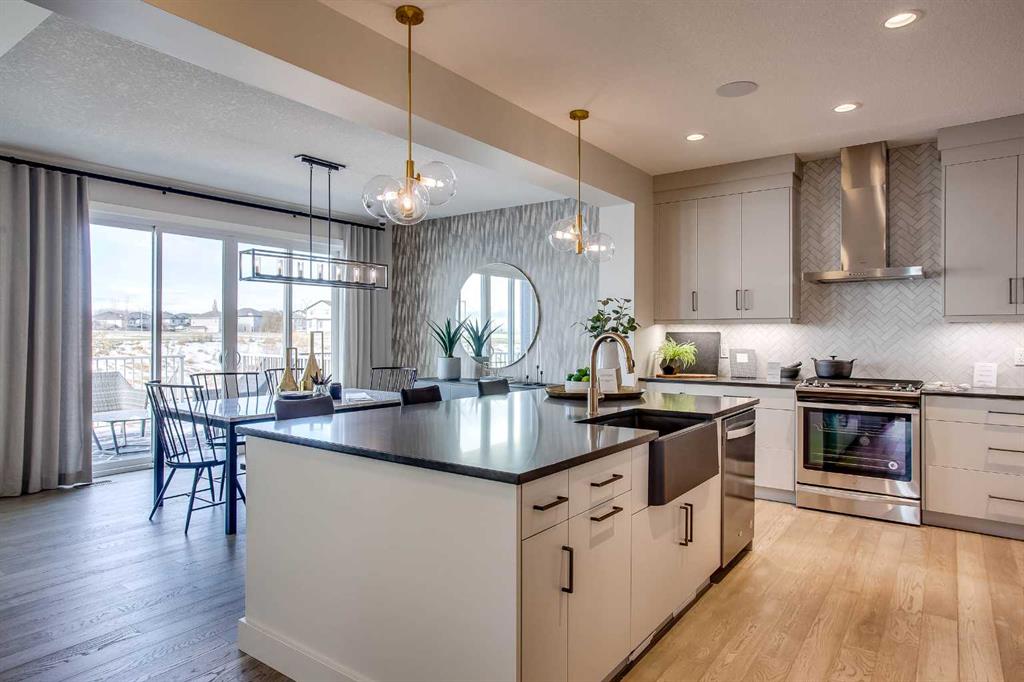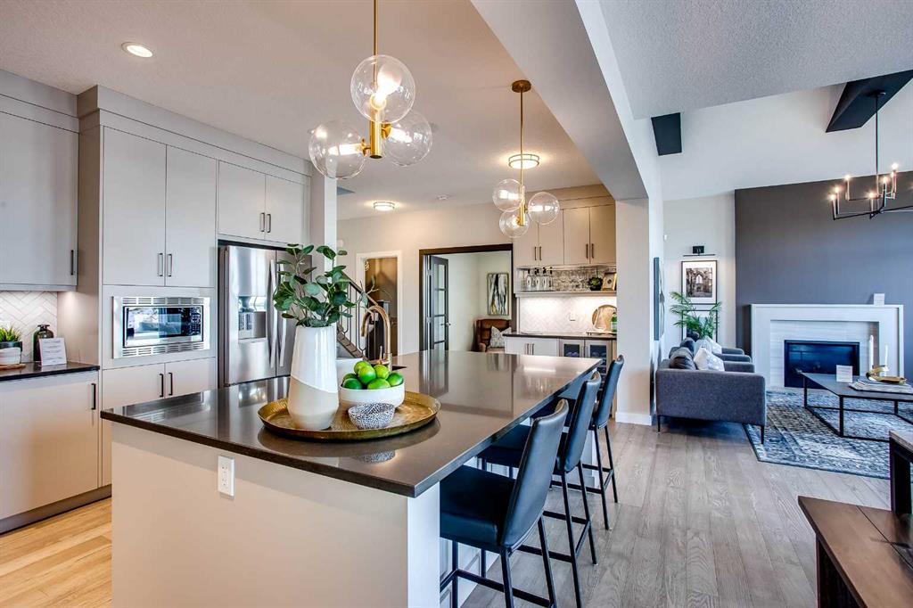 Exquisite Former Show Home with Majestic Mountain Views. Welcome to the "Hennessy III" by Calbridge Homes, an award-winning former show home where sophisticated designer upgrades meet an unparalleled lifestyle location. Backing onto a serene green space with a coveted west-facing backyard, this residence offers a front row seat to breathtaking Rocky Mountain sunsets. The interior is bathed in natural light, highlighted by wide-plank hardwood floors and custom designer lighting throughout an open-concept layout masterfully planned for both intimate family life and grand-scale entertaining. The gourmet chef's kitchen serves as the heart of the home, featuring full-height cabinetry, a massive breakfast bar island, premium stainless steel appliances with a gas range, and a substantial butler's pantry for seamless organization. In the grand great room, soaring vaulted ceilings with wood beams and a tiled fireplace create a sense of scale, while a signature wall of windows perfectly frames the outdoor oasis. For those seeking a quiet workspace, elegant French doors lead to a dedicated den perfect for a sophisticated home office. The upper level is a true sanctuary of comfort, led by a primary retreat featuring a massive walk-in closet and a spa-inspired ensuite with dual vanities, an oversized shower, and a deep soaker tub. A versatile central bonus room offers the ideal loft space for movie nights, complemented by three additional bright bedrooms, a full family bathroom, and a conveniently located laundry room. The professionally finished basement significantly extends the living space, offering a massive recreation area and a fully equipped wet bar with a beverage fridge. A large fifth bedroom and full bathroom provide a private suite for guests or older children. Complete with a generous triple-car garage, this home is close to the incredible walking paths that lead you throughout the parks and playgrounds this community has to offer. Enjoy unbeatable convenience being just minutes from the C-Train, YMCA, community center, and a vibrant array of local shops and dining. Experience the pinnacle of craftsmanship and scenery in this rare property. Call today for your personal viewing.