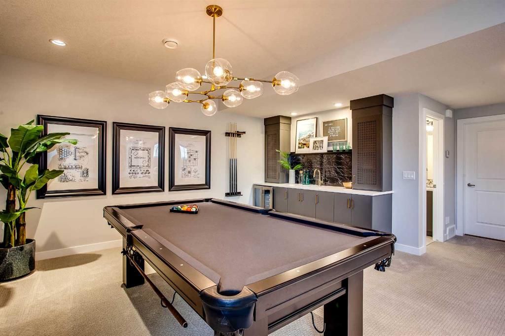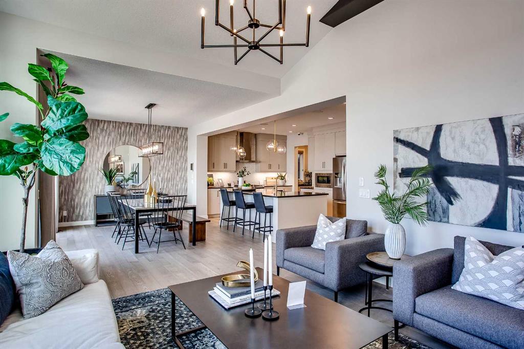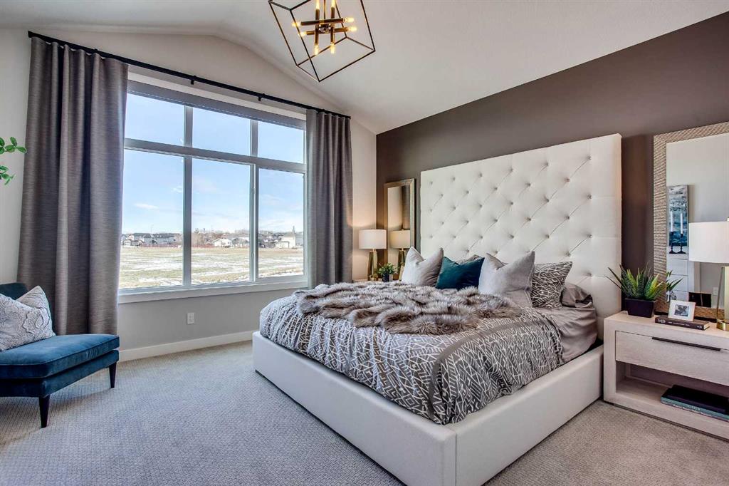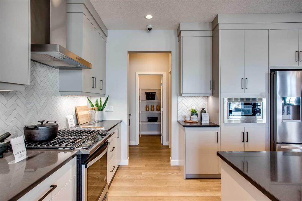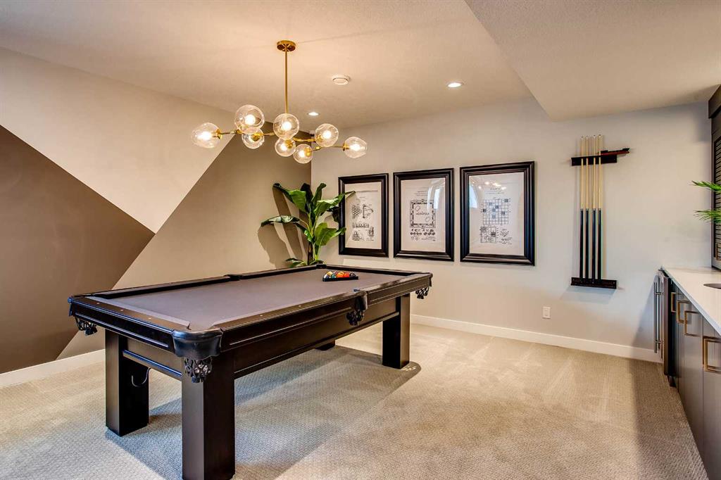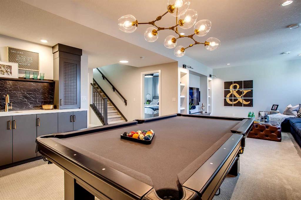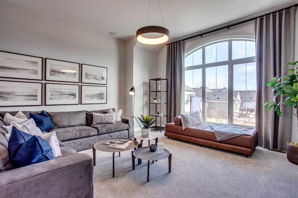 Exquisite Former Show Home with Majestic Mountain Views. Welcome to the "Hennessy III" by Calbridge Homes, an award-winning former show home where sophisticated designer upgrades meet an unparalleled lifestyle location. Backing onto a serene green space with a coveted west-facing backyard, this residence offers a front row seat to breathtaking Rocky Mountain sunsets. The interior is bathed in natural light, highlighted by wide-plank hardwood floors and custom designer lighting throughout an open-concept layout masterfully planned for both intimate family life and grand-scale entertaining. The gourmet chef's kitchen serves as the heart of the home, featuring full-height cabinetry, a massive breakfast bar island, premium stainless steel appliances with a gas range, and a substantial butler's pantry for seamless organization. In the grand great room, soaring vaulted ceilings with wood beams and a tiled fireplace create a sense of scale, while a signature wall of windows perfectly frames the outdoor oasis. For those seeking a quiet workspace, elegant French doors lead to a dedicated den perfect for a sophisticated home office. The upper level is a true sanctuary of comfort, led by a primary retreat featuring a massive walk-in closet and a spa-inspired ensuite with dual vanities, an oversized shower, and a deep soaker tub. A versatile central bonus room offers the ideal loft space for movie nights, complemented by three additional bright bedrooms, a full family bathroom, and a conveniently located laundry room. The professionally finished basement significantly extends the living space, offering a massive recreation area and a fully equipped wet bar with a beverage fridge. A large fifth bedroom and full bathroom provide a private suite for guests or older children. Complete with a generous triple-car garage, this home is close to the incredible walking paths that lead you throughout the parks and playgrounds this community has to offer. Enjoy unbeatable convenience being just minutes from the C-Train, YMCA, community center, and a vibrant array of local shops and dining. Experience the pinnacle of craftsmanship and scenery in this rare property. Call today for your personal viewing.