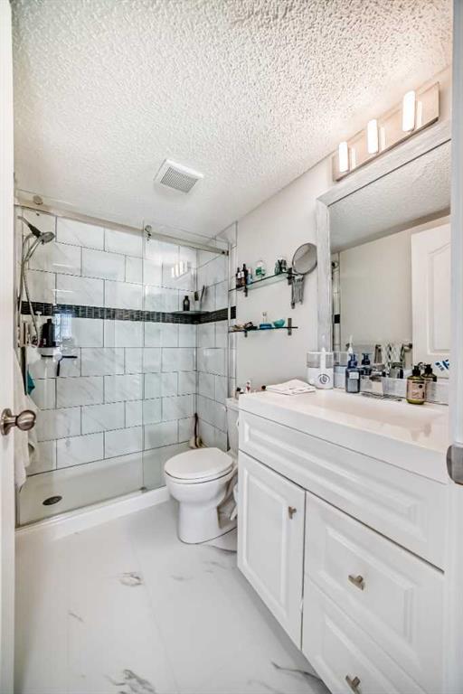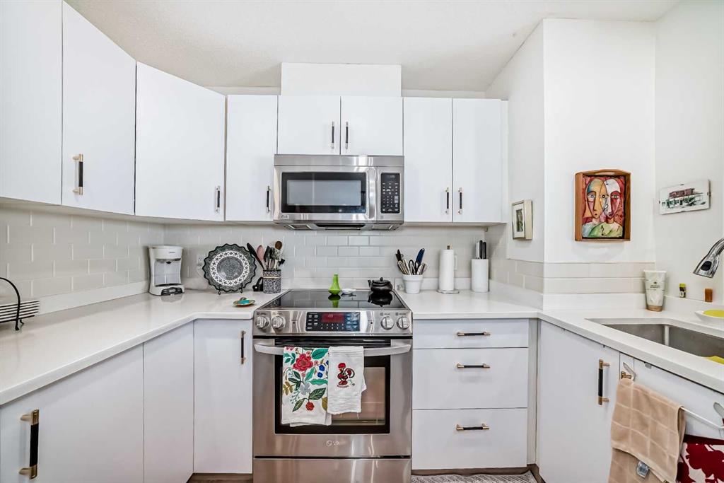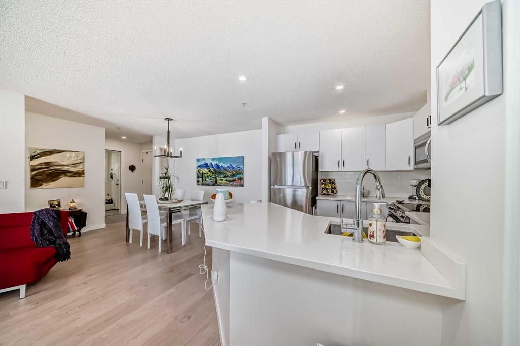 Welcome to this beautifully upgraded, quiet retreat that perfectly balances modern style with ultimate convenience. Situated with easy access to Stoney and MacLeod Trails, walking distance to the Somerset-Bridlewood C-Train station and the shops/services within the Shawnessy shopping district, this unit offers a peaceful sanctuary without sacrificing proximity to top-tier amenities. Step onto wide-plank laminate flooring in a warm, natural finish that flows throughout the open-concept layout. The heart of the home is a cozy living area anchored by a tiled surround gas fireplace. The entire space is bright and airy, illuminated by contemporary recessed lighting, modern light fixtures and natural West exposure. The stunning white kitchen is a masterclass in modern design, featuring chic black and brass pulls, durable, elegant quartz countertops, a full suite of S/S appliances, large workspace with an integrated sink and dishwasher. This split functional floor plan boasts 2 spacious bedrooms and 2 full bathrooms. The primary suite serves as a true escape, complete with an ensuite bathroom featuring a large walk-in shower. The second bathroom features a deep soaker tub. Additional features include a private balcony equipped with a gas BBQ hook-up. In suite washer, dryer and storage area PLUS a titled underground stall AND titled storage cage (a rarity in this building). Quiet, stylish, and perfectly located—this unit is a must-see!