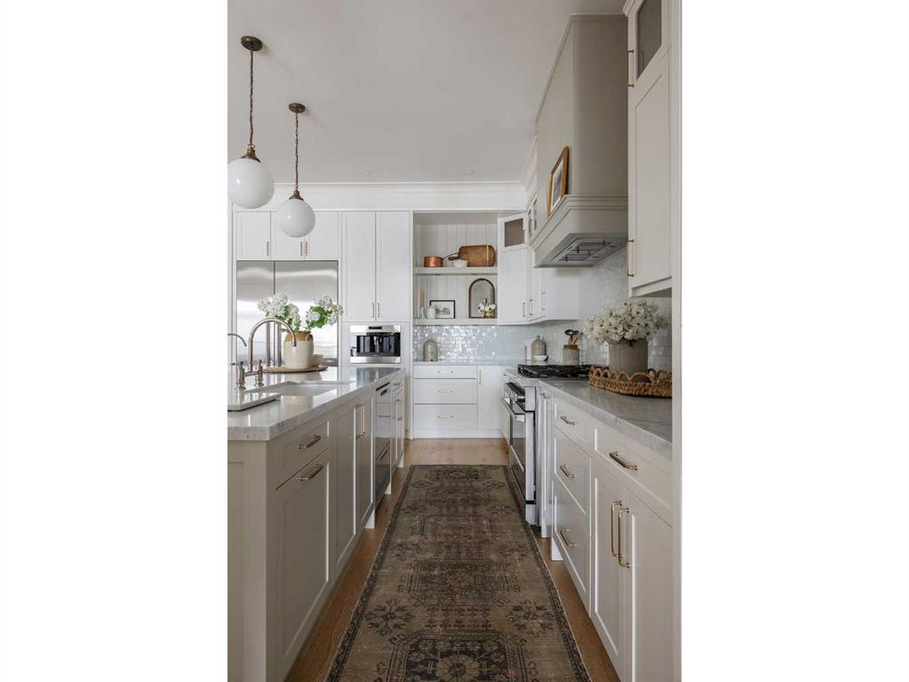Timeless elegance and effortless living come together in this stunning modern home, offering over 4,300 square feet of beautifully finished living space. The upgraded kitchen is the heart of the home, featuring white cabinetry anchored by a warm greige island, marble countertops, and a handmade Zellige tile backsplash. A premium appliance package includes Fisher & Paykel appliances with a gas range, a 48-inch built-in fridge/freezer combination, and a built-in microwave, complemented by a built-in Wolf coffee maker and statement range hood. Designer lighting and a thoughtfully designed pantry complete the space. A reverse osmosis system at the kitchen sink and a whole-home water softener enhance everyday living. The open-concept main floor flows seamlessly into a generous dining area and inviting living room, anchored by a gas fireplace with built-in shelving. An 8-foot sliding door and oversized window fill the space with natural light and provide direct access to the backyard. Elegant custom window coverings are featured throughout the home. A private main floor office offers a quiet workspace, while the well-designed mudroom keeps everyday essentials neatly organized. Upstairs, the primary suite is a true retreat with vaulted ceilings and a striking floor-to-ceiling brick fireplace. The spa-inspired ensuite features dual vanities, a deep soaker tub, heated floors, and a spacious walk-in closet. Two additional bedrooms, a four-piece bathroom, and convenient upper-level laundry complete the floor. The third floor is a standout space, perfect for hosting or relaxing, with a spacious lounge and games area, wet bar, full bathroom, and access to a private balcony. The bright fully finished basement offers a large recreation room with wet bar, a versatile flex space ideal for a home gym, and a private fourth bedroom with a full bath. Outside, the fully fenced backyard is beautifully landscaped with perennials, fruit bushes, and a young apple tree, along with a generous patio ideal for summer gatherings. The detached triple garage includes 200-amp electrical service and an EV charger. Ideally located steps from Sandy Beach Park, the Elbow River pathways, and the shops, dining, and amenities of Marda Loop, this home offers an exceptional inner-city lifestyle.