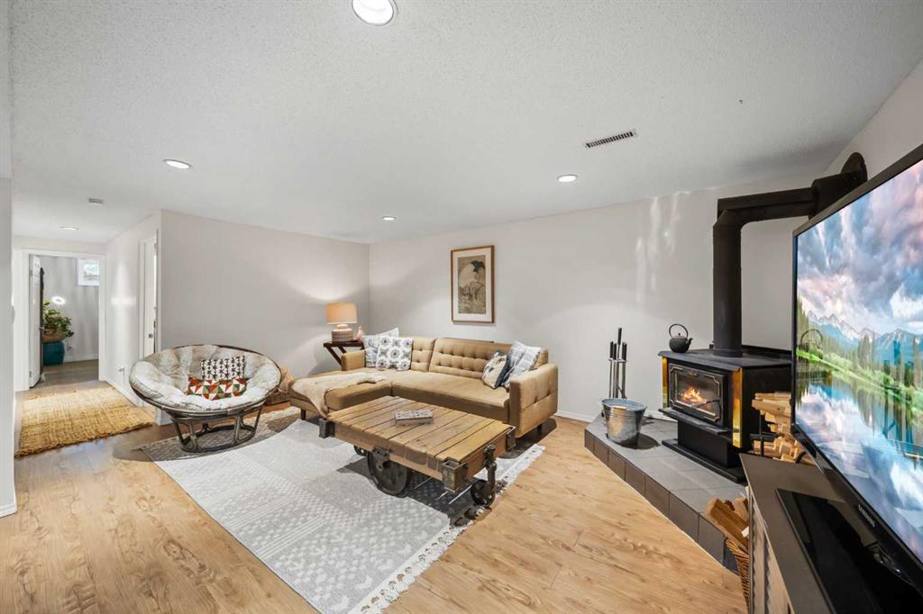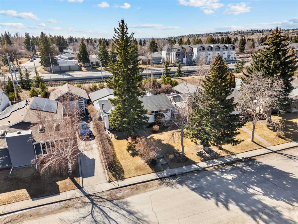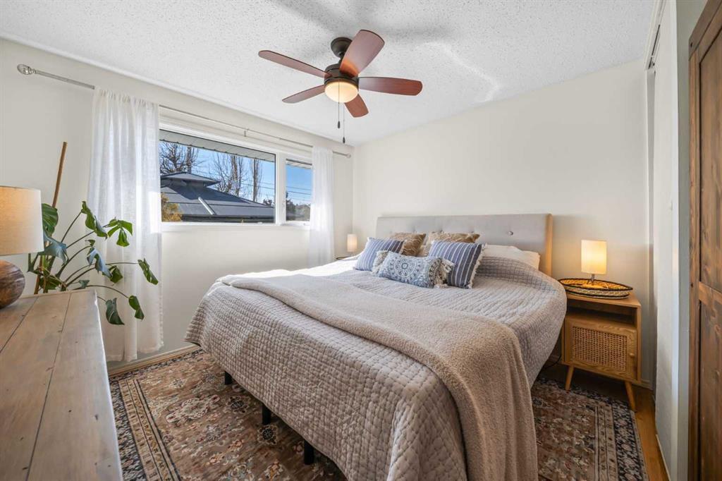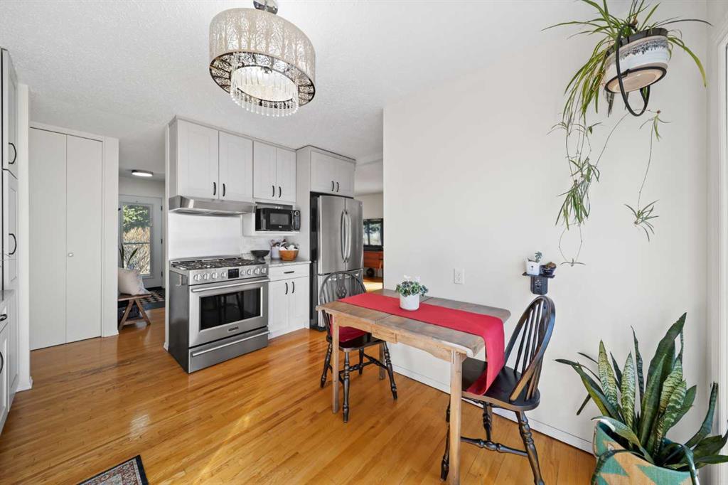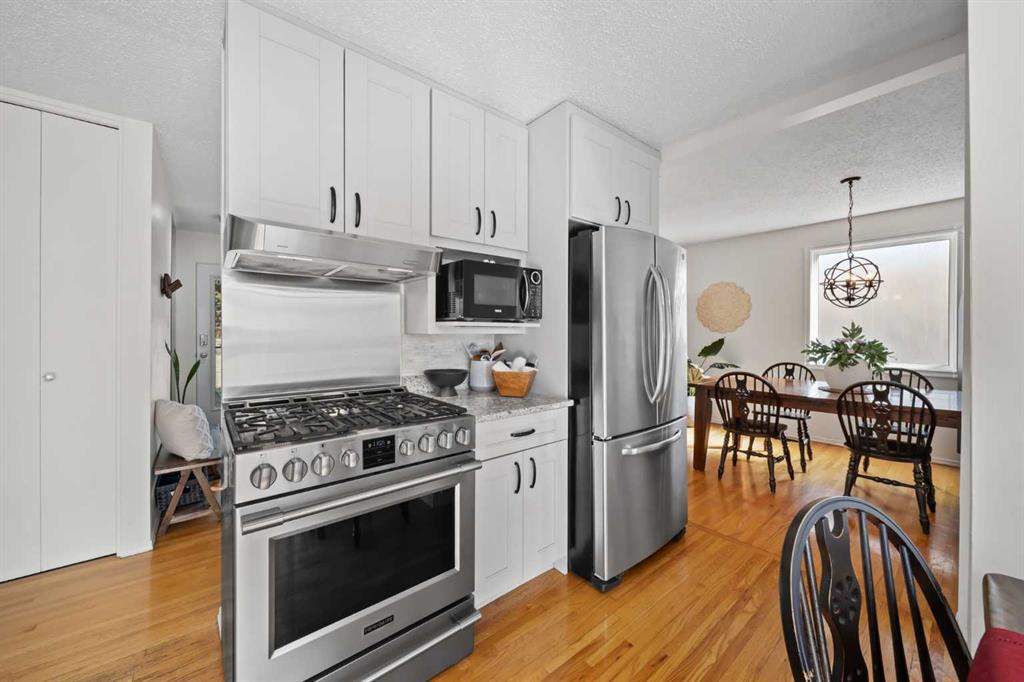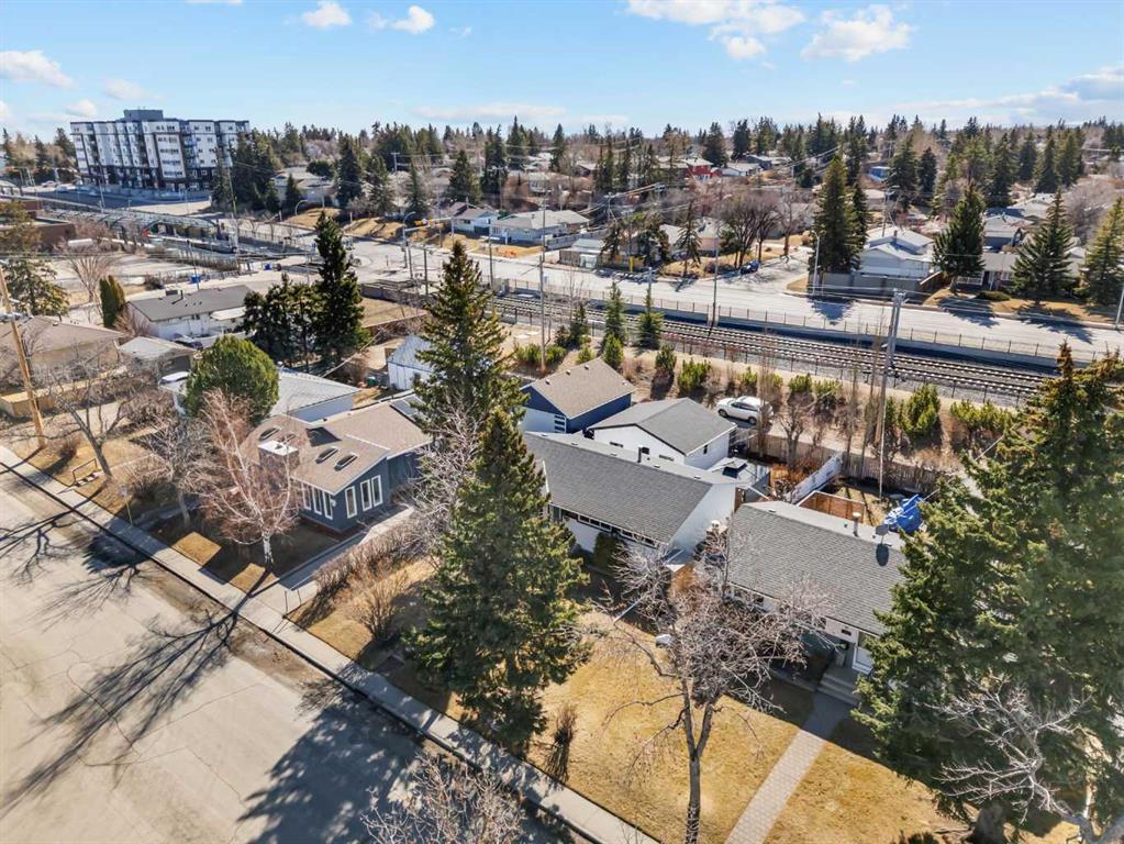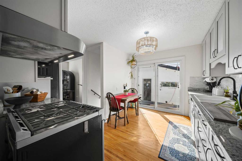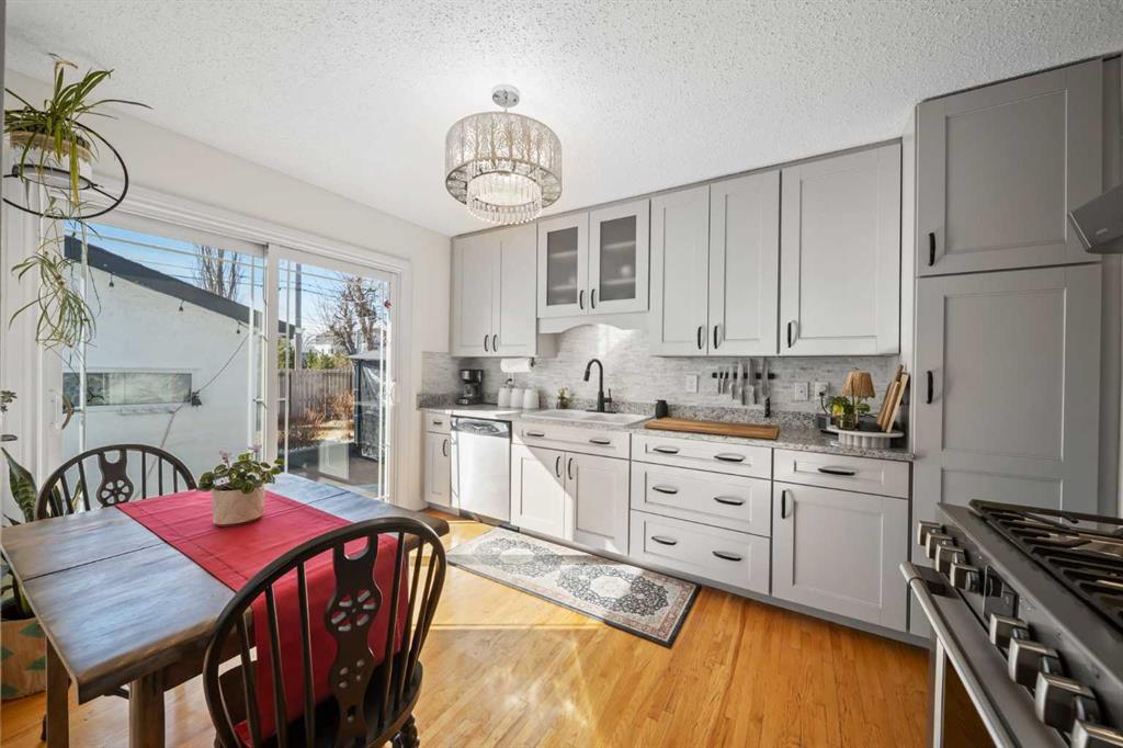 This well-maintained 1960 bungalow offers over 1,900 sq. ft. of developed living space, featuring 5 bedrooms (3 up, 2 down) and 2 full bathrooms. The main floor showcases gleaming original hardwood flooring, a welcoming and spacious living room and a bright dining area. Enjoy the benefit of a freshly painted main floor, along with an updated 4-piece bathroom. The sun-filled, south-facing kitchen opens through patio doors to a private backyard retreat. Thoughtfully updated in 2014, the kitchen features classic cabinetry, luxurious granite countertops, upgraded appliances, and a gas stove—perfect for everyday living and entertaining. A separate side entrance provides access to both levels, offering excellent potential for an additional living space within the current functional layout. The fully finished basement includes 2 bedrooms, a 3-piece bathroom, a versatile flex room, and a large family room complete with a cozy wood-burning stove—ideal for relaxing or movie nights with family & friends. The mechanical/laundry room includes a newer washer and dryer, a brand-new hot water tank (December), and a regularly serviced furnace. Significant updates over the years include newer windows, laminate flooring, and shingles approximately 10 years old. Enjoy the beautifully maintained, sunny south-facing yard where outdoor living extends the home with a true backyard oasis. An oversized garage features a new overhead door, two openers with smart technology, and an extended parking pad for guests. A landscaped berm with mature trees behind the property provides a natural buffer from 17 Ave and the LRT, creating a surprisingly quiet and private setting. Pre-inspection completed with key items addressed, offering added confidence for buyers. Ideally located with unbeatable proximity to downtown and an easy commute, this home is close to transit with a short walk to the LRT, and just minutes to Westbrook Mall, Edworthy Park, schools (including French Immersion), shopping, and services—with quick access west to the mountains. Move in before summer and start enjoying your new home!