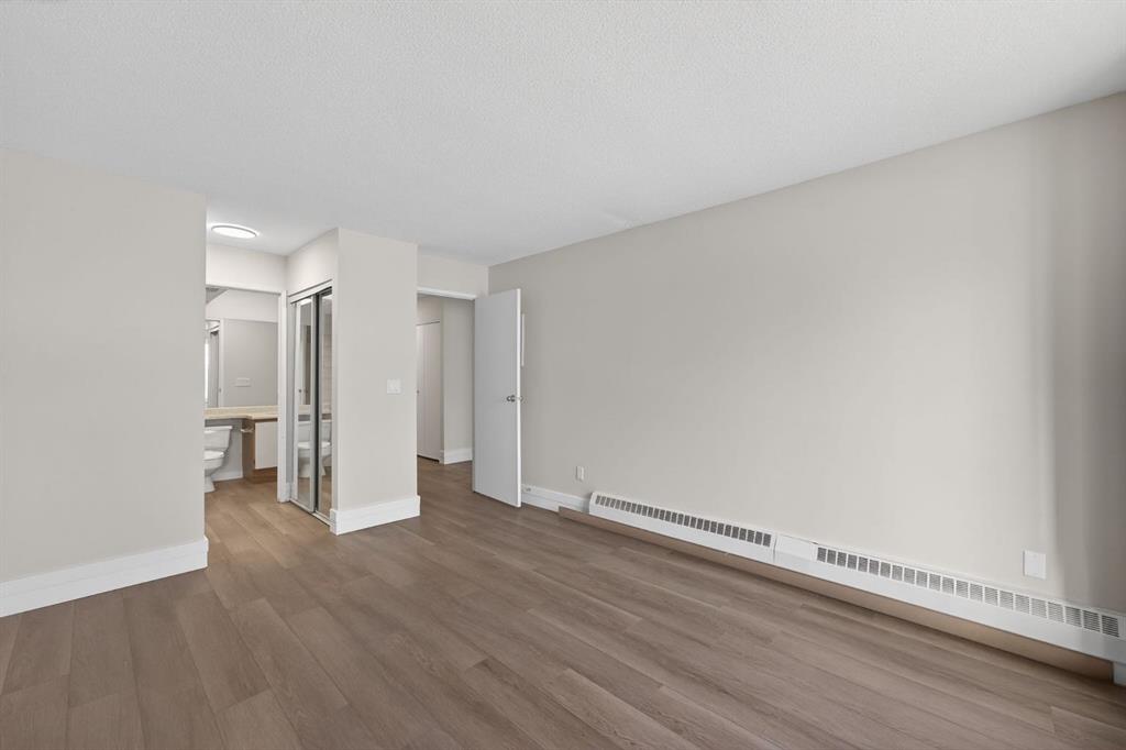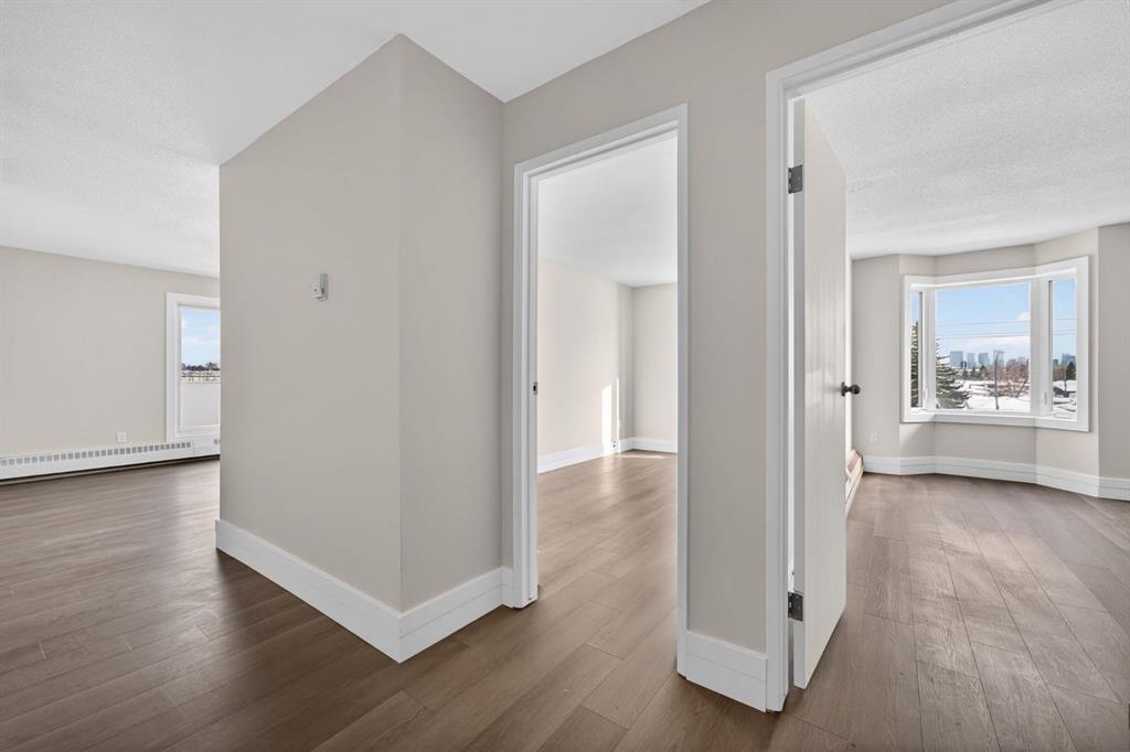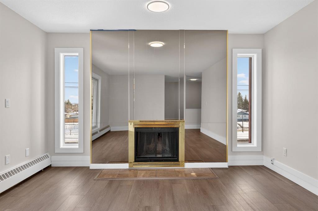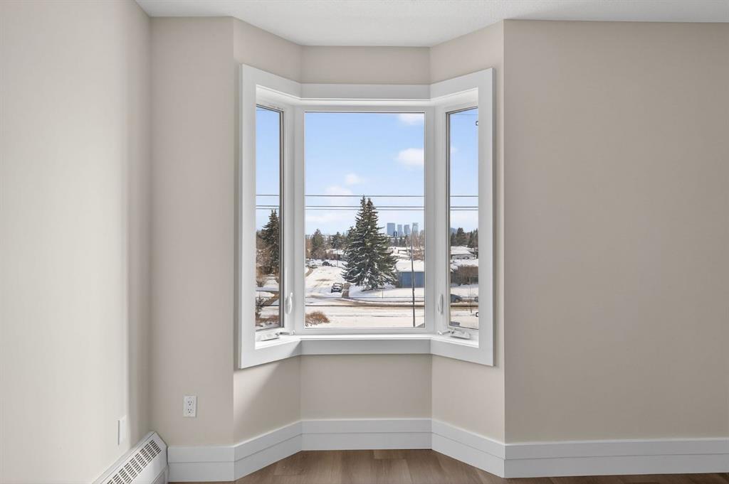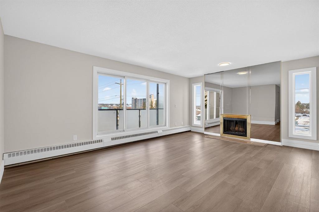Welcome to this just renovated, 3rd floor corner unit offering over 1,000+ SF of beautifully updated living space. Featuring brand new paint, flooring, and modern lighting, this bright and open 2 bedroom, 2 bathroom condo is truly move in ready. The spacious layout includes a large dining area and a stylish kitchen with dual toned cabinetry, quartz countertops, subway tile backsplash, and stainless steel appliances. Enjoy an abundance of natural light through oversized windows and sliding patio doors leading to your private balcony, perfect for summer days, while the cozy wood burning fireplace adds warmth and charm in the winter. The primary bedroom easily accommodates a king sized bed and features a built in wardrobe and 3 piece ensuite, while the second bedroom and full 4 piece bathroom complete the space. Additional highlights include laminate flooring throughout, updated baseboards, casings, and doors, plus the comfort of a quiet concrete building with no party wall noise. This home also comes with secure, heated underground parking. The building has seen major updates including newer windows and composite siding. Ideally located with quick access to the airport, Deerfoot Trail, shopping, schools, and downtown, this is a fantastic opportunity for first time buyers and investors alike. A must see!