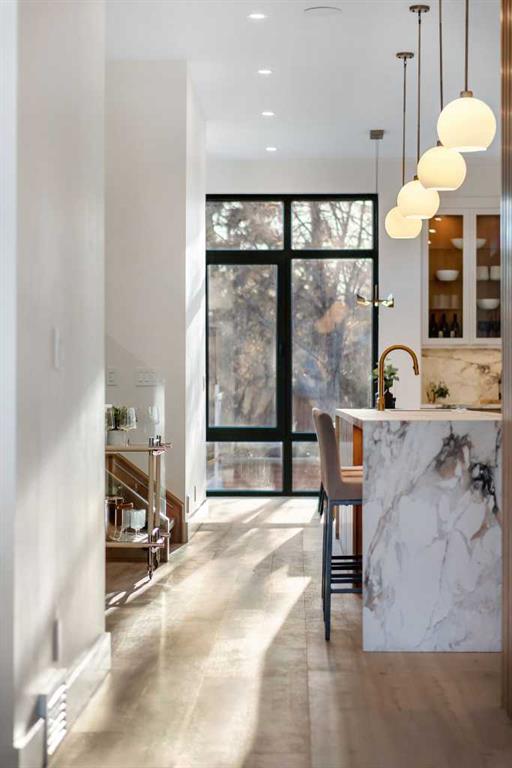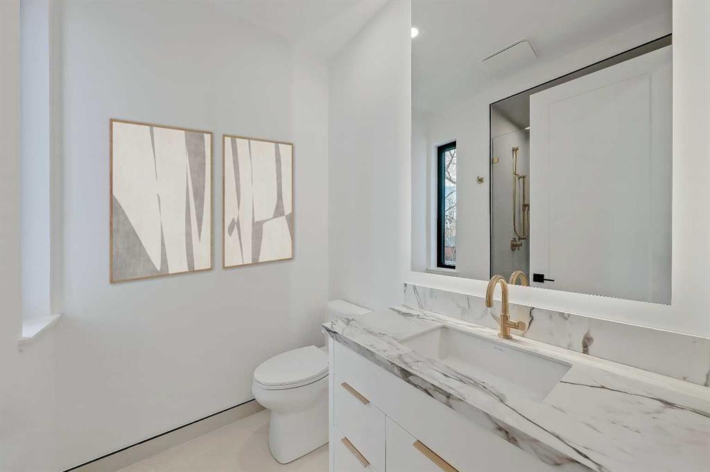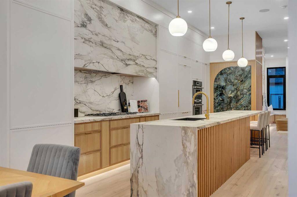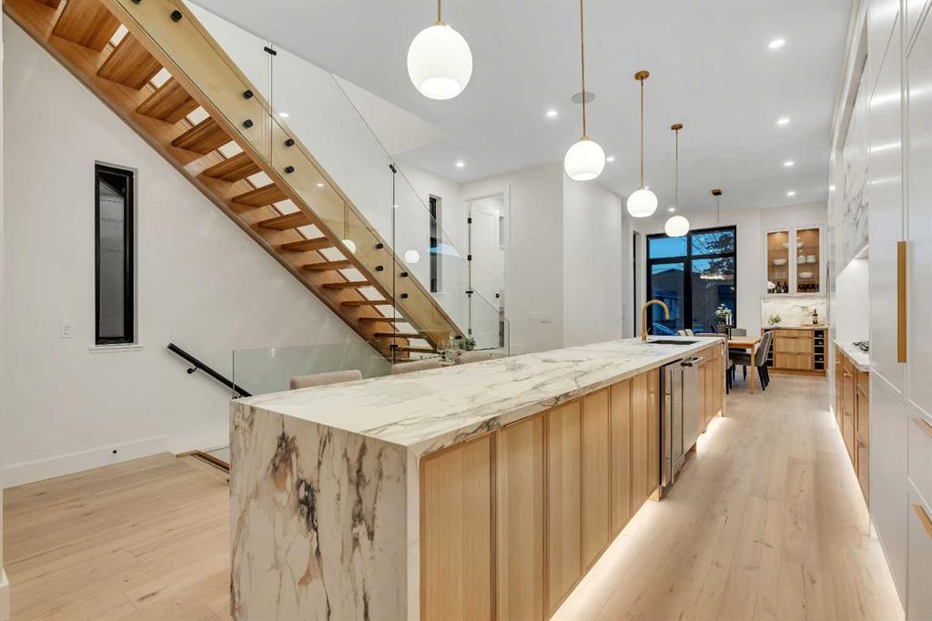 Architectural distinction meets contemporary luxury in this newly built custom home designed by JTA Design and expertly built by Brick Developments. Located in the heart of Inglewood, one of Calgary’s most iconic inner-city communities, the residence features steep-pitched rooflines, timeless brick detailing, and expansive windows that blend modern design with enduring architectural character. Steps from the Bow River pathways and surrounded by Inglewood’s renowned shops, restaurants, music venues, and breweries, the location offers an exceptional inner-city lifestyle. The open-concept main floor is designed for elevated living & entertaining, showcasing high ceilings, wide-plank hardwood flooring, and curated designer finishes. The chef’s kitchen features full-height custom cabinetry, HONED PORCELAIN countertops, backsplash & hood fan, a stunning PORCELAIN feature wall with built in clock, concealed walk-in pantry, waterfall island, and a premium THERMADOR appliance package including gas cooktop, wall oven, integrated refrigerator & dishwasher, and a beverage fridge. The dining area includes a statement chandelier and built-in buffet with wine storage and glass custom cabinetry, while the living room offers a custom media wall, inset gas fireplace, and full-height quartz surround overlooking the private backyard. A mudroom, powder room, and striking full-height GLASS WALL staircase complete the main level. Upstairs, the primary suite features vaulted ceilings, an expansive walk-in closet with custom built-ins, offering refined storage & functionality, and a spa-inspired ensuite with heated floors STEAM SHOWER, dual vanities, and freestanding soaker tub. A spacious laundry room with quartz counter, built-in cabinetry, and sink, along with two additional bedrooms—each offering PRIVATE ENSUITES with HEATED tile floors and walk-in closets nicely round off this level. The fully developed basement features radiant in-floor heating, soaring 10-FT ceilings, and an expansive recreation area with a built-in media centre. A custom wet bar with sink & microwave drawer, dedicated home gym, fourth bedroom, three-piece bathroom, and a discreet pocket office with built-in workstation complete the level. Outside, the home is professionally landscaped and complemented by a fully finished garage with gas rough-in for a future heater. This is an exceptional opportunity to own a thoughtfully designed architectural home in one of Calgary’s most sought-after inner-city communities.
