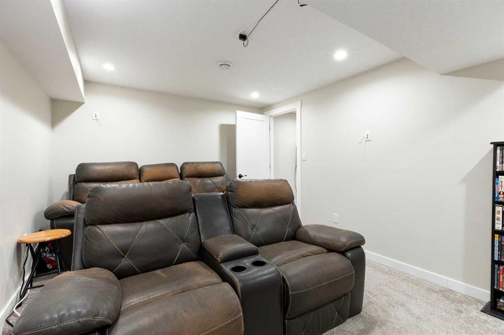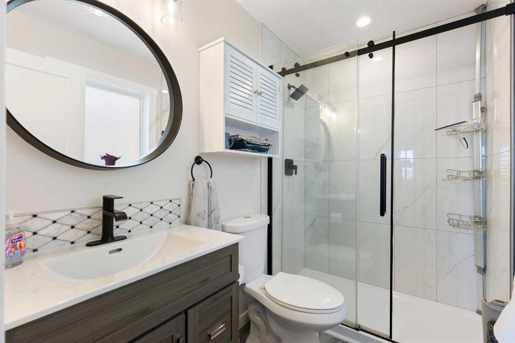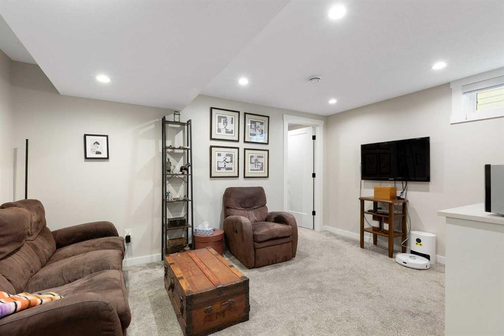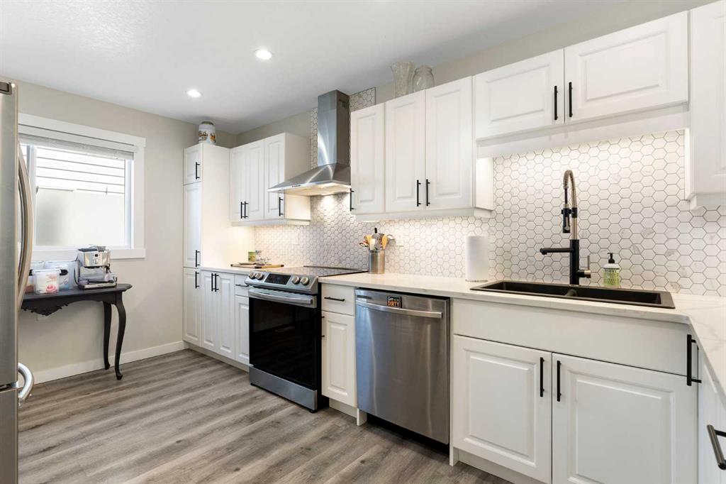 Welcome to elevated bungalow living in this exquisitely renovated 2,286 sq. ft. home, thoughtfully redesigned from top to bottom with high-end finishes, modern upgrades, and exceptional attention to detail. Offering 5 bedrooms, 3 bathrooms, a dedicated office, single attached garage, and brand new air conditioning, this is far from your typical renovation. From the moment you step inside, the vaulted ceilings and open-concept layout create an immediate sense of space and sophistication. Warmth and character are felt throughout, from the stunning feature ceiling and statement fireplace wall to the skylight and large bay window that flood the main living area with natural light. The beautifully renovated kitchen is designed to impress, complete with upgraded stainless steel appliances, premium quartz countertops, tiled backsplash, crisp white cabinetry, and seamless flow into the separate dining area—perfect for everyday living and entertaining alike. The spacious primary bedroom offers a peaceful retreat with a generous closet and elegant 3-piece ensuite. Two additional bedrooms and a stylish 4-piece bathroom complete the main floor. Downstairs, the fully developed basement adds incredible flexibility and function with plush carpeting, a large family room with wet bar, and a separate entertainment room wired for 7.1 surround sound. This level also includes a spacious office, two additional bedrooms with egress windows, a 3-piece bathroom, and a beautifully finished laundry room featuring quartz countertops, tiled backsplash, and a convenient sink. Extensive upgrades include a high-efficiency furnace, hot water tank, doors, windows, garage door, stucco siding, newer roof, and permanent outdoor lighting that adds both curb appeal and ambiance. Outside, the low-maintenance yard offers a newer deck and fence, creating a private outdoor space to relax and unwind. Tucked away on a quiet street, this exceptional home is ideally located close to schools, parks, shopping, transit, and major roadways—offering the perfect balance of convenience and tranquility.