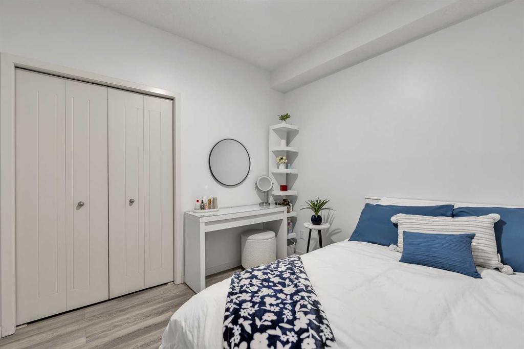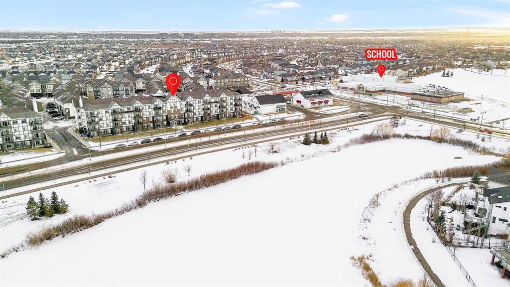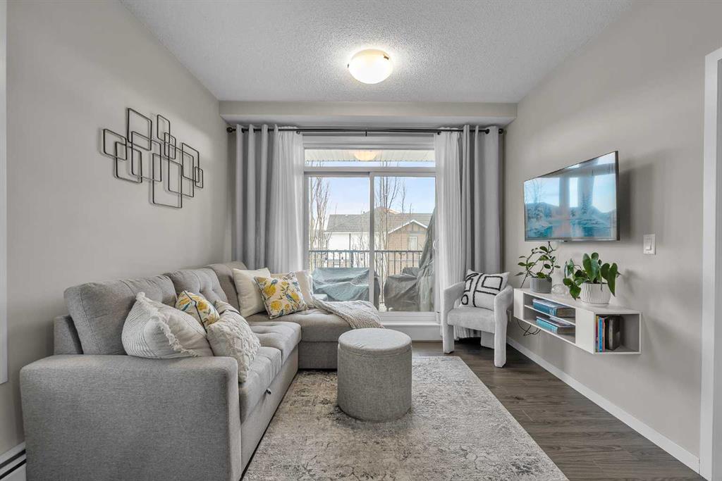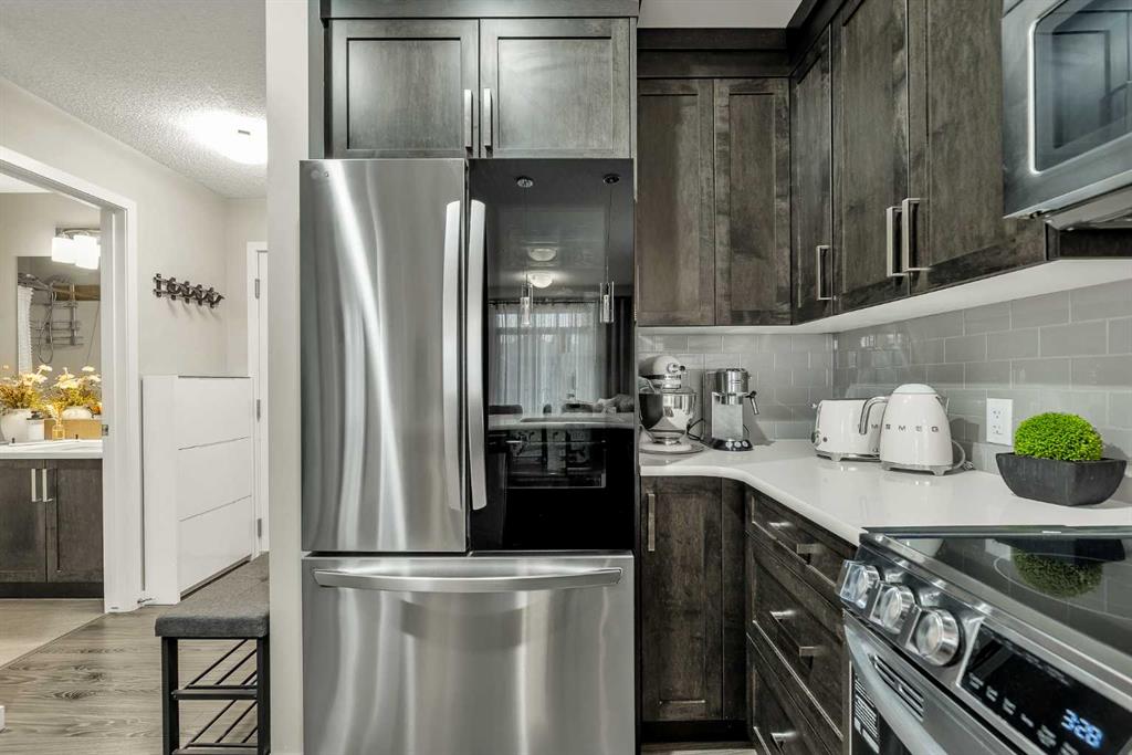 Welcome to this BRIGHT CORNER UNIT in the heart of New Brighton, offering fantastic value in a well established community. This inviting TWO BEDROOM CONDO features over 600 SQ FT OF LIVING SPACE, with 9FT CEILINGS and large windows that fill the home with natural light. The kitchen is beautifully finished with QUARTZ COUNTERTOPS, DARK CABINETRY, and NEWER STAINLESS STEEL APPLIANCES, including a HIGH END FRIDGE, NEWER STOVE, and a space saving over the range microwave. A peninsula provides extra prep space and a convenient eating bar, making it perfect for both everyday living and entertaining. The living area opens onto a SUNNY COVERED BALCONY WITH BBQ GAS LINE, ideal for relaxing or hosting in warmer months while enjoying a quiet outlook over the complex. Both bedrooms are SIMILAR IN SIZE, each with LAMINATE FLOORING and SPACIOUS CLOSETS, and are thoughtfully positioned for privacy. The FOUR PIECE BATHROOM continues the quartz finishes and includes a DEEP TUB AND SHOWER COMBO. Additional features include IN SUITE LAUNDRY, NO CARPET, LAMINATE AND TILE FLOORS THROUGHOUT, ASSIGNED SURFACE PARKING STALL 58, STORAGE LOCKER 9 LOCATED IN THE PARKADE, and access to a BICYCLE STORAGE ROOM. This WELL MANAGED COMPLEX WITH LOW CONDO FEES is ideally located close to PARKS, SCHOOLS, SHOPPING AT 130 AVE AND HIGH STREET, TRANSIT, and with quick access to DEERFOOT AND STONEY TRAIL. A perfect opportunity for FIRST TIME BUYERS, INVESTORS, or anyone looking for a bright, low maintenance home in a great community. Residents also enjoy exclusive access to the NEW BRIGHTON RESIDENTS ASSOCIATION, offering YEAR ROUND AMENITIES such as a SPLASH PARK, TENNIS COURTS, VOLLEYBALL, a HOCKEY RINK, FITNESS CLASSES, and a wide range of COMMUNITY EVENTS. This home SHOWS BEAUTIFULLY and is PET FRIENDLY WITH BOARD APPROVAL. BOOK YOUR PRIVATE SHOWING TODAY.