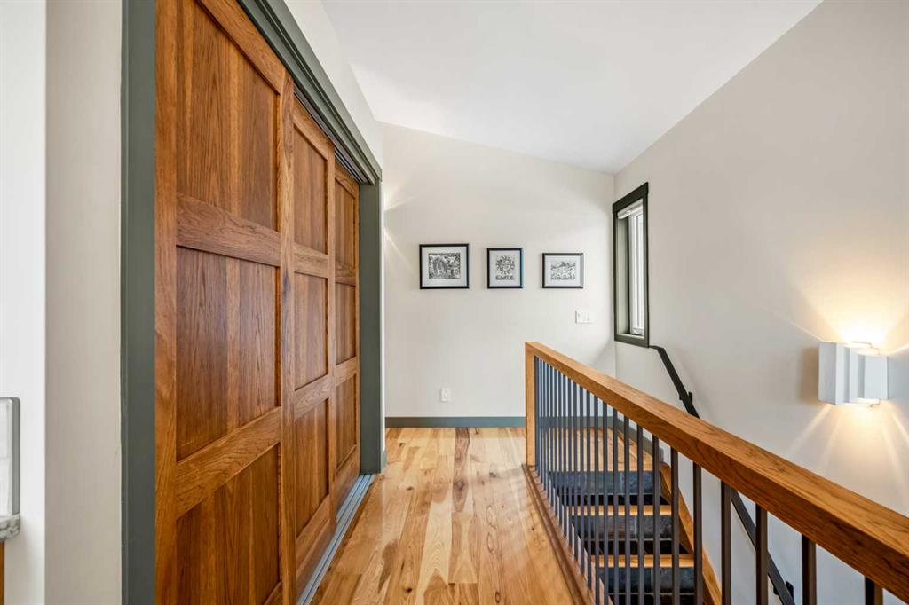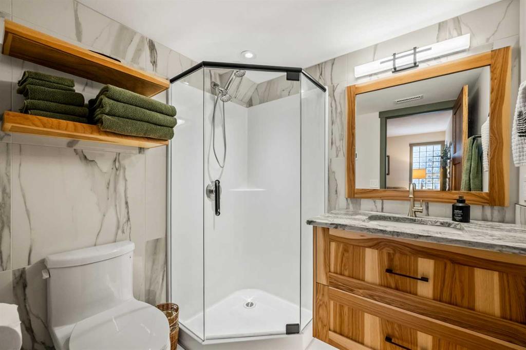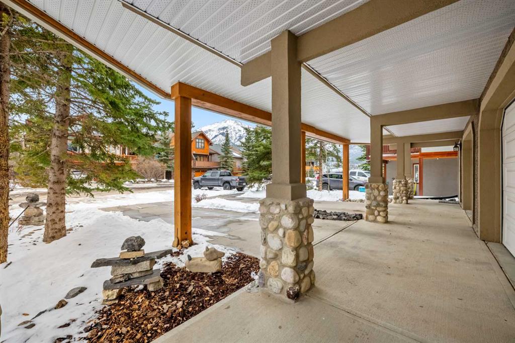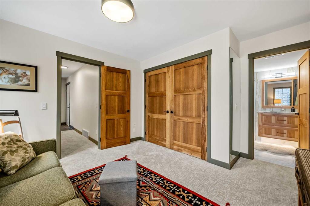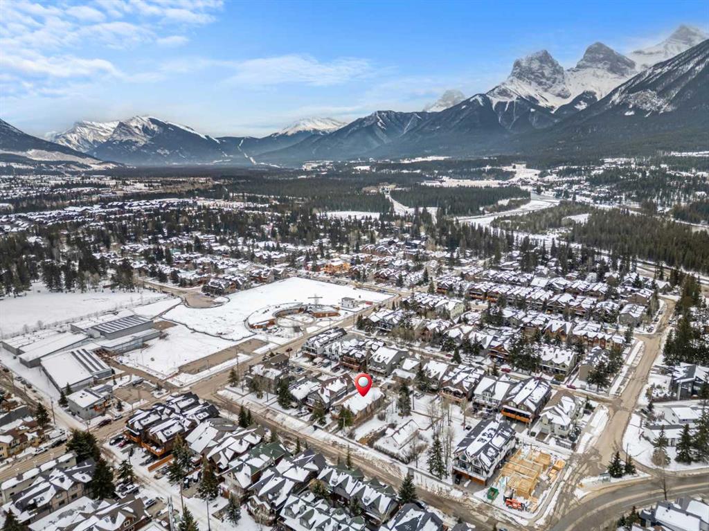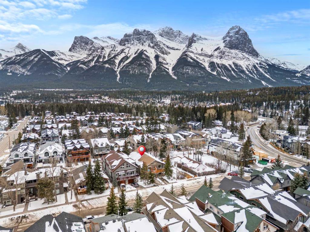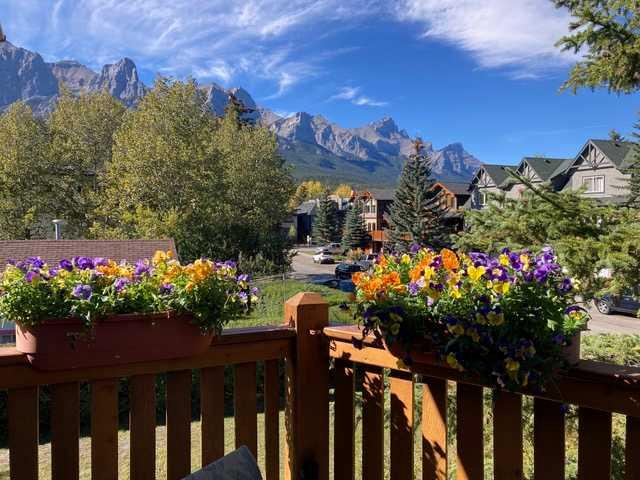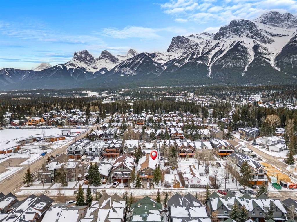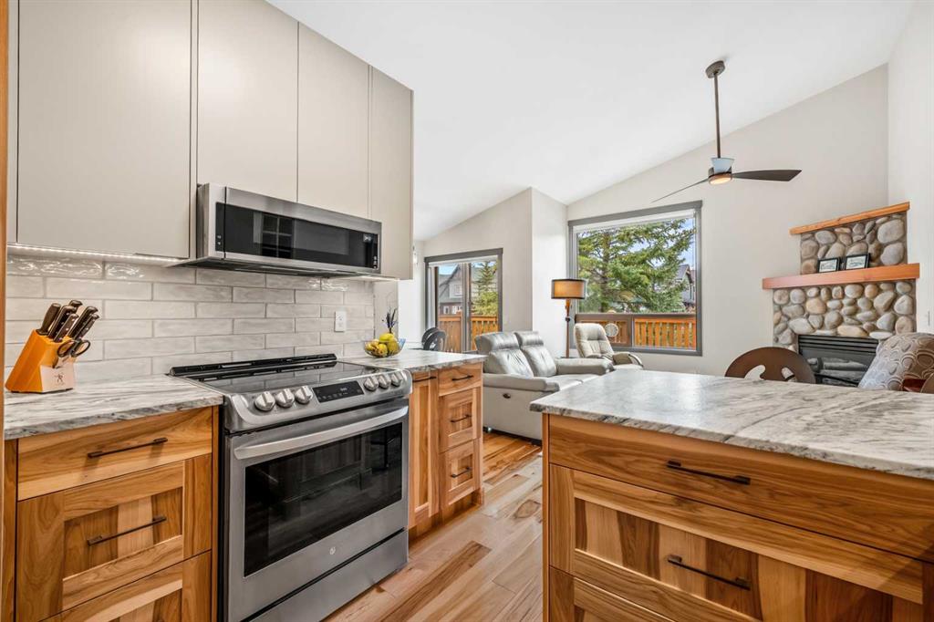 Fully furnished & turn-key, this meticulously renovated executive townhome in coveted South Canmore is a rare find — just steps from the Bow River with breathtaking mountain views and no detail left untouched. Located in one of Canmore's most desirable neighbourhoods, this beautifully updated 4-plex unit has been comprehensively transformed by the original owner with premium finishes throughout. Rich Hickory hardwood floors and custom Hickory interior doors flow through the open-concept living and dining area beneath soaring vaulted ceilings, anchored by a stunning river rock fireplace. The private deck and living room frame spectacular Rocky Mountain views year-round. The custom chef's kitchen is a true showpiece featuring quartzite countertops, under-cabinet lighting, and a full suite of premium appliances including an LG induction range, Bosch dishwasher, French door LG refrigerator, and Whirlpool microwave. Thoughtful design details include all-lower-drawer cabinetry, a dedicated spice cabinet, integrated recycling, garburator, and a custom pantry complete with wine racks and dedicated electrical outlets. The main floor hosts the primary bedroom alongside same-floor laundry — offering effortless everyday living. The lower level features a generous guest bedroom with private ensuite and the added luxury of in-floor radiant heating. Both bathrooms are completely new with quartzite countertops and all-new plumbing fixtures throughout. Pre-wiring in the stairwell for a future chair lift, USB-integrated outlets, and night light receptacles reflect the thoughtful, forward-thinking nature of this renovation. All-new Hunter Douglas window coverings, custom-built railings, new fans, all-new light fixtures, fresh interior paint, and a new hot water heater complete this exceptional package. Street-side access with an attached garage and low-maintenance stucco exterior round out a property designed for sophisticated, lock-and-leave mountain living. South Canmore offers walkable access to the Bow River pathways, boutique dining, and world-class recreation. Sold fully furnished — simply arrive and enjoy everything the Canadian Rockies have to offer. *Note: No Nightly/short term rentals allowed*