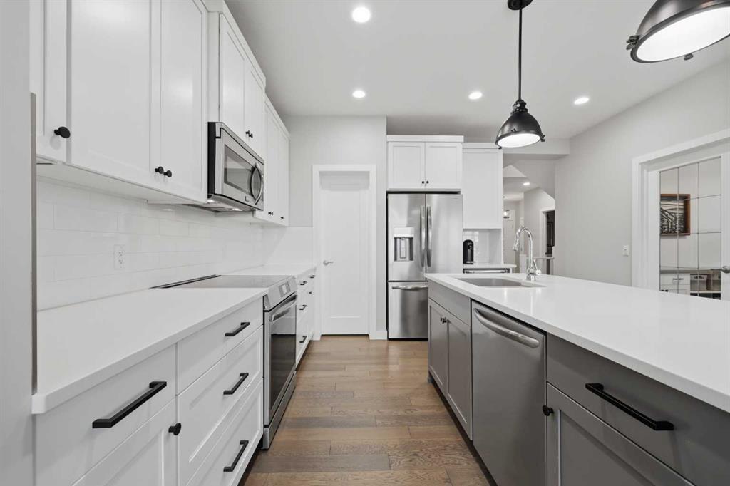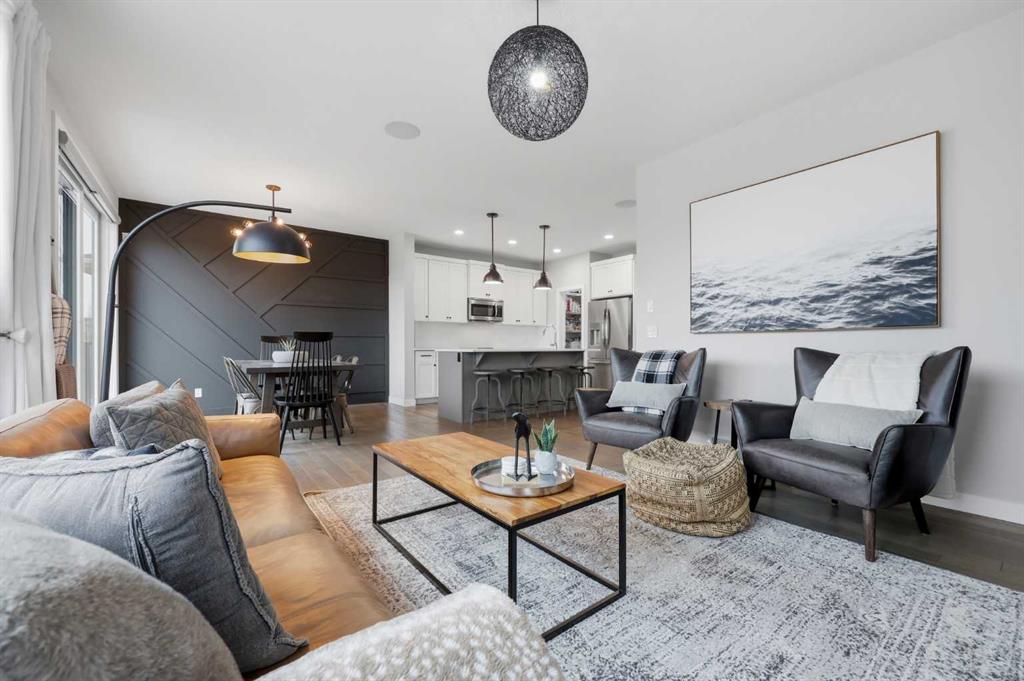 Welcome to one of Walden's premier addresses, offering more than 3,000 sq ft of thoughtfully planned living space. Every detail has been carefully elevated beyond builder standards. Positioned on a rare pie-shaped lot at the end of a quiet cul-de-sac and backing onto expansive green space, this home offers privacy, unobstructed views, and a strong sense of community in an exceptional setting. Natural light fills the main floor, highlighting the contemporary two-toned kitchen with premium appliances, quartz countertops, a composite granite sink, designer backsplash, and a spacious pantry for simple organization. The living room is anchored by a cozy gas fireplace and features bright south-facing windows. The dining area benefits from a custom feature wall as an eye-catching centrepiece and easy access to the elevated deck with peaceful views. The entry provides built-in storage and hooks to keep everyday life organized. A main floor half bath and a versatile room with built-in shelving offer flexibility, ideal for a private home office or study. Upgraded pot lights and a curated lighting package create a warm, polished ambiance throughout. A wired Sonos Home sound system delivers premium audio throughout the home, perfect for entertaining or everyday enjoyment. Upstairs, the primary bedroom features a large 4pc ensuite with quartz countertops, upgraded fixtures, and a walk-in closet. The bonus/family room impresses with large windows, a custom built-in desk with drawers, and a decorative wood feature wall, perfect for media, play, or work. Two additional spacious bedrooms and a full 4pc bathroom provide comfort for your entire family. The upper laundry room includes shelving for convenient storage and easy routines. The fully developed walk-out basement offers flexibility, with a generous bedroom, a full 4pc bathroom, and direct access to a concrete patio and beautifully landscaped, south-facing yard. The pie-shaped lot ensures the space is utilized where it matters most, resulting in a private backyard retreat with unobstructed field views. A triple tandem garage is a rare asset in Walden, perfect for extra vehicles, additional storage, or a dedicated workshop. Full central A/C and Wi-Fi-controlled LED holiday lighting on the home's front add seasonal charm. Tucked at the end of a quiet cul-de-sac, this home is an exceptionally rare property in an established, amenity-rich community. This is the one discriminating buyers have been waiting for.