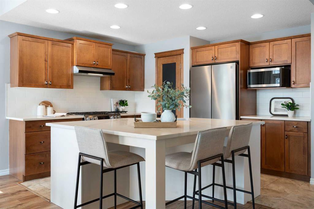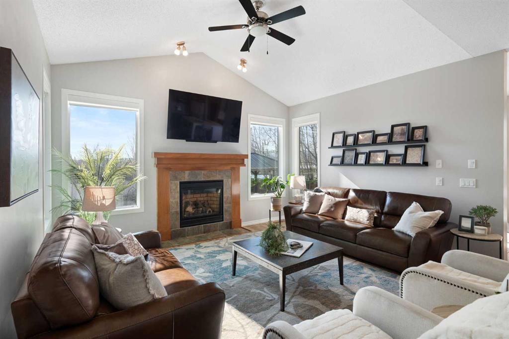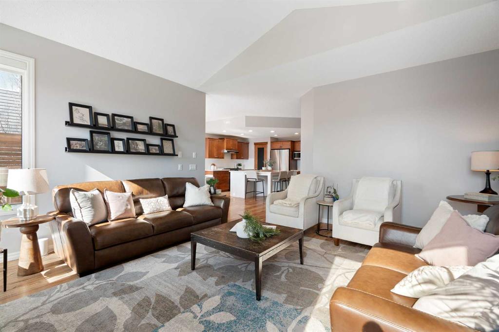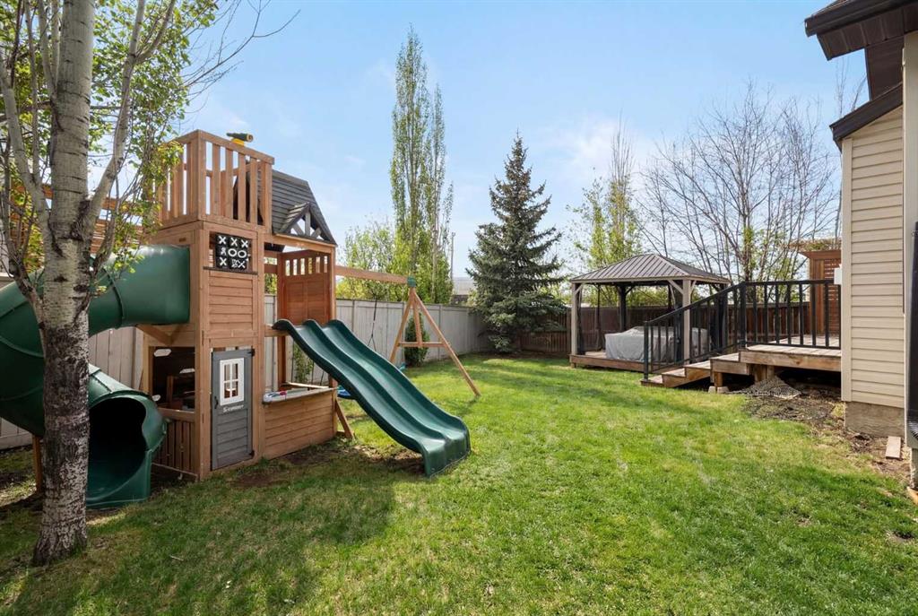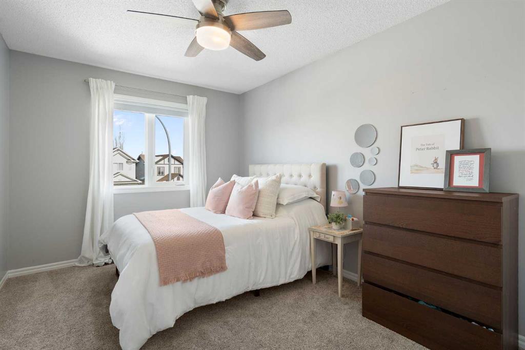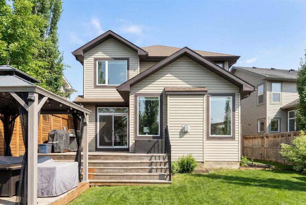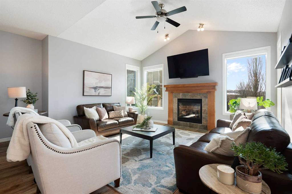 Hello, Gorgeous! Welcome to 142 Coopers Bay SW in Airdrie, located in the highly sought-after community of Coopers Crossing. This fully developed two-storey home offers over 2,200 sq ft above grade, 4 bedrooms, and 3.5 bathrooms, providing a functional layout suited for family living. The main floor features a spacious living room with a gas fireplace and large windows for natural light. The kitchen has been updated with a renovated island, countertops, and backsplash, along with newer appliances including a stove (2024), dishwasher (2025), hood fan (2025), washer and dryer (2025), and refrigerator (2026). A dining area, breakfast nook, main-floor laundry, and 2-piece bathroom complete this level. Upstairs includes a primary bedroom with a walk-in closet and 5-piece ensuite featuring dual sinks, a soaker tub, and separate shower. Two additional bedrooms, a 4-piece bathroom, and a bonus room provide additional living space. The fully developed basement includes a recreation room with a second gas fireplace, a fourth bedroom, a 3-piece bathroom, and storage space. Additional features include air conditioning, a heated double attached garage, and added insulation in the attic and garage. Situated on a large south facing pie-shaped lot in a quiet cul-de-sac, the property offers a fully fenced yard with a deck and is located close to parks, pathways, schools, and amenities.