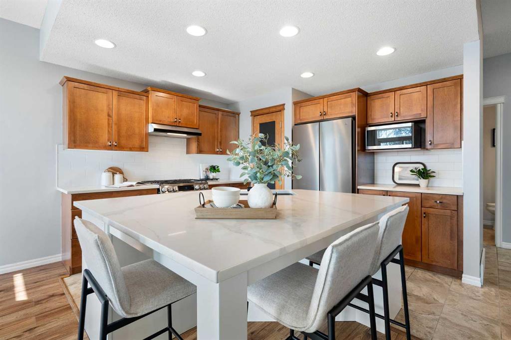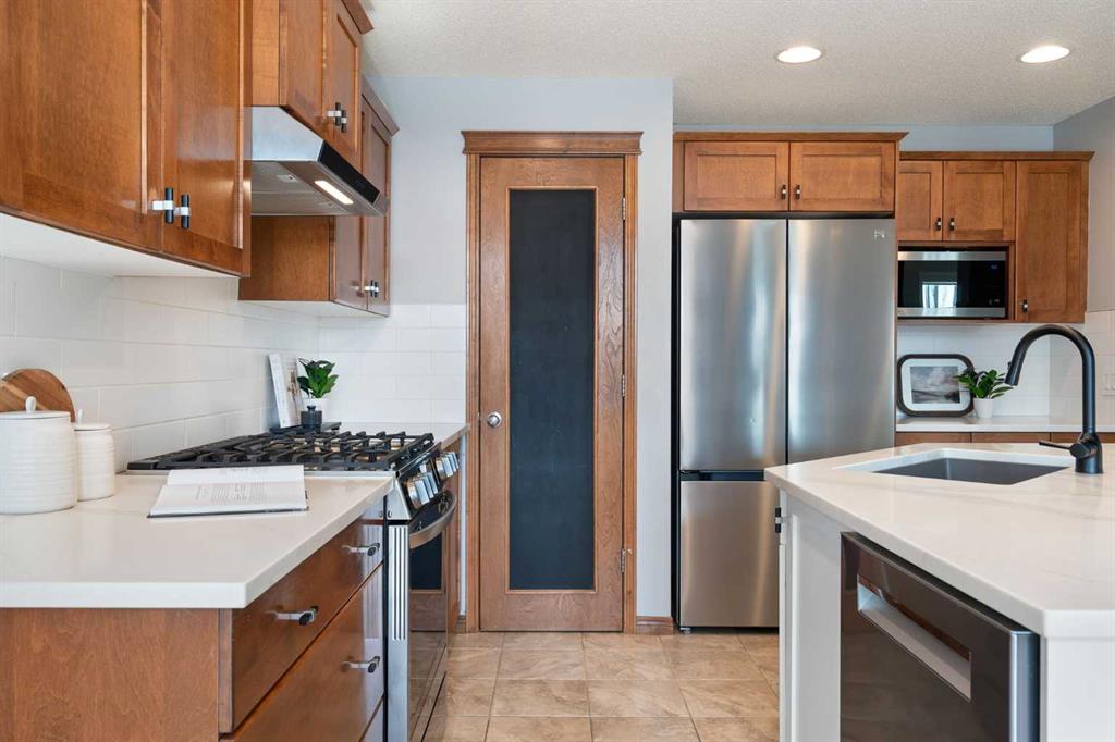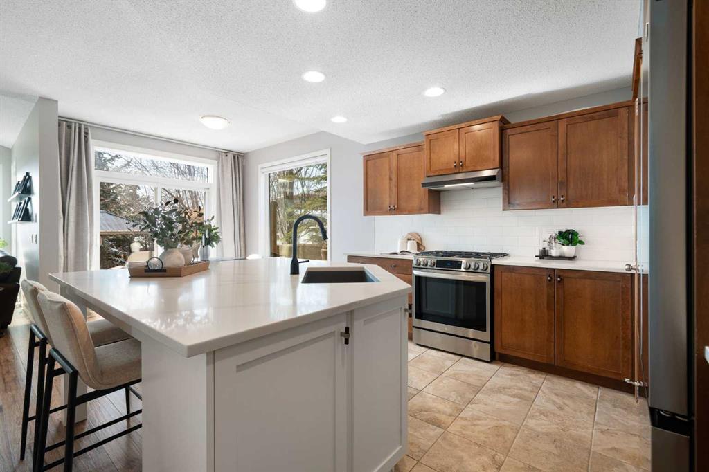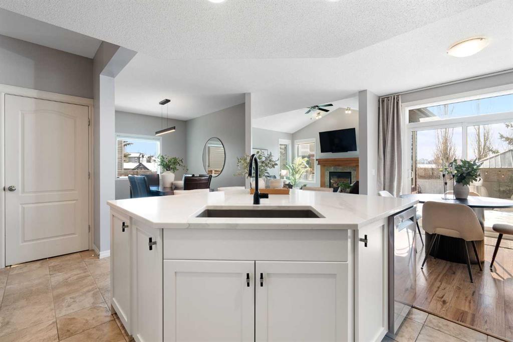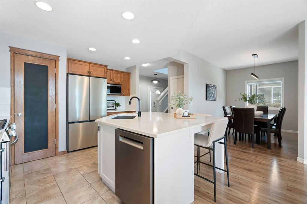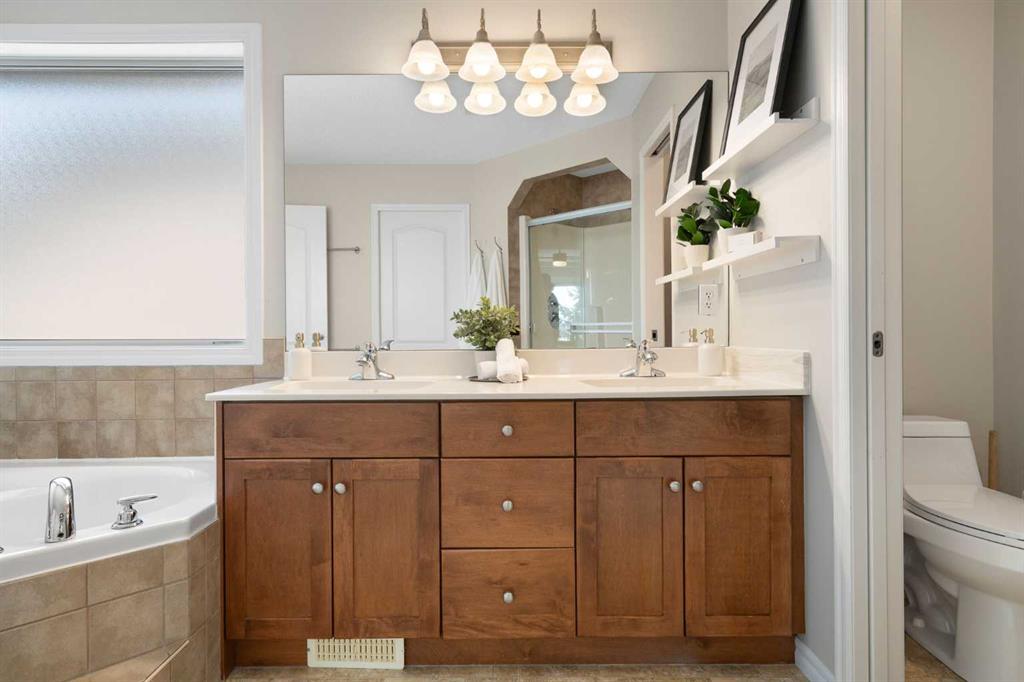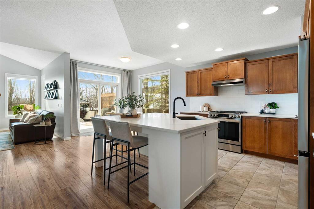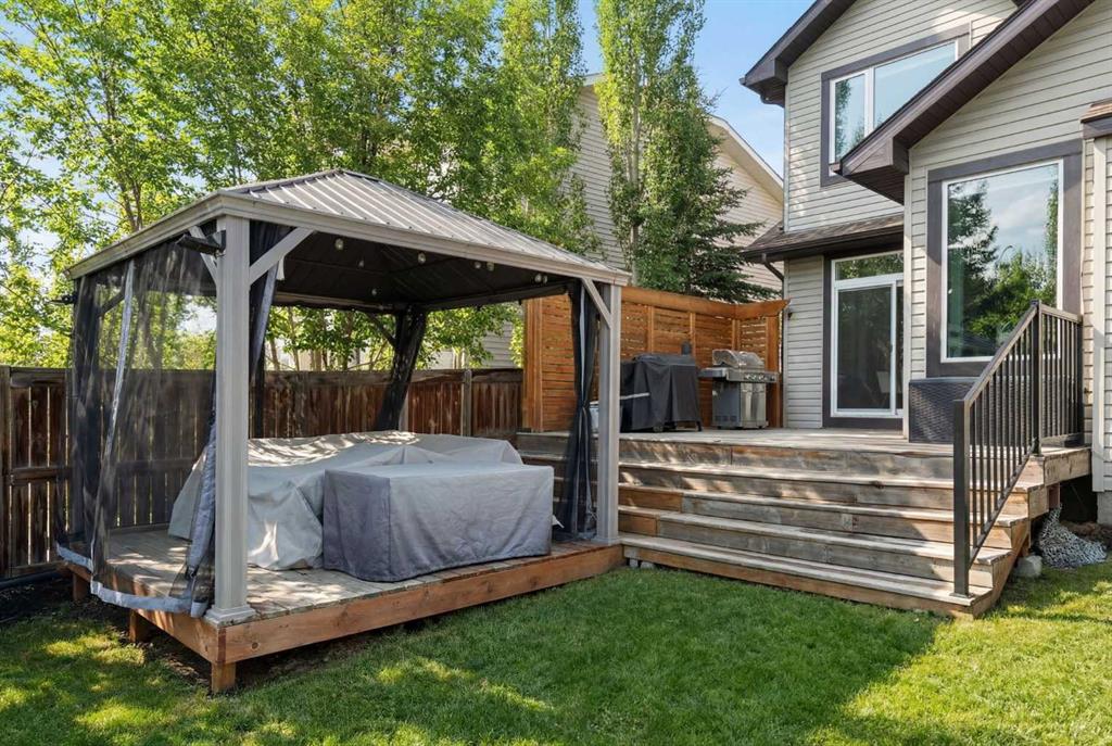 Hello, Gorgeous! Welcome to 142 Coopers Bay SW in Airdrie, located in the highly sought-after community of Coopers Crossing. This fully developed two-storey home offers over 2,200 sq ft above grade, 4 bedrooms, and 3.5 bathrooms, providing a functional layout suited for family living. The main floor features a spacious living room with a gas fireplace and large windows for natural light. The kitchen has been updated with a renovated island, countertops, and backsplash, along with newer appliances including a stove (2024), dishwasher (2025), hood fan (2025), washer and dryer (2025), and refrigerator (2026). A dining area, breakfast nook, main-floor laundry, and 2-piece bathroom complete this level. Upstairs includes a primary bedroom with a walk-in closet and 5-piece ensuite featuring dual sinks, a soaker tub, and separate shower. Two additional bedrooms, a 4-piece bathroom, and a bonus room provide additional living space. The fully developed basement includes a recreation room with a second gas fireplace, a fourth bedroom, a 3-piece bathroom, and storage space. Additional features include air conditioning, a heated double attached garage, and added insulation in the attic and garage. Situated on a large south facing pie-shaped lot in a quiet cul-de-sac, the property offers a fully fenced yard with a deck and is located close to parks, pathways, schools, and amenities.