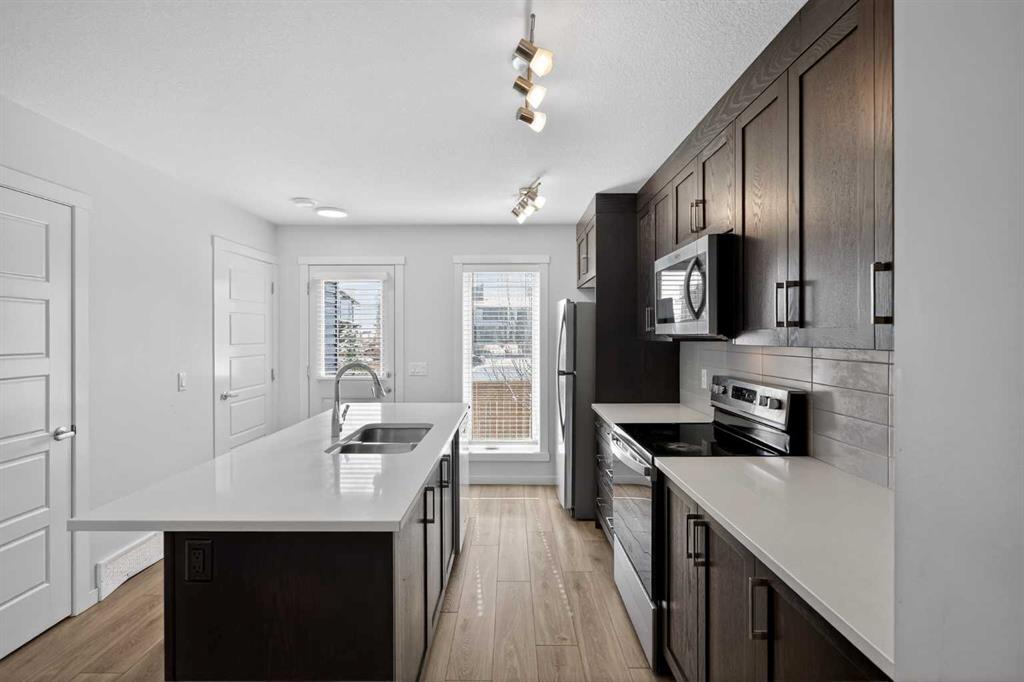Welcome home to this bright and beautifully maintained two-storey townhome in the highly sought-after and vibrant community of Seton, boasting over 1,268 sq. ft. of smart, open-concept living space that perfectly balances everyday comfort with an unbeatable lifestyle. Step inside and be greeted by gorgeous flooring and an abundance of natural light leading to the thoughtfully designed kitchen featuring a central island with a breakfast bar—ideal for casual dining, meal prep, or entertaining. The kitchen flows seamlessly into the airy living and dining spaces, complemented by a convenient main-floor powder room. Unlike many units in the area, this townhome features a fully fenced backyard that backs directly onto a peaceful small greenspace, providing added privacy and a beautiful view while you host summer BBQs or unwind with an evening drink. Upstairs, the layout truly shines with two generously sized primary suites, each boasting its own private ensuite bathroom, making this dual-master setup fantastic for roommates, guests, or simply enjoying your own dedicated space. You’ll also find smartly located upper-level laundry with a stackable washer and dryer, plus extra linen storage. Enjoy the perks of low-maintenance condo living with professional management and one assigned parking stall. Seton’s world-class amenities are right at your doorstep, as you are just minutes from the South Health Campus, fantastic shopping and dining, and the massive Brookfield Residential YMCA, plus "The Block" nearby offering pickleball, splash parks, and skating, making this a true four-season playground right in your neighbourhood. This is modern, turn-key living in one of Calgary's most dynamic communities, so don't miss out—book your private showing today!