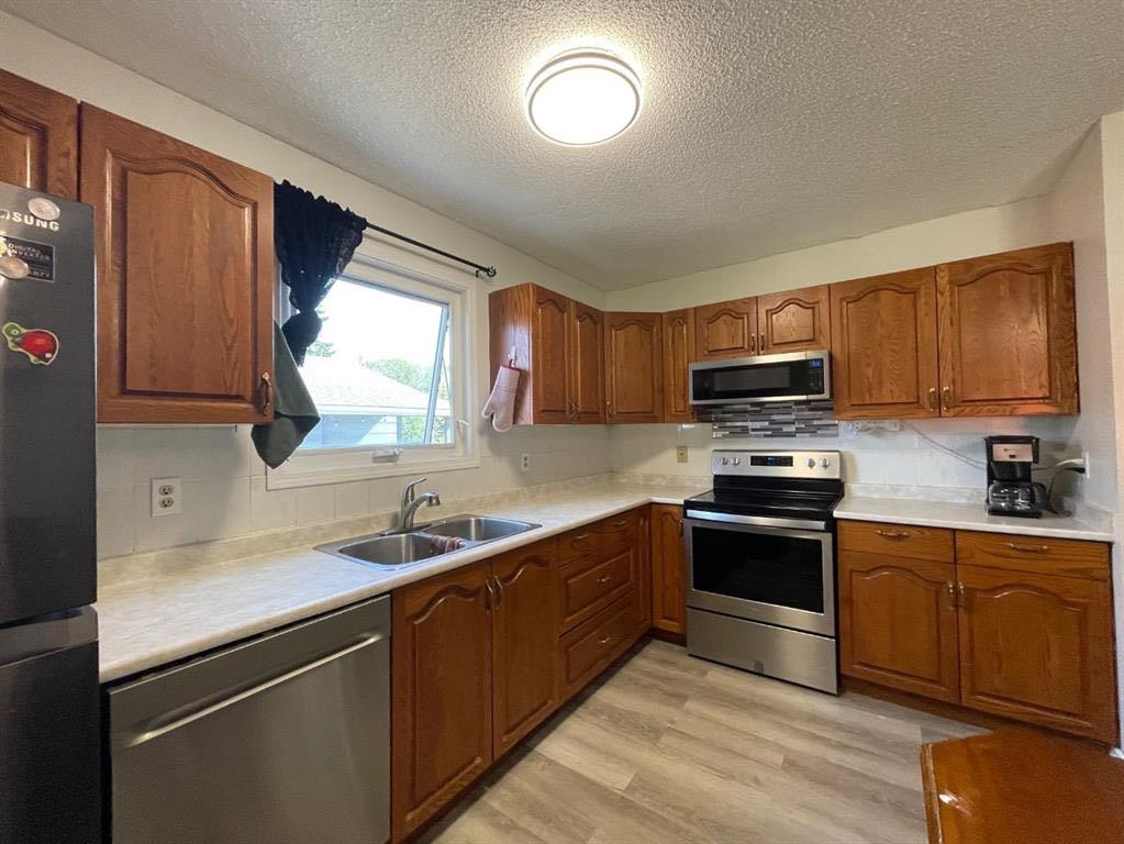 1040 square foot bungalow with 5 bedrooms and 2 full bathrooms, an ideal home for a growing family. The main floor features the kitchen, dining area, and living room, all conveniently located on one side, perfect for entertaining and family gatherings. On the other side, you'll find three bedrooms. The main bathroom is thoughtfully designed with a separate vanity and tub, providing privacy from the toilet and convenient direct access from the primary bedroom. The fully developed basement significantly expands your living space, boasting two additional bedrooms, a large family room ideal for movie nights or a play area, ample storage, and a dedicated laundry area. A 3-piece bathroom completes the lower level. Step outside to a fenced backyard, providing a safe and private space for kids and pets to play. The back deck is covered by an extended roof overhang, perfect for enjoying your morning coffee or evening barbecues, rain or shine. Location is key as it's just a stone's throw from the public elementary school and a few blocks from both the public junior and senior high schools, making the morning commute a breeze. Call to book your viewing today!