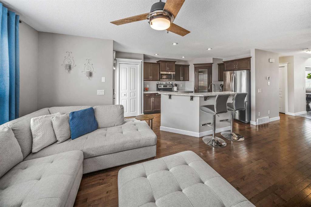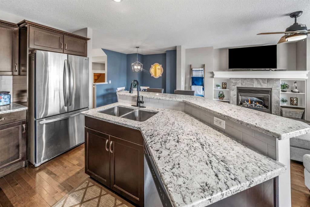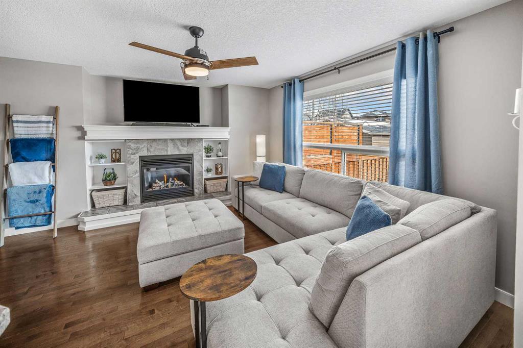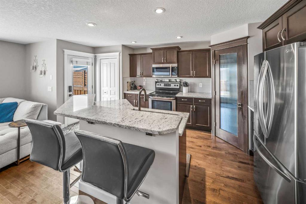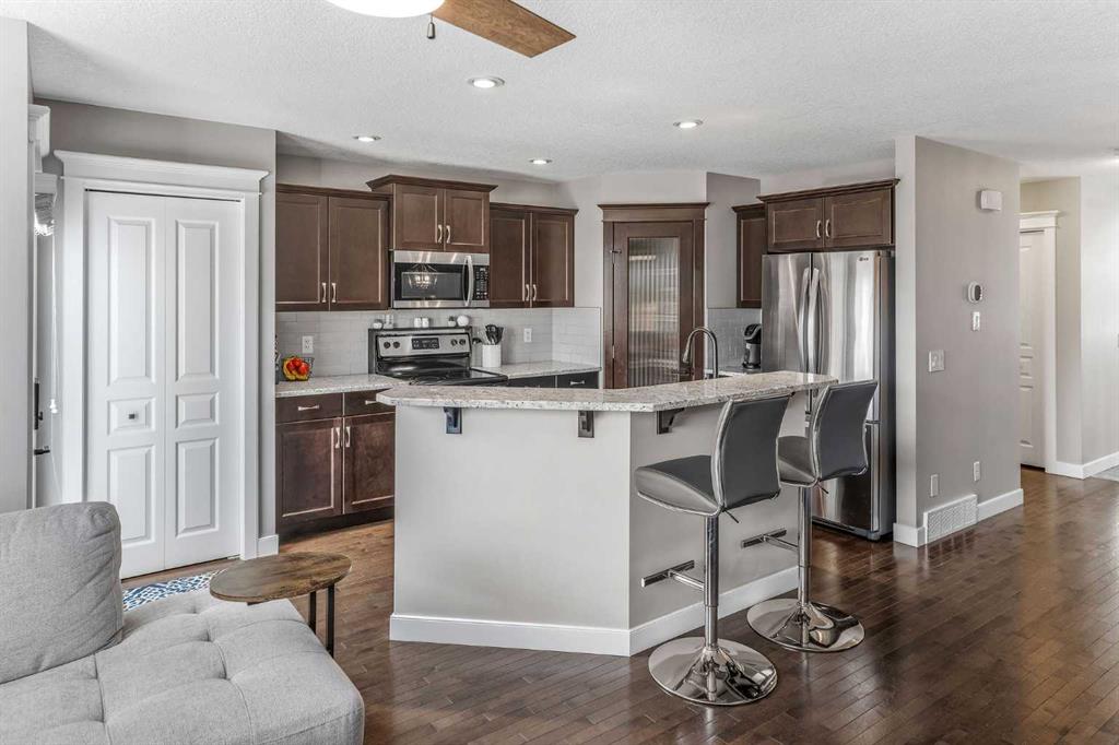 OPEN HOUSE SAT. APRIL 4TH 11AM-2PM!! STUNNING HOME IN DESIRABLE RAVENSWOOD | CENTRAL AC, DOUBLE GARAGE, PLUS 3RD CAR PARKING! Welcome to this beautifully maintained open-concept two-storey home, ideally situated on a quiet street in the highly sought-after community of Ravenswood. Flooded with natural light, this home offers a perfect blend of comfort, style, and functionality for modern living. The main floor features rich hardwood flooring, a versatile den ideal for a home office, convenient main floor laundry, and a stylish powder room. The heart of the home is the kitchen, complete with richly stained cabinetry, a stainless steel appliance package, and thick stone countertops that extend seamlessly onto the island - perfect for entertaining. The inviting family room showcases a cozy fireplace and flows effortlessly into the dining area, creating a warm and welcoming space. Upstairs, you’ll find three spacious bedrooms, including a bright primary retreat with a walk-in closet and private ensuite bath. An additional full bathroom completes the upper level. Step outside to enjoy your private backyard, featuring a newly extended deck - ideal for relaxing or hosting guests. The double garage is great for those looking for shop space, offering a 240V plug for tools or electric vehicle charging, along with a natural gas line. An additional third parking stall adds even more convenience. The undeveloped basement provides excellent future potential, with mechanical thoughtfully tucked away and rough-in plumbing already in place for a future bathroom. Located just steps from parks, walking paths, schools, and a wide range of amenities, this home offers exceptional value in a family-friendly community. Central AC, fully landscaped, Sunny SE facing backyard, and much more A fantastic opportunity you won’t want to miss!