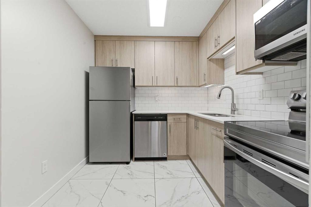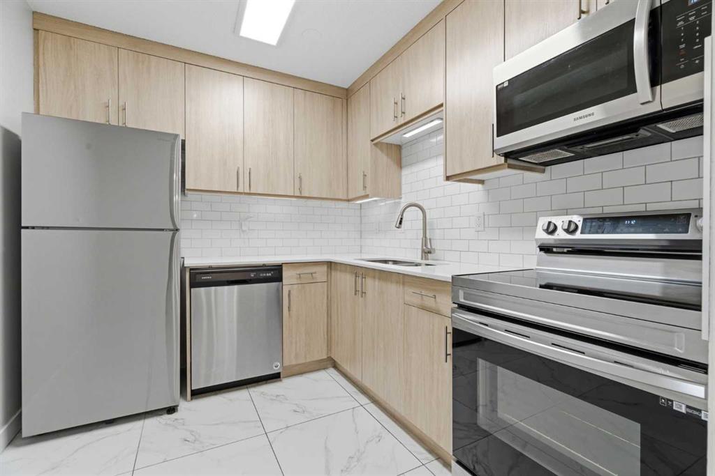 2 BEDROOMS | 1 BATHROOM | 835 SQFT | TOP FLOOR | FULLY RENOVATED | LARGE PATIO | ASSIGNED PARKING | IMMEDIATE POSSESSION | Welcome to this beautifully renovated top-floor condo in the established community of Southwood, offering incredible value and a turnkey, move-in-ready opportunity. With a bright and functional layout, this vacant unit is perfect for first-time buyers, investors, or anyone looking for affordable living in a prime location. Step inside to discover a thoughtfully updated interior featuring wide plank laminate flooring, upgraded tile, and fresh neutral paint throughout. The spacious living room is warm and inviting, complete with a tiled fireplace feature wall that adds character and charm. The open dining area with feature pendant flows seamlessly into the stunning kitchen, showcasing ceiling height cabinetry, quartz countertops, a classic subway tile backsplash, stainless steel appliances, and under-cabinet lighting, perfect for both everyday living and entertaining. The primary bedroom includes a walk-in closet with shelving for optimal organization, while the second bedroom provides flexibility for guests, a home office, or additional living space. The fully renovated bathroom features a quartz vanity with dual sinks and upgraded fixtures, creating a modern and functional space. Step outside to your oversized 17’ x 6’ private patio, complete with an additional outdoor storage area making it an ideal place for enjoying fresh air or relaxing in your own outdoor retreat. You’ll also appreciate the convenience of the outside storage unit in addition to the storage inside the unit. Enjoy the convenience of an assigned parking stall just steps from your door. The complex offers excellent amenities including a fitness centre, party room, visitor parking, tennis and basketball courts, and a playground. As well, the building is well managed with a healthy reserve fund. Located just minutes from Anderson LRT Station, Southcentre Mall, Fish Creek Park, Glenmore Reservoir, and with public transit right outside the complex, this is truly a location that offers both convenience and lifestyle. This is your chance to own a fully renovated, stylish home at an unbeatable price. Why rent when you can own? Book your showing today! Photos have been virtually staged.