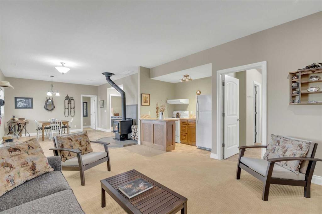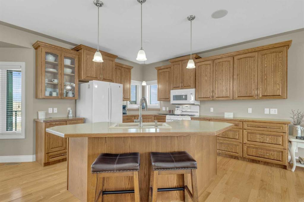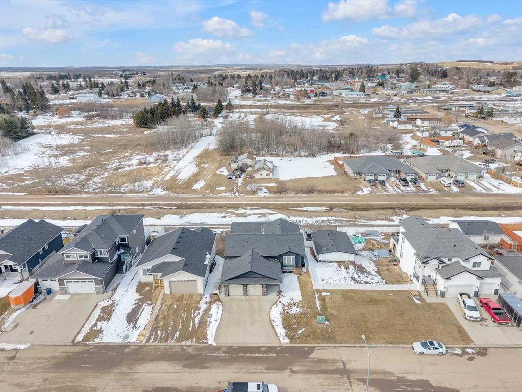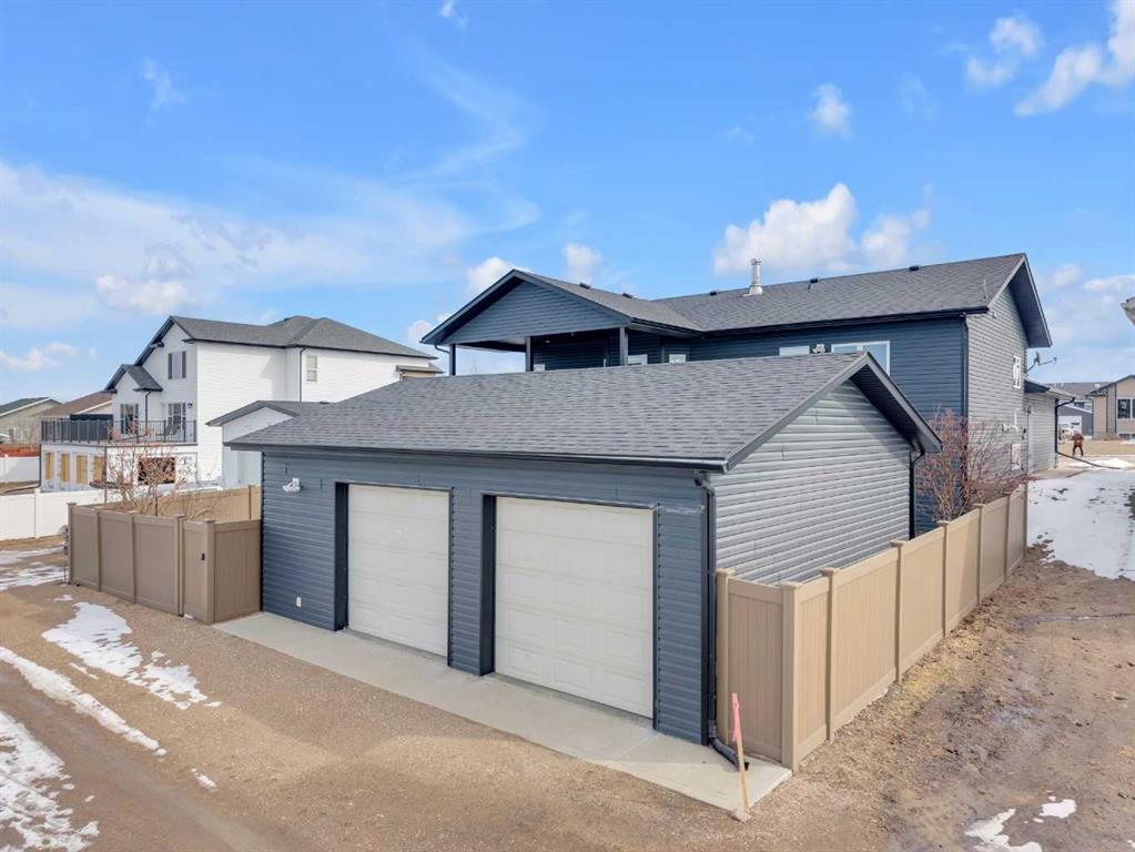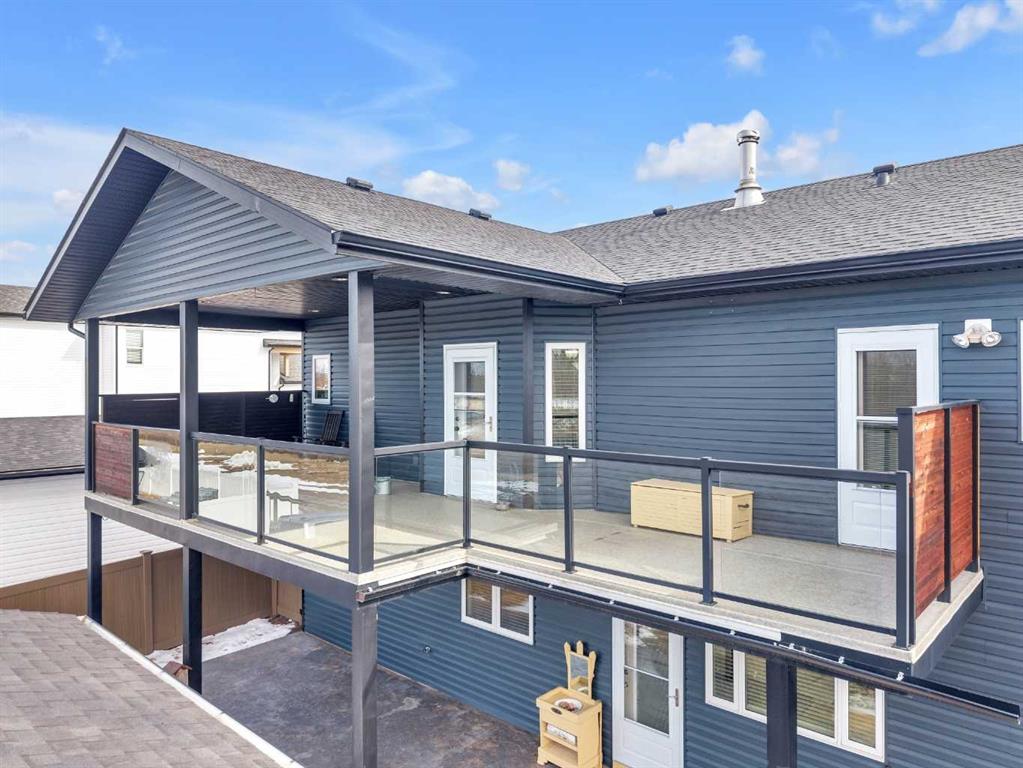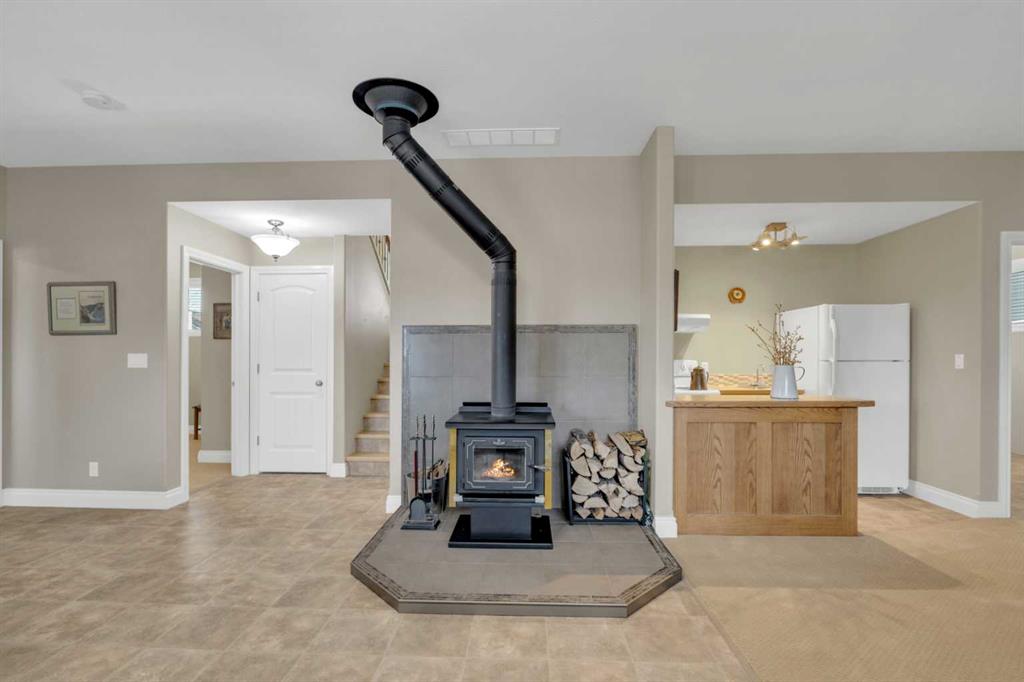 Custom-built executive bi-level in Delburne, just minutes from Fawn Meadows Golf Course. Built in 2010 and exceptionally well maintained, this home offers quality construction, a functional layout and a turnkey presentation with 9’ ceilings on both levels adding to the sense of space throughout. Main floor features hardwood flooring and a bright, open-concept living space with a gas fireplace adding warmth and ambiance. The kitchen includes a large island, gas range and ample cabinetry, with a spacious dining area that opens onto a private, duradek-covered 12x23 deck—partially covered and ideal for enjoying the west-facing yard and evening sun. The primary bedroom also offers direct access to the deck, along with a walk-in closet and a 5-piece ensuite with dual sinks, tiled shower and soaker tub. A den/home office and 2-piece bath complete the main level, offering flexibility for remote work or additional living space. The fully developed walkout basement includes in-floor heat, a large family/rec space with wet bar, wood-burning stove, two additional bedrooms, full bath and laundry. Thoughtful storage throughout, including multiple linen closets and extended under-stair space, adds to the home’s functionality. Walk out to a stamped concrete patio and a beautifully landscaped, vinyl-fenced yard. Heated attached garage plus a 24x30 detached shop with 220 power and in-floor heat—perfect for storage, projects or hobbies, with space to accommodate both vehicles and workspace needs. A well-cared-for property that shows beautifully.