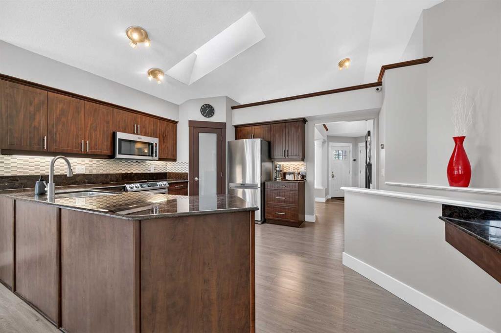 *** OPEN HOUSE SUNDAY 12-2PM *** What a SPECTACULAR property and AMAZING opportunity here! Very rare 1500 sqft bungalow with 3 bedrooms up plus a den/office. Newer vinyl floors though the main with upgraded appliances, elegant kitchen with gorgeous granite counters and rich cabinetry. Large living area with TV and wall mount that stay is elegantly warmed by the 3-sided fireplace adjacent to the dinning area that offers access to the large vinyl deck where you’ll enjoy the west facing exposure and gorgeous sunsets. Primary suite hosts a generous walk-in closet and 4 piece ensuite, the 2 other rooms are both quite big a share another full bath. The lower walk-out level offers 2 more spacious bedrooms, an additional office or flex space and another large living space recreational space. Windows are 15 years new, Roof in 2008, Furnace in 2022, Water is 5 years young, fully wired for sound with an incredible customized hard wired alarm system. Large garage, insulated and drywalled, painted and customized with cabinetry, shelving and storage. Outside is an exposed aggregate walkway from the front to the back with a lower-level patio underneath the deck. Fully zero scaped for no maintenance, beautiful rock arrangements, raised flower beds and a soothing corner water feature. Out front we have quaint front porch to enjoy the sunrise, a new garage door, zero scaped continues with rock gardens and flower beds. No detail is spared in this incredibly well-maintained home; the pride of ownership is extremely evident with its unique customization and thoughtful finishing. Book a tour today and make it yours!