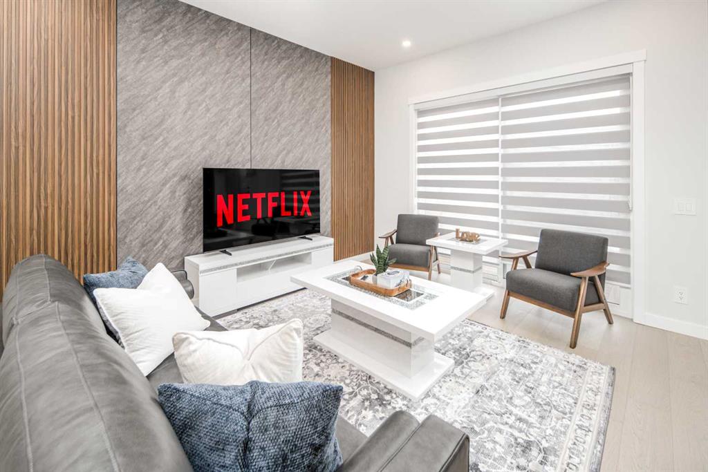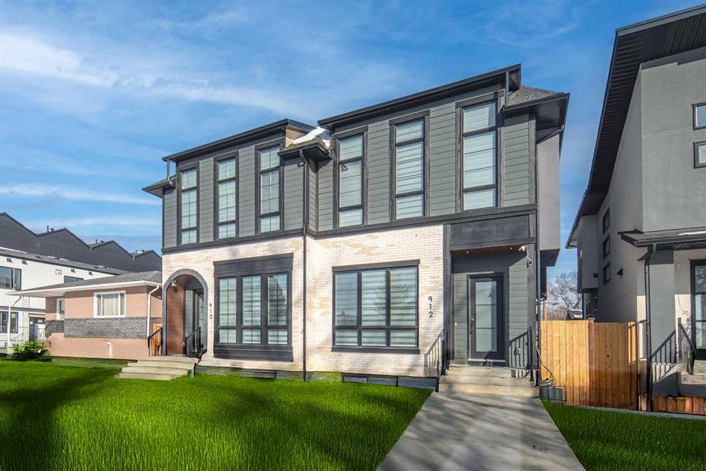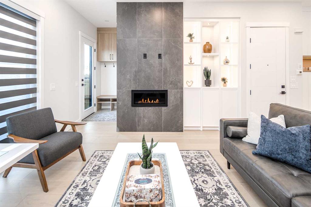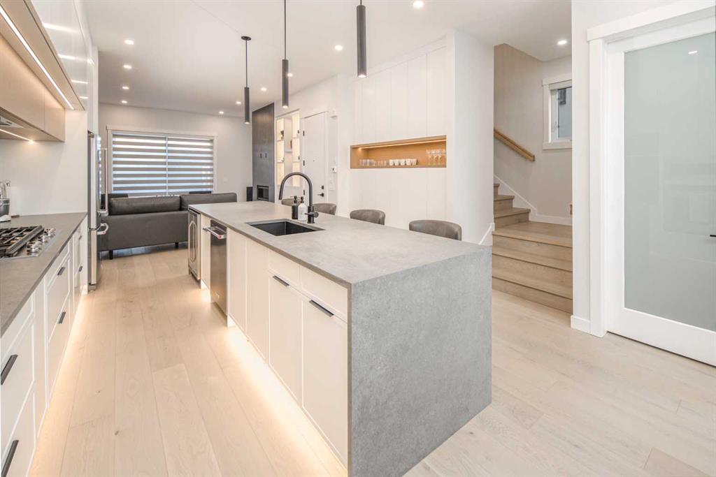 This luxury semi-detached infill combines refined design, thoughtful layout, and strong income potential with a fully legal 2-bedroom basement suite (city approved), making it well-suited for both end users and investors in today’s market. The main floor is designed to feel open and elevated, featuring 10-ft ceilings that enhance natural light flow and create a more spacious, airy environment compared to standard builds. A bright front dining area is framed by large windows, offering a welcoming space for both daily living and entertaining. At the center of the home, the chef-inspired kitchen showcases natural stone countertops, full-height custom cabinetry, a waterfall island with oak accents, LED feature lighting, and a premium appliance package—delivering both durability and a high-end finish. The adjacent living room is anchored by a floor-to-ceiling tiled gas fireplace with custom built-ins, creating a warm yet modern focal point. A dedicated main floor office provides flexibility for working from home, while the rear mudroom with built-in storage offers practical access to the backyard and garage. Upstairs continues with 9-ft ceilings, maintaining a consistent sense of space throughout. A versatile bonus room at the top of the stairs functions well as a secondary lounge, media area, or workspace. The primary suite is elevated by a vaulted ceiling, adding volume and a more luxurious feel to the retreat. The ensuite is thoughtfully designed with a double vanity, soaker tub, glass-enclosed shower, and in-floor heating, delivering everyday comfort during Calgary’s colder seasons. Two additional well-sized bedrooms, a full bathroom, and a conveniently located upper laundry room complete the level. The basement is built with 9-ft ceilings and features a fully finished legal 2-bedroom suite with a separate entrance. Designed to maximize livability, the suite includes a bright open living area, a modern kitchen, and a full bathroom, offering an excellent opportunity for rental income or multi-generational living without compromising comfort. Located in the established inner-city community of Renfrew, this home offers quick access to downtown (approximately 5 minutes) and is within close proximity to the amenities of Bridgeland, including popular cafes, restaurants, and local shops. With convenient connections to Edmonton Trail, 16 Avenue, and Deerfoot Trail, commuting and daily travel are efficient and accessible.
