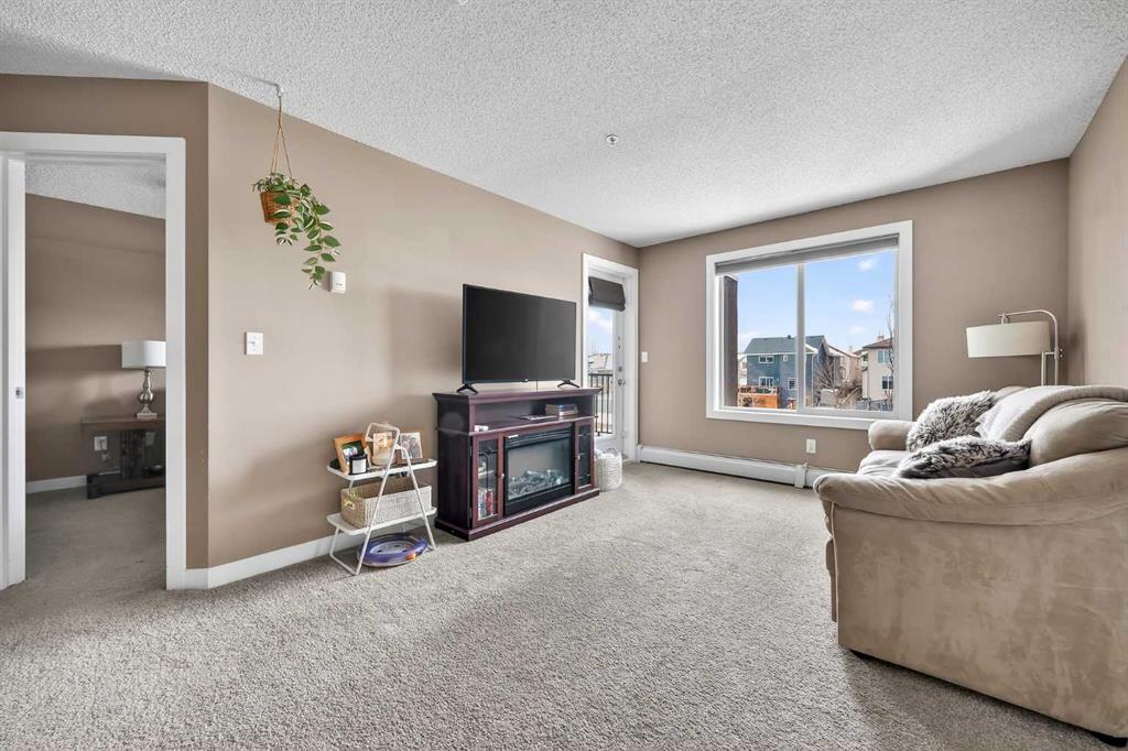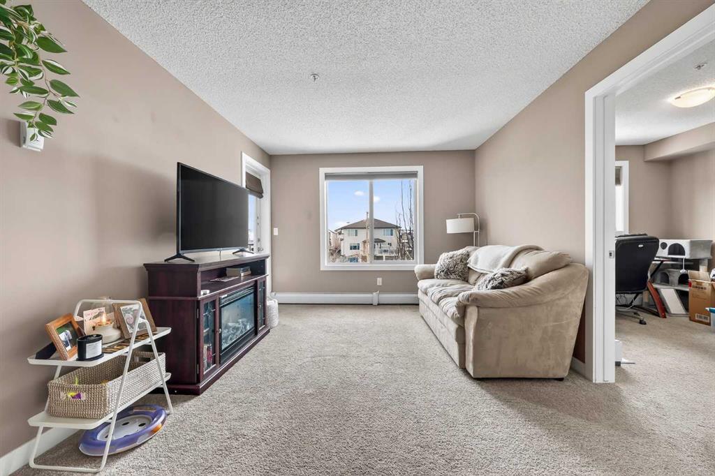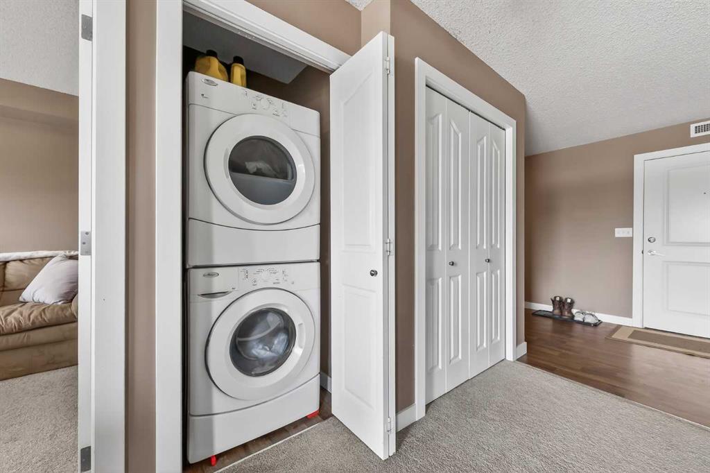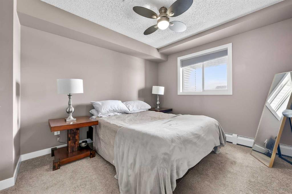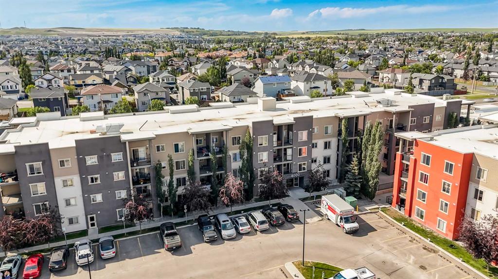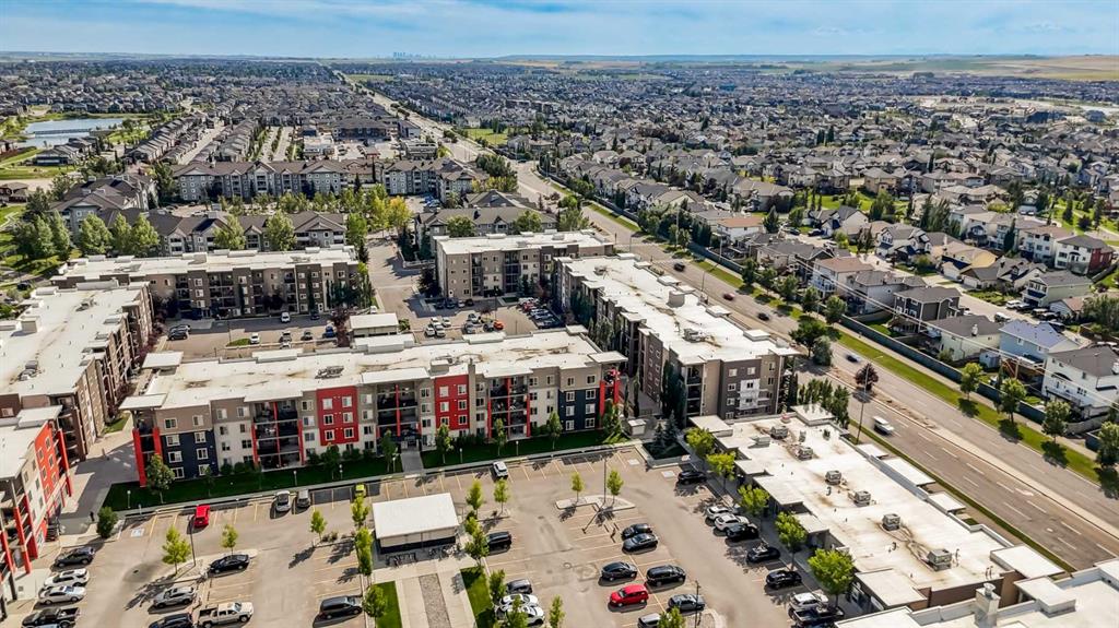 Welcome to your new home at Creekside Village in the heart of downtown—a spacious west-facing 2-bedroom, 2-bathroom condo with a versatile den designed for modern living. Perfect for couples, small families, or professionals, the den can easily be used as a home office, dining nook, or guest space, adapting to your lifestyle. Step inside to a bright open-concept layout with a wide entrance and a generous living/dining area—ideal for entertaining or relaxing. The upgraded kitchen features granite/quartz countertops, stainless steel appliances, ample cupboard space, and a breakfast bar. A separate in-suite laundry room provides added convenience, while the primary bedroom offers a private 4 piece en-suite with granite vanity and soaker tub. The second full bathroom includes a soaker tub and matching granite vanity, and both bedrooms feature large windows and ample closet space for natural light and functionality. Enjoy your morning coffee or evening wind-down on the covered patio and take advantage of 2 titled underground parking stalls for year-round security and ease. Located in a vibrant community in Downtown Airdrie, this condo places everything at your fingertips: Midtown Shopping Square, grocery stores (Sobeys), restaurants, coffee shops, salons, medical clinics, pharmacies, day care, yoga/fitness centers, playgrounds, schools, and parks—all just a short walk away.