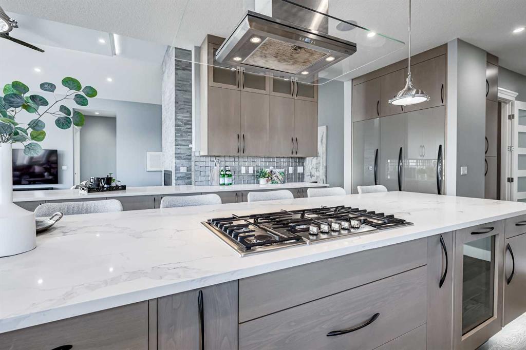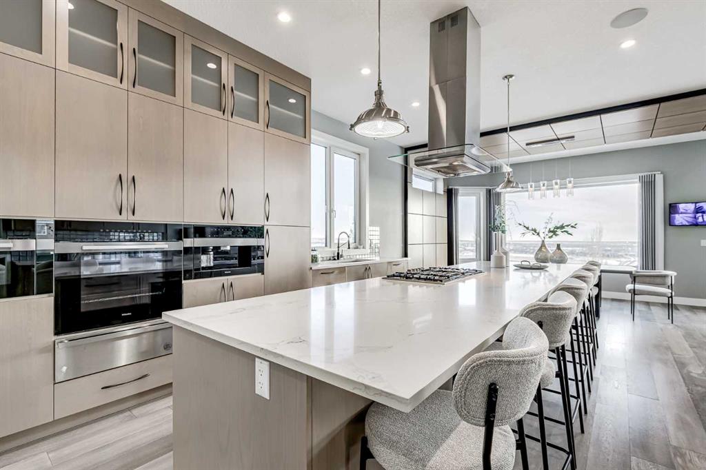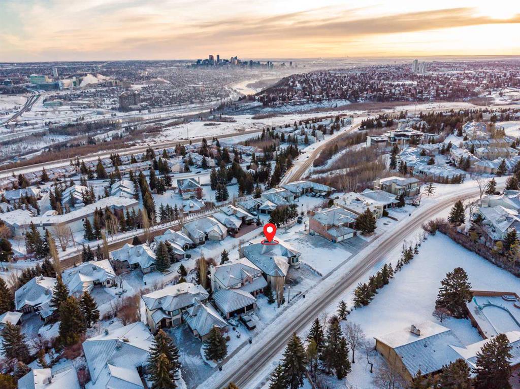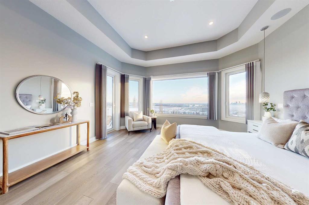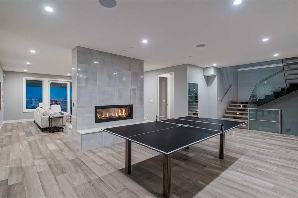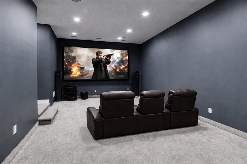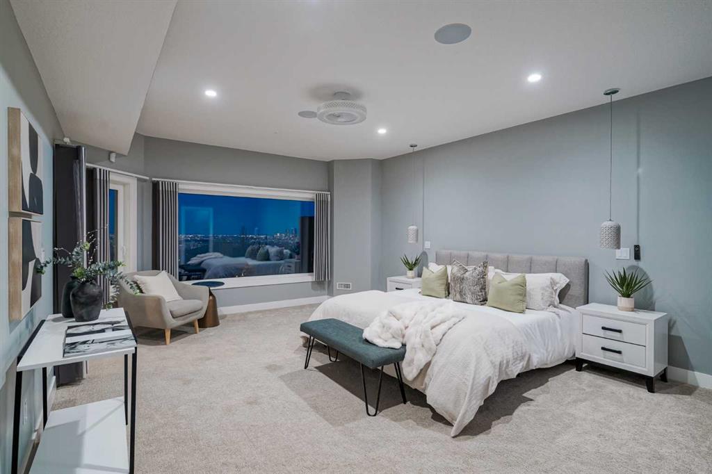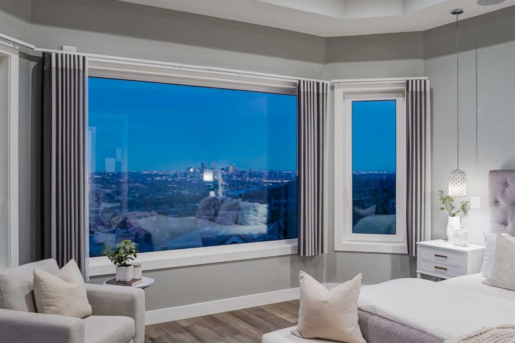 Perched high above the city in the prestigious community of Patterson, this custom luxury bungalow offers unobstructed, panoramic views of downtown Calgary and the skyline from all three fully developed walkout levels. Architecturally designed and built to a high standard, the home blends refined design, functionality, and long-term livability in a private, elevated setting just minutes from the city core. The main level is designed for sophisticated single-level living, with expansive windows that flood the home with natural light and frame breathtaking city views. The open-concept living and dining areas are anchored by a striking see-through gas fireplace, creating warmth and architectural interest while maintaining uninterrupted sightlines. Vaulted and tray ceilings enhance the sense of scale, complemented by wide-plank engineered hardwood flooring and timeless finishes. The chef-inspired kitchen features premium cabinetry, a large central island, high-end appliances, and seamless flow into the dining area, ideal for entertaining. A fully equipped spice kitchen provides additional prep space and storage. The primary suite is a private retreat with panoramic views and a spa-inspired ensuite featuring heated floors, a deep soaker tub, steam shower, and walk-in closet. A private office or den, powder room, breakfast nook, and functional mudroom with direct garage access complete this level. The first lower level is fully developed and walkout, offering excellent flexibility while maintaining the same level of finish. This level includes a spacious recreation room, family lounge with city views, a dedicated home gym with custom flooring and sliding glass barn doors, two generously sized bedrooms, beautifully finished bathrooms, a full laundry room, and direct outdoor access. The lowest level is designed for entertainment and guests, featuring a large media and theatre room with golf simulator capability, a kitchenette or wet bar, additional bedrooms, a full bathroom, second laundry area, and integrated storage and mechanical spaces. Additional highlights include a heated triple attached garage with exceptional ceiling height allowing for a vehicle lift, epoxy flooring, side wall-mounted openers, and space for up to four vehicles. The home is roughed-in for a future elevator and offers multiple walkout patios and decks with glass railings and gas connections. Integrated audio, smart lighting, premium mechanical systems, and an optional landscaping package further enhance the property. Located in one of Calgary’s most desirable westside communities, Patterson is known for its elevated setting, mature surroundings, city views, and proximity to downtown, parks, and amenities.