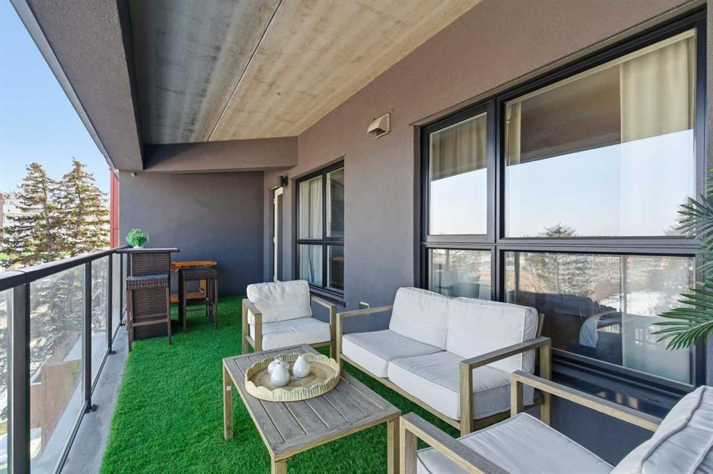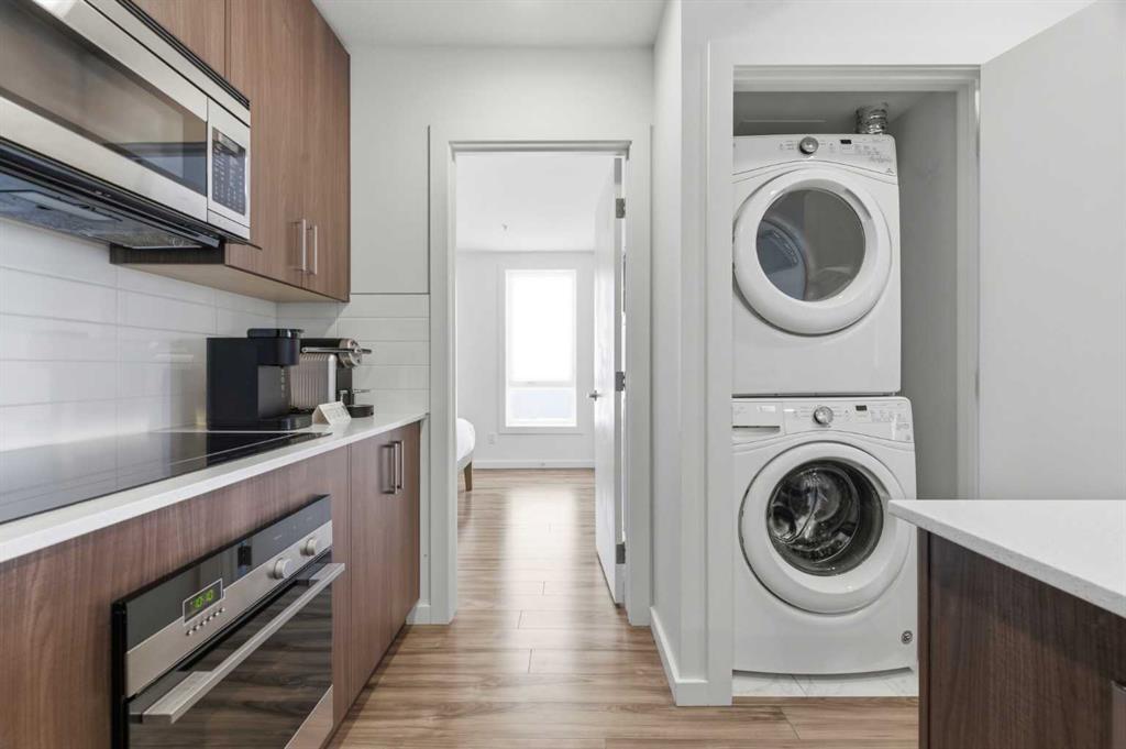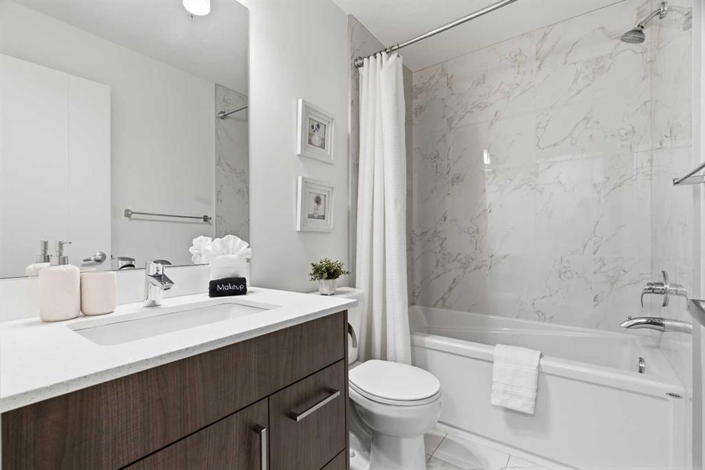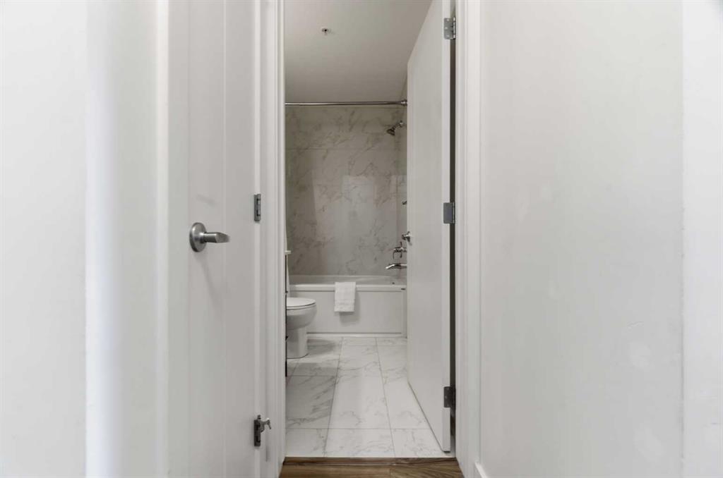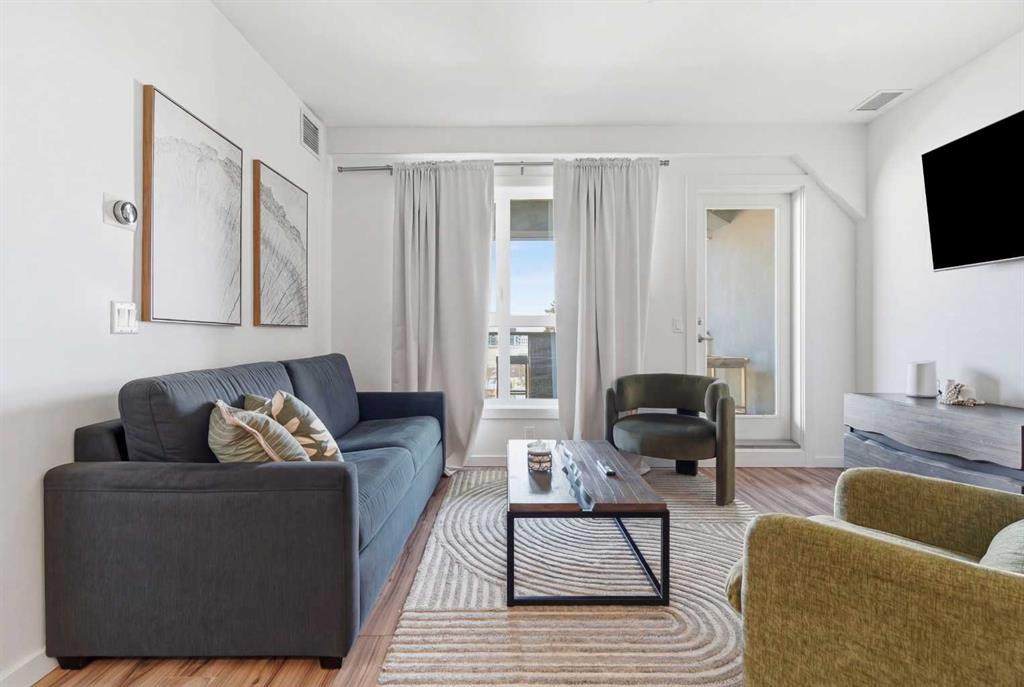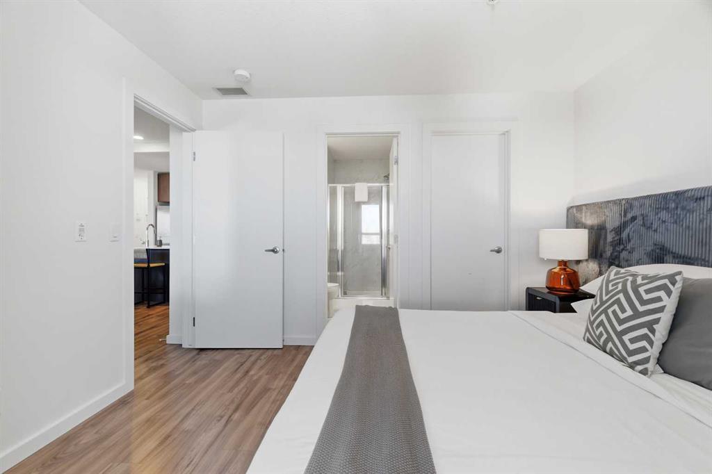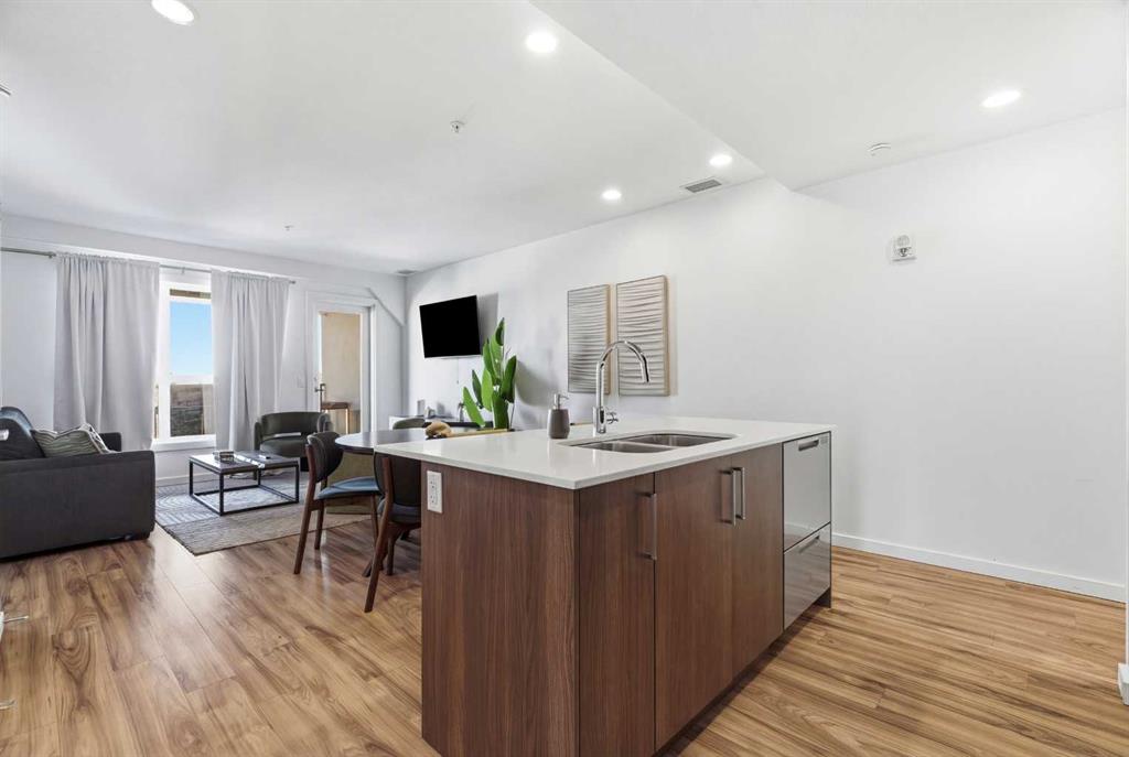 2 BEDROOMS | 2 BATHROOMS | TOP FLOOR CORNER UNIT | 795 SQFT | CONCRETE & STEEL BUILDING | UNDERGROUND PARKING | DOWNTOWN VIEWS | Welcome to this bright top-floor corner unit in the desirable community of Rosscarrock, offering 795 sqft of well-designed living space in a quiet, well-maintained concrete and steel building. With double drywall between units, this home provides exceptional soundproofing and privacy, making it ideal for comfortable condo living. Step inside to an open-concept layout featuring hardwood flooring throughout and central air conditioning for year-round comfort. The modern kitchen is both stylish and functional, complete with quartz countertops, induction cooktop, stainless steel appliances, and a large central island with seating, perfect for entertaining or everyday living. The kitchen flows seamlessly into the dining and living areas, where large windows and a patio door lead to your large private balcony. Enjoy your morning coffee with beautiful sunrise views or unwind while taking in the stunning downtown Calgary skyline. The spacious primary bedroom is filled with natural light and features a walk-in closet and a 4-piece ensuite. A second bedroom offers flexibility for guests, a roommate, or a home office, and is complemented by a 3-piece bathroom. Additional highlights include in-suite laundry, a storage closet, and a well-appointed layout designed for both functionality and comfort. This home also includes a titled underground parking stall, visitor parking, and 24-hour security for added peace of mind . The building is clean, quiet, and ideally located within walking distance to restaurants, 17th Avenue, the C-Train, grocery stores, shopping, schools and parks. With easy access to downtown and a short drive to Westhills Shopping Centre, this location offers the perfect balance of convenience and lifestyle. Whether you're a first-time buyer, investor, or looking for a great AirBnB opportunity, this home checks all the boxes. Book your showing today!