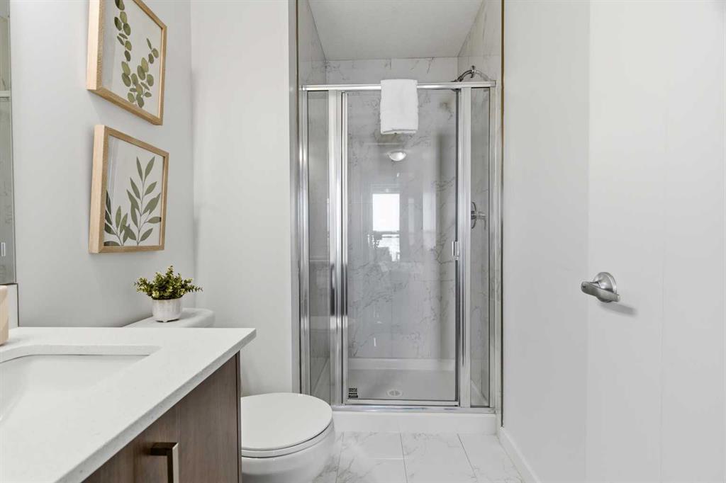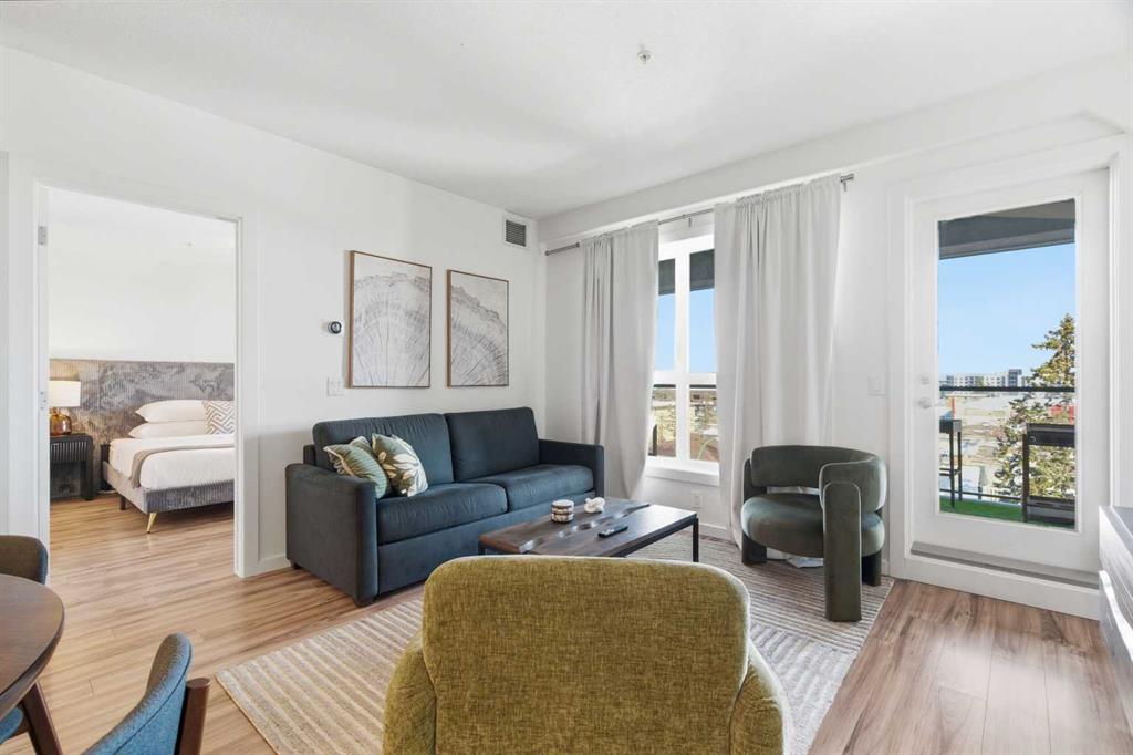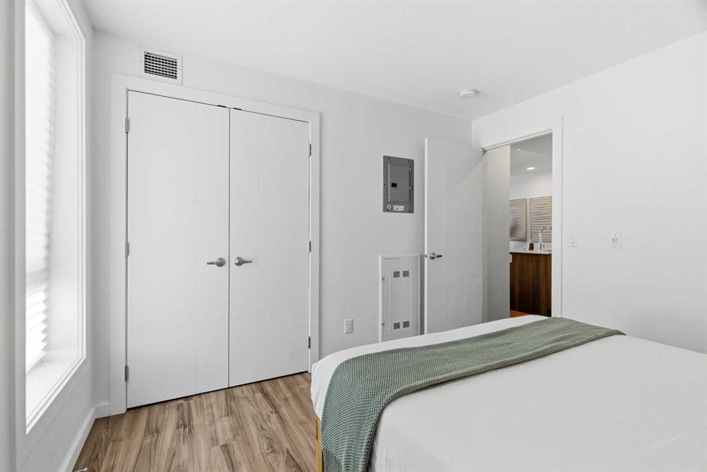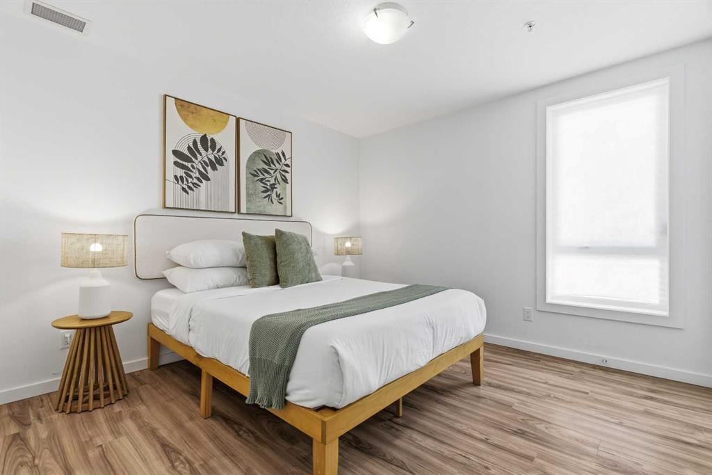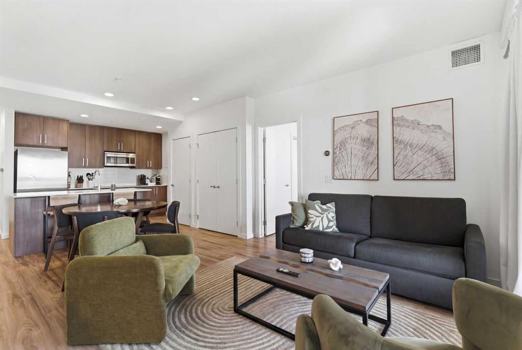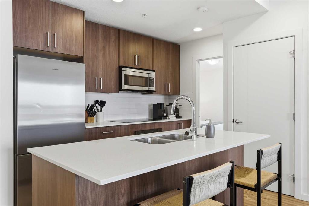 2 BEDROOMS | 2 BATHROOMS | TOP FLOOR CORNER UNIT | 795 SQFT | CONCRETE & STEEL BUILDING | UNDERGROUND PARKING | DOWNTOWN VIEWS | Welcome to this bright top-floor corner unit in the desirable community of Rosscarrock, offering 795 sqft of well-designed living space in a quiet, well-maintained concrete and steel building. With double drywall between units, this home provides exceptional soundproofing and privacy, making it ideal for comfortable condo living. Step inside to an open-concept layout featuring hardwood flooring throughout and central air conditioning for year-round comfort. The modern kitchen is both stylish and functional, complete with quartz countertops, induction cooktop, stainless steel appliances, and a large central island with seating, perfect for entertaining or everyday living. The kitchen flows seamlessly into the dining and living areas, where large windows and a patio door lead to your large private balcony. Enjoy your morning coffee with beautiful sunrise views or unwind while taking in the stunning downtown Calgary skyline. The spacious primary bedroom is filled with natural light and features a walk-in closet and a 4-piece ensuite. A second bedroom offers flexibility for guests, a roommate, or a home office, and is complemented by a 3-piece bathroom. Additional highlights include in-suite laundry, a storage closet, and a well-appointed layout designed for both functionality and comfort. This home also includes a titled underground parking stall, visitor parking, and 24-hour security for added peace of mind . The building is clean, quiet, and ideally located within walking distance to restaurants, 17th Avenue, the C-Train, grocery stores, shopping, schools and parks. With easy access to downtown and a short drive to Westhills Shopping Centre, this location offers the perfect balance of convenience and lifestyle. Whether you're a first-time buyer, investor, or looking for a great AirBnB opportunity, this home checks all the boxes. Book your showing today!