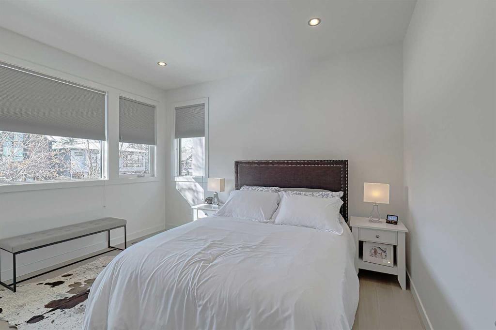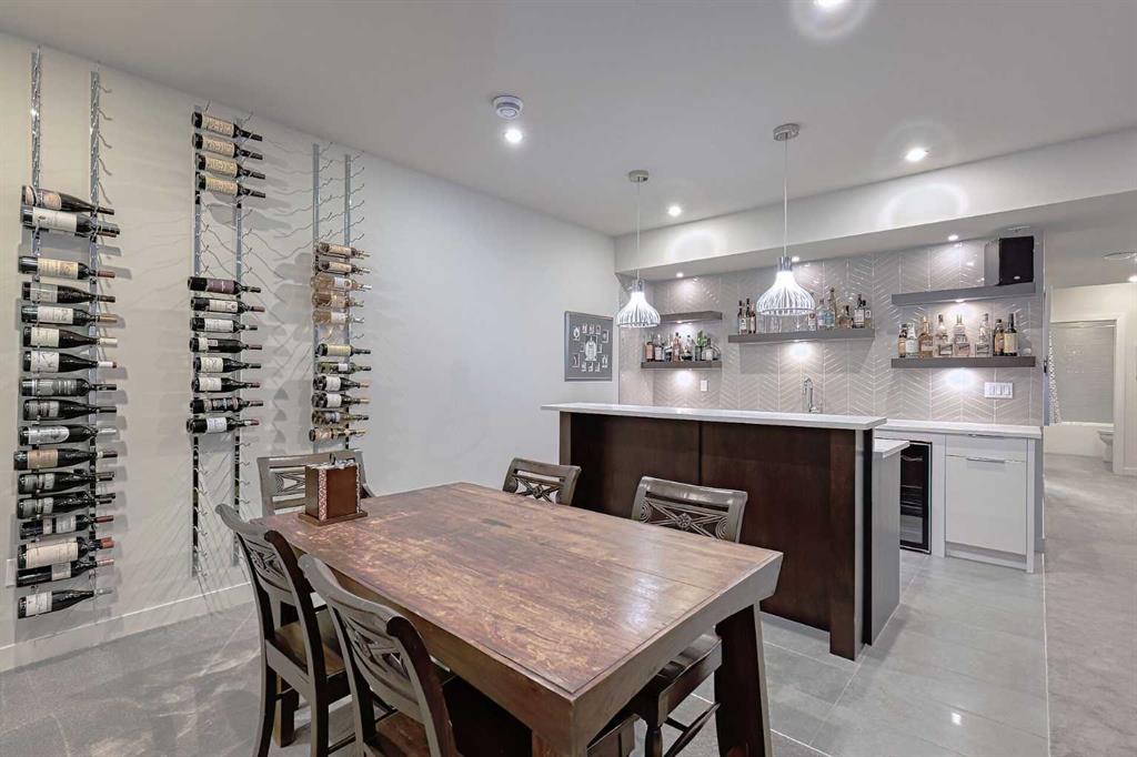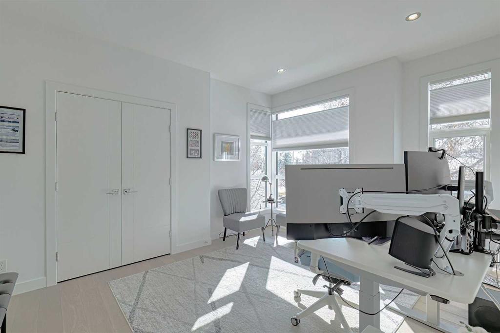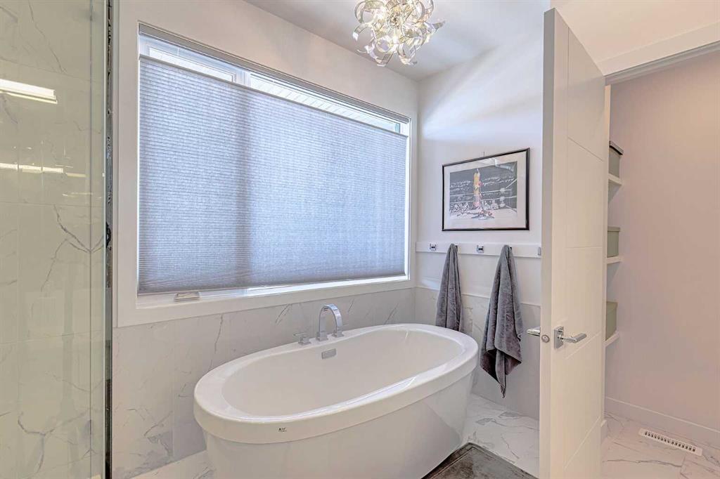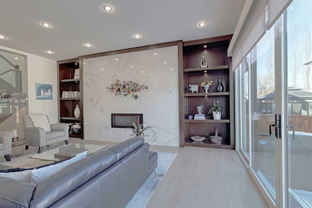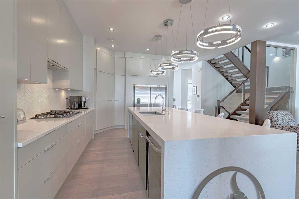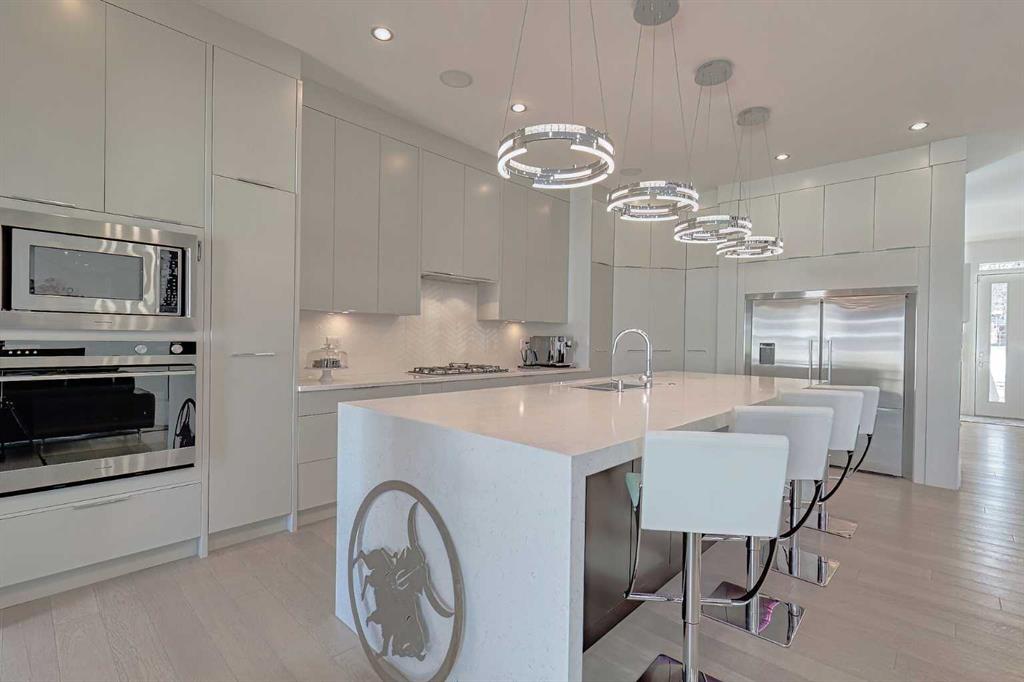 IT’S A LIFESTYLE !! Picture a life where you wake up in a quiet, tree lined SW inner-city neighbourhood, grab a coffee, drive out of your RARE TRIPLE CAR GARAGE and be downtown in minutes. Live the dream in your luxurious modern home and enjoy fun-filled evenings with family and friends in a showpiece GOURMET KITCHEN designed for real cooks. The kitchen features DELUXE FISHER PAYKEL APPLIANCES including gas cooktop, wall oven, microwave, two wine refrigerators and a quiet MIELE DISHWASHER. Note the hidden corner pantry, extra rolling storage and spice racks, and even more storage in the covert cabinets at the front of the island, lit by multi-coloured LED lighting. Imagine laughter echoing through soaring 10’ CEILINGS, and natural sunlight pouring into the OVERSIZED WINDOWS. The upper level with THREE SPACIOUS BEDROOMS includes a relaxing primary bedroom retreat sensibly designed with his and hers walk-in closets. After a tough work week envision finally resting in your king sized bed with tufted blue velvet wall and designer pendant lights or unwinding in the SPA-INSPIRED ENSUITE that feels like a boutique hotel… comes with a freestanding soaker tub, European tiled shower and dual sinks. Also on this floor is a spacious laundry room, and I nearly forgot to mention that the second bedroom has its own walk in closet! So many CUSTOM UPGRADES – lighting, plumbing, built in speakers, and for ease of life, Lucent automated roller blinds in the great room, a mudroom with built in storage, second air conditioner rough in, etc. This Killarney gem is beautifully built with 10’ ceilings that create an airy, open feel, has wide-plank hardwood flooring, custom cabinetry, a massive island for your creative baking pleasure, a great room that brings people together and features a tile surround showcase fireplace. AND the large dining room with stunning floor to ceiling built-in shelving is a show stopper. A large FOURTH BEDROOM and THREE PIECE BATHROOM complete the FULLY DEVELOPED BASEMENT. Imagine movie nights in your own private media lounge where you might also host guests with a wine or whiskey tasting at your fancy wet bar, a lower level made for memories. Check out the garage with new, cutting edge steel cabinets and polyaspartic flooring (tough as nails, but breaths better than epoxy). A fabulous, private back yard with artificial turf gives you a near entirely MAINTENANCE FREE FRONT and BACK YARD with ALUMINUM PERGOLA WITH POWERED LOUVRES and lots of space for your patio furniture and outdoor fire pit. There are plenty of entertaining areas inside and outside this opulent home. Minutes to downtown, transit, parks, amenities and the Shaganappi Golf Course; golf in summer or cross country ski and snow shoe in winter. The Killarney Aquatic Recreation Centre is also just blocks away. This magnificent detached home blends contemporary design with everyday comfort – where modern luxury meets everyday ease.